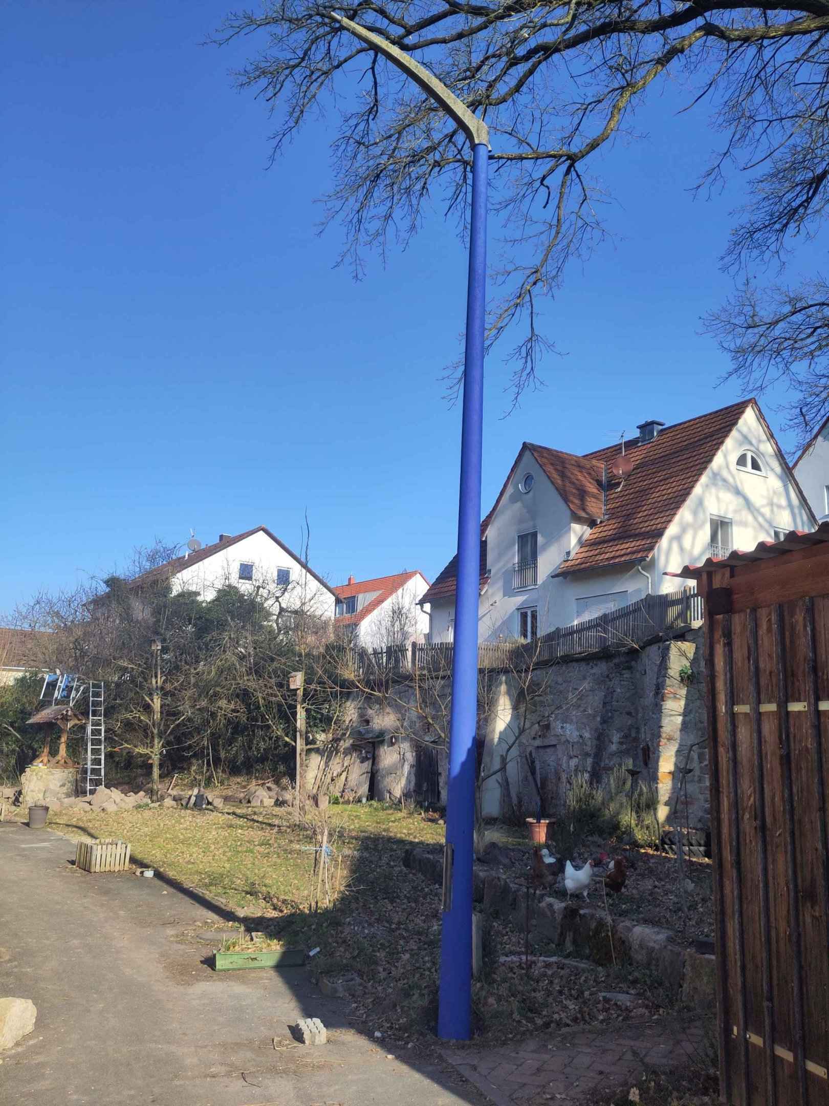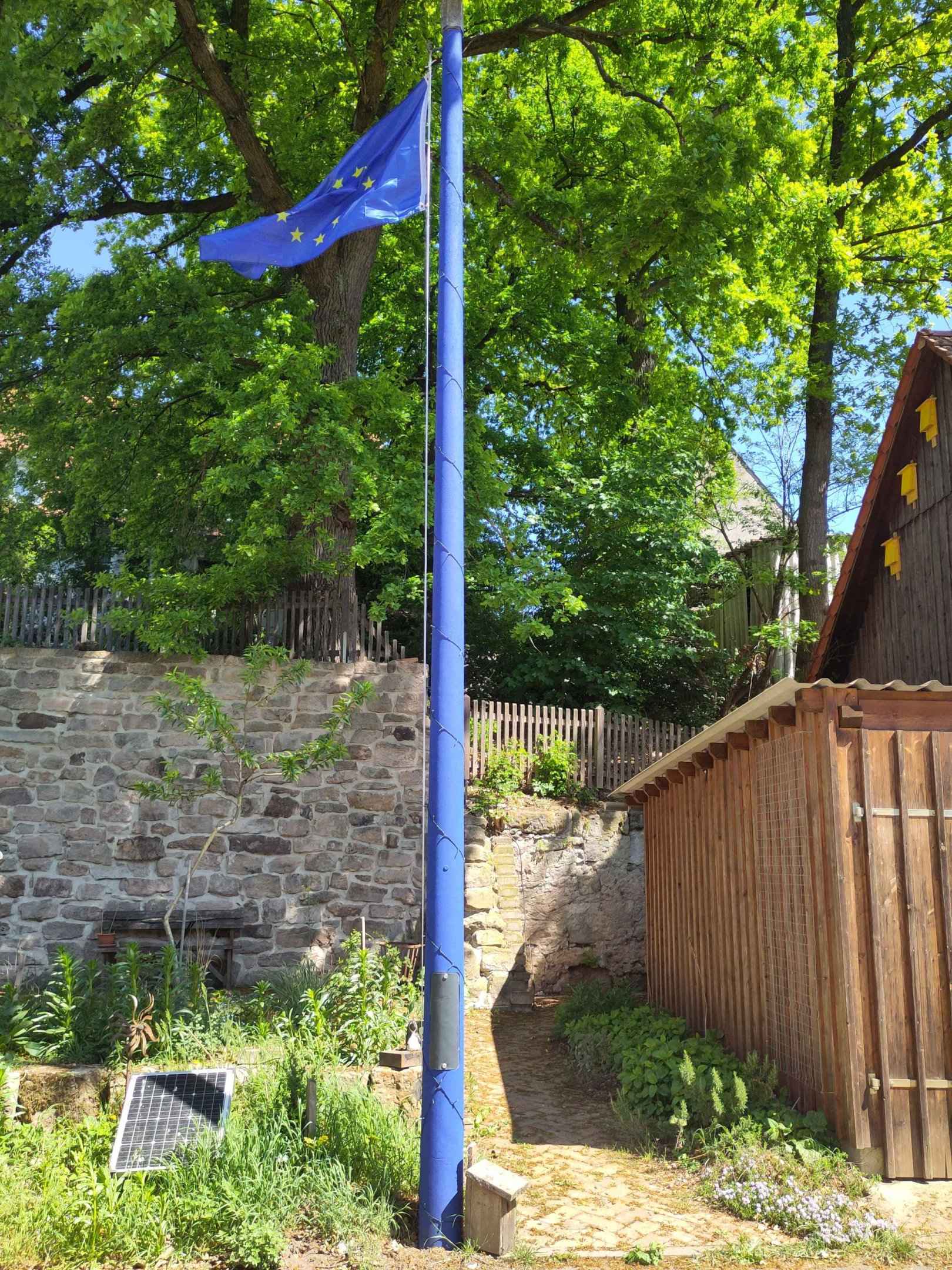 Mit etwas blauer Farbe habe ich eine alte aufgelassene Straßenlaterne in einen blauen Fahnenmasten für eine Europaflagge verwandelt.