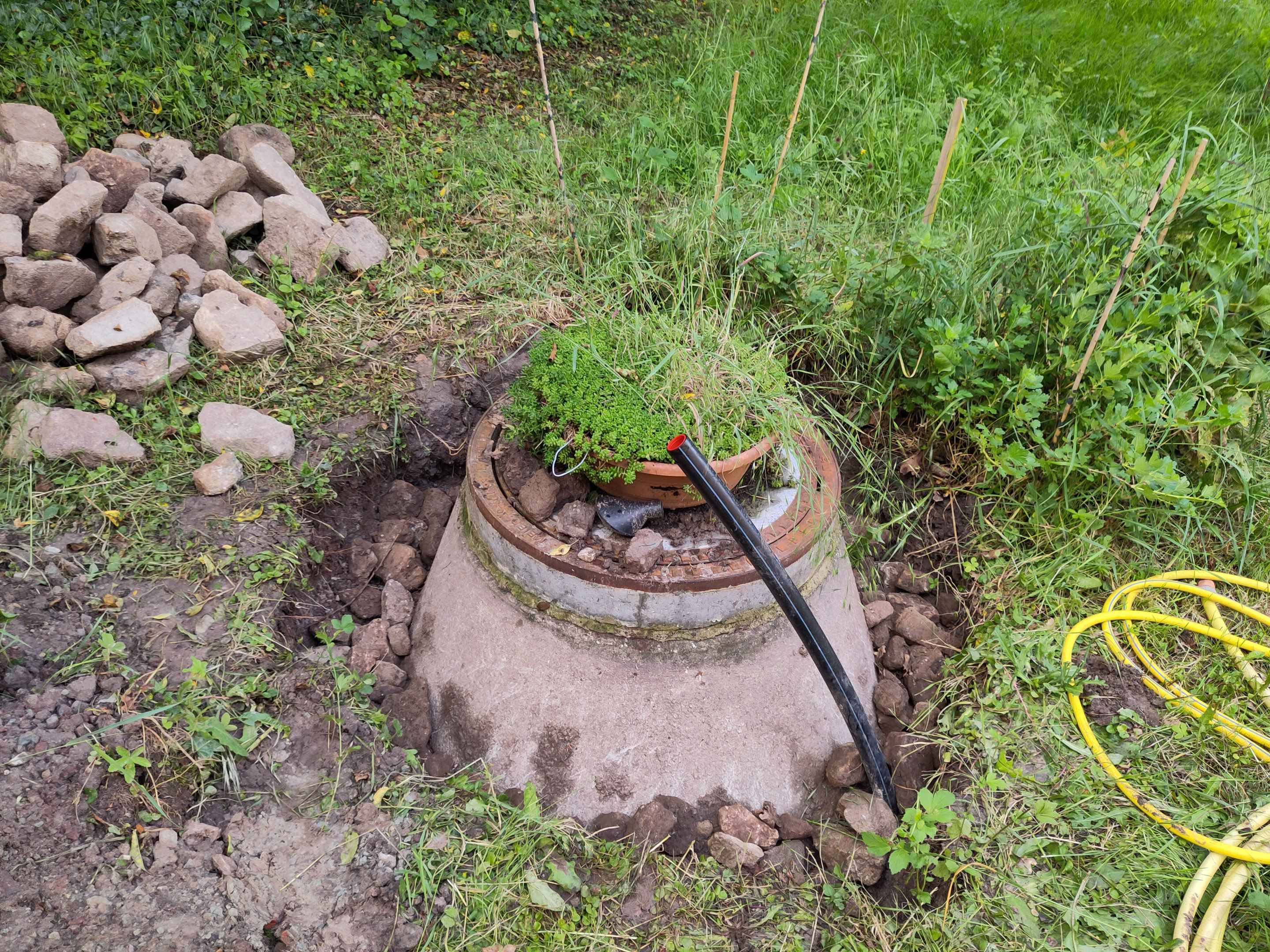 Wir haben für die Wärmepumpe und Gartenbewässerung einen Brunnen in der Wiese. Dieser besteht auf einem Betonschacht, welcher mit einem Gullideckel verschlossen ist. Um das Ganze optisch aufzuschönern, habe ich beschlossen, eine Brunnenumrandung aus Sandsteinen zu mauern und zusätzlich einen neuen Wasserhahn zu installieren. Zunächst habe ich um den Betonschacht einen 50 cm tiefen Graben ausgehoben und als Fundament und Drainage unten eine Schicht Sandsteinschotter eingelegt.