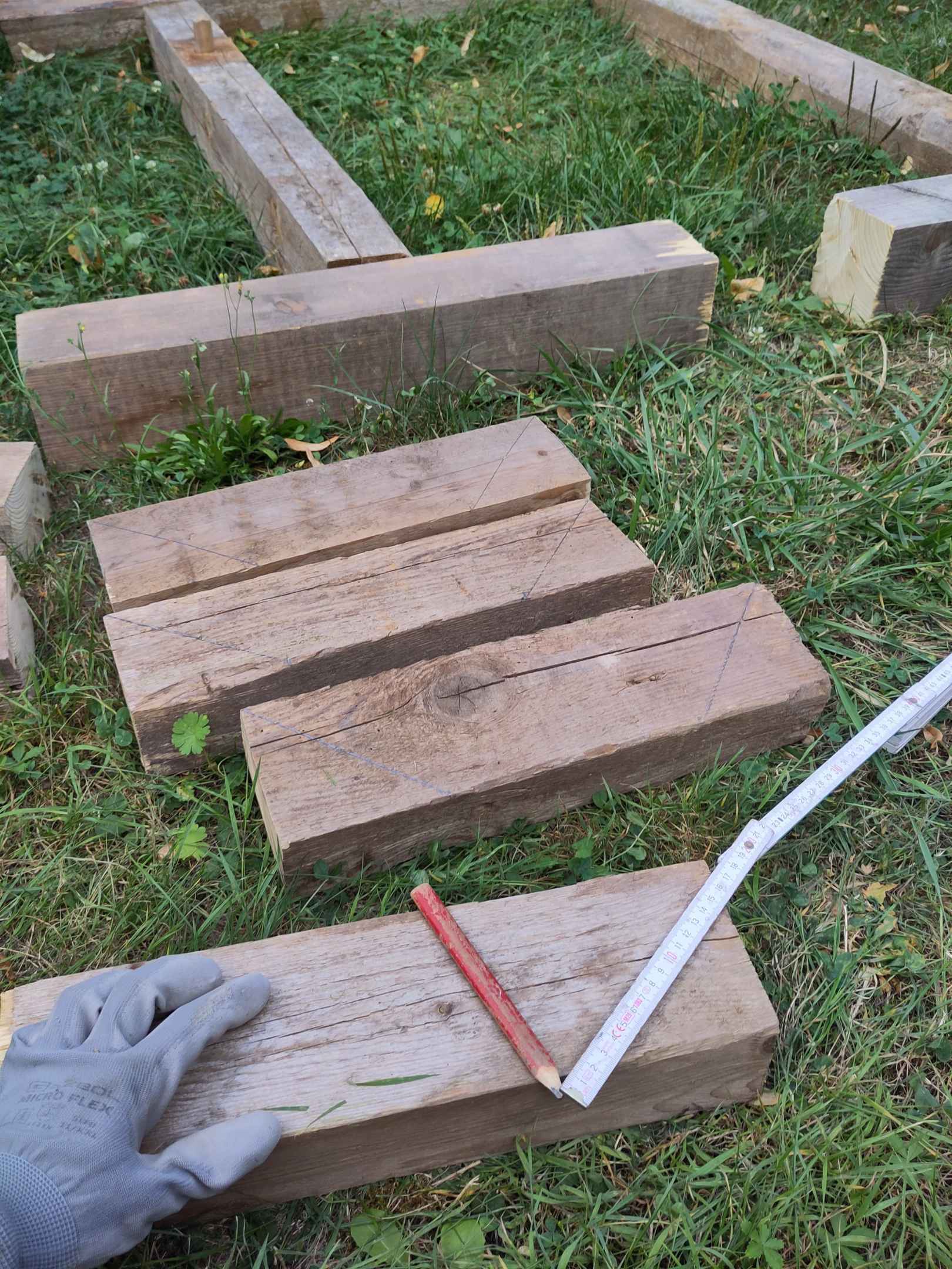 Auf der gemauerten Brunnenumrandung möchte ich eine Holzkonstruktion mit einem Dach und einem bepflanzen Eimer als Dekoration bauen. Ich habe hierfür alte Deckenbalken zurechtgeschnitten. Die Holzkonstruktion besteht aus zwei 70 cm langen Balken, welche links und rechts auf dem Brunnen aufliegen. Auf diesen stehen senkrecht je ein Stützen, welche einen Querbalken mittig über den Brunnen tragen. An dem oberen Querbalken wird der Eimer aufgehängt. Zur Stabilisierung verwende ich kurze Balkenreste im 45-Grad Winkel.