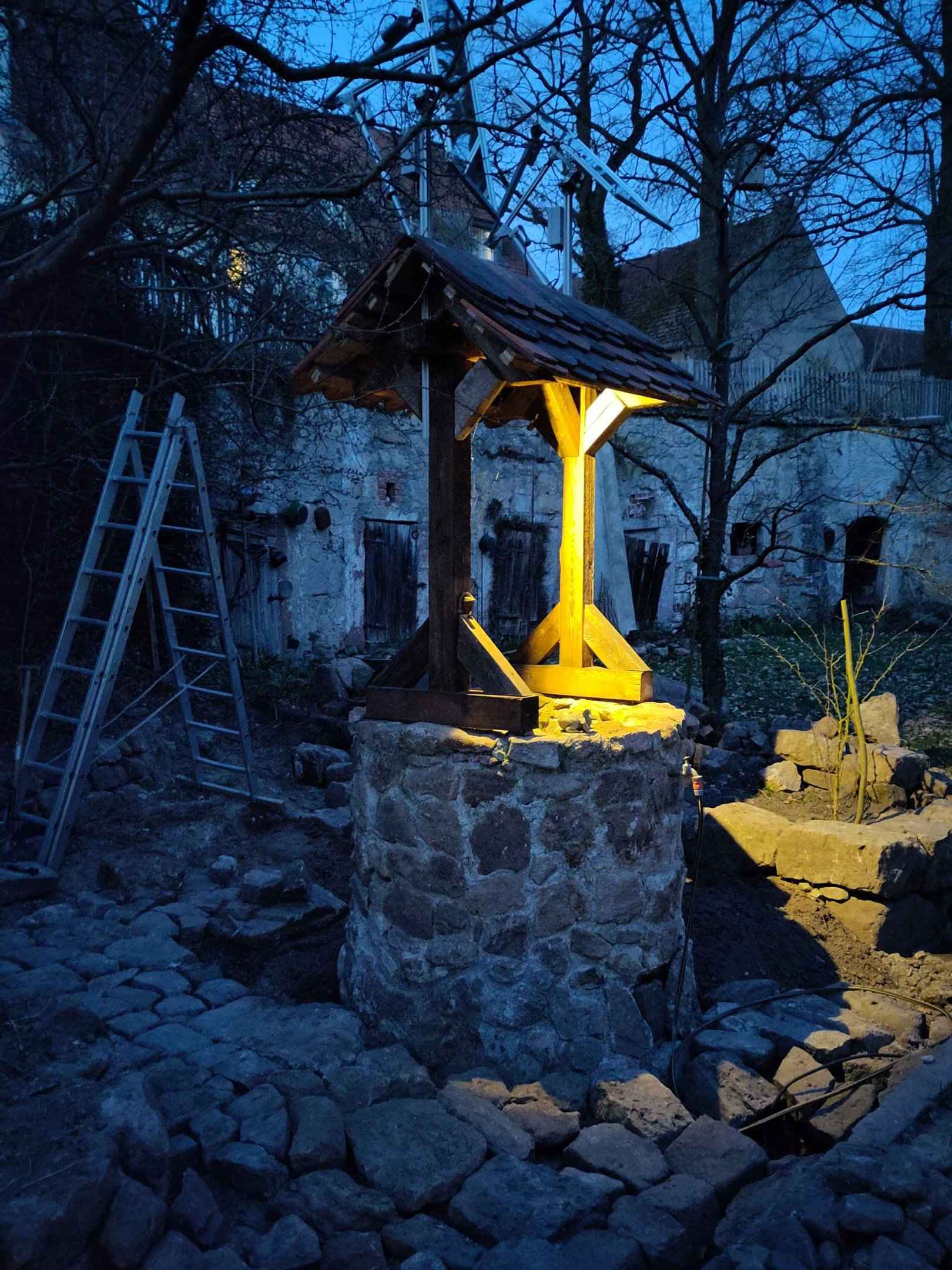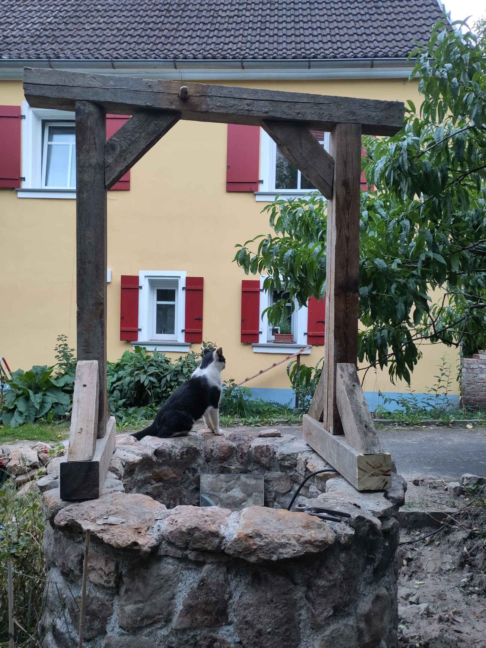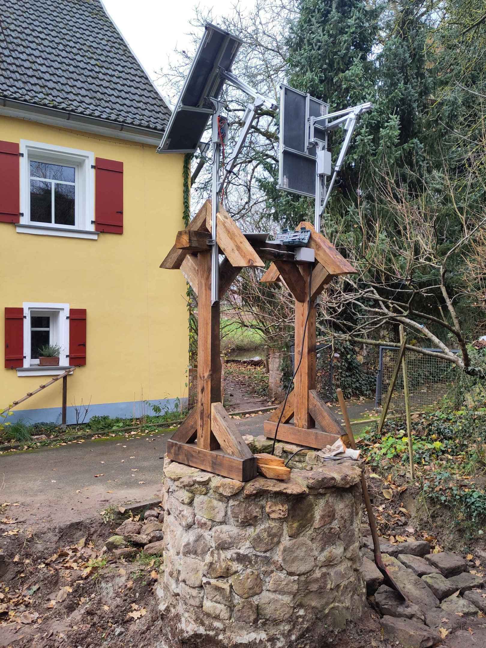 Die Balken habe ich am boden liegend zusammengeschraubt und anschließend auf den Brunnen gehoben und ausgerichtet und auf dem Brunnen verschraubt.
