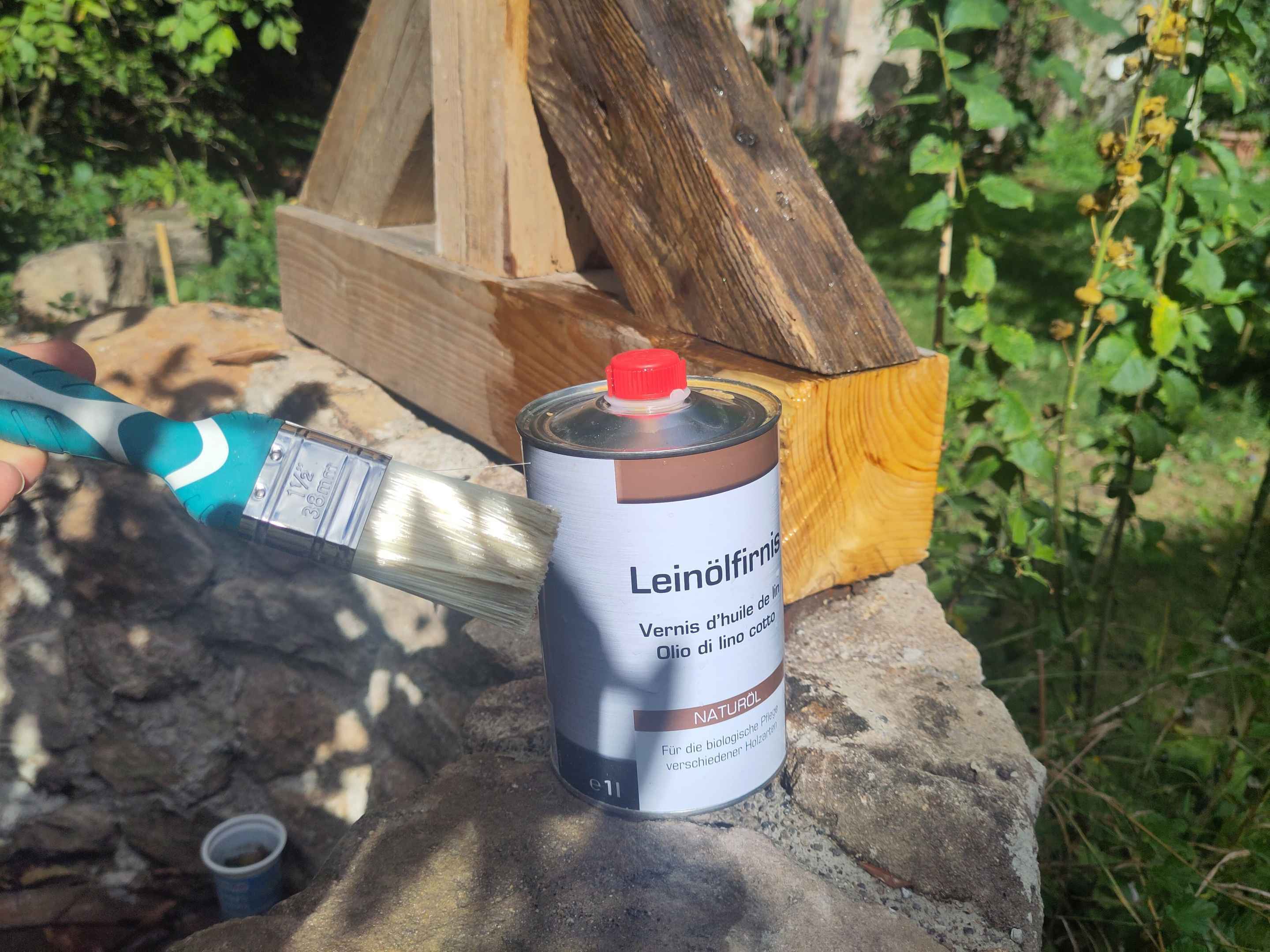 Um die Lebensdauer der Holzbalken zu erhöhen, habe ich sie mit Leinölfirnis eingelassen. Leinölfirnis besteht aus Leinöl, welches hoch erhitzt wurde. Wenn es mit Luft in Verbindung kommt, geht es eine chemische Reaktion ein und bildet eine natürliche schützende Schicht. Man kann es auch selber herstellen. Es ist zwar nicht ganz so langlebig wie andere Holzschutzmittel, dafür wesentlich umweltfreundlicher.