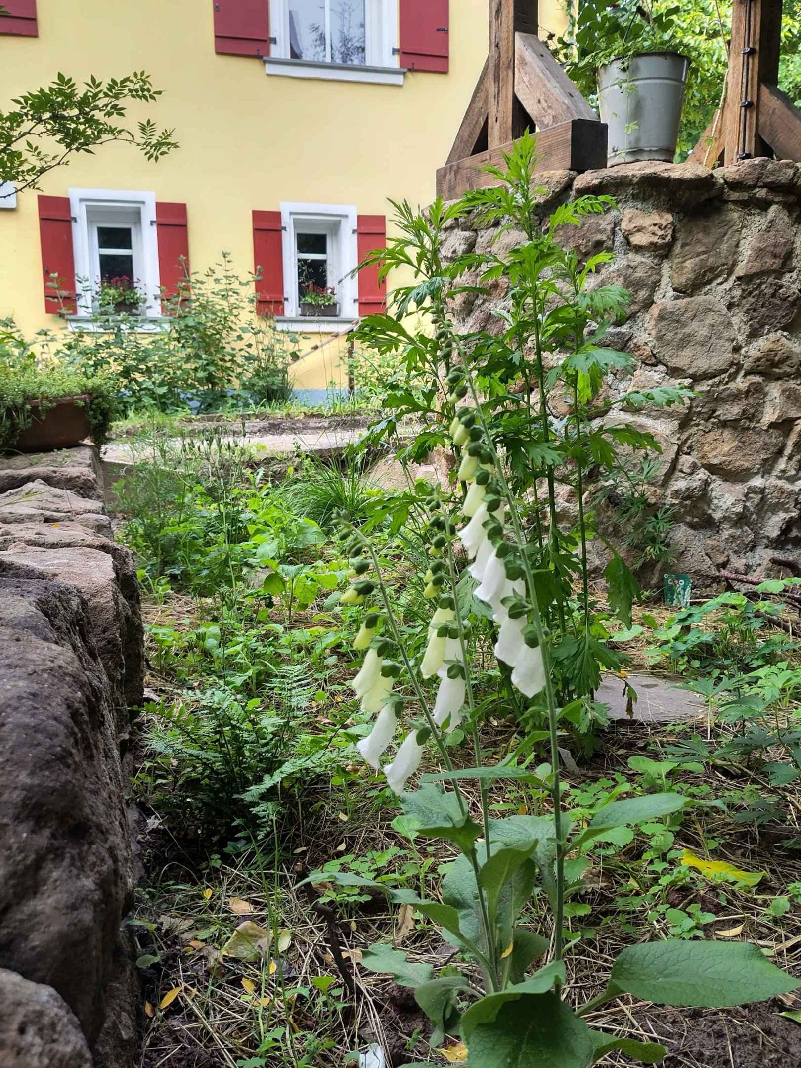 Einen kleinen Bereich um den Brunnen habe ich für ein Blumenbeet frei gehalten. Hier habe ich mehrere schattenliebende Pflanzen gesetzt, welche mit nährstoffarmen Boden zurecht kommen. Den Boden habe ich mit etwas Heu gemulcht. Um besser Unkraut jäten zu können, habe ich ein paar Trittsteine im Beet verteilt. Da inzwischen Ostern wurde, habe ich die Dachkante des Brunnens mit ausgeblasenen Eiern geschmückt. In die Mitte des Brunnens habe ich einen alten Blecheimer gehängt und mit Blumen bepflanzt.