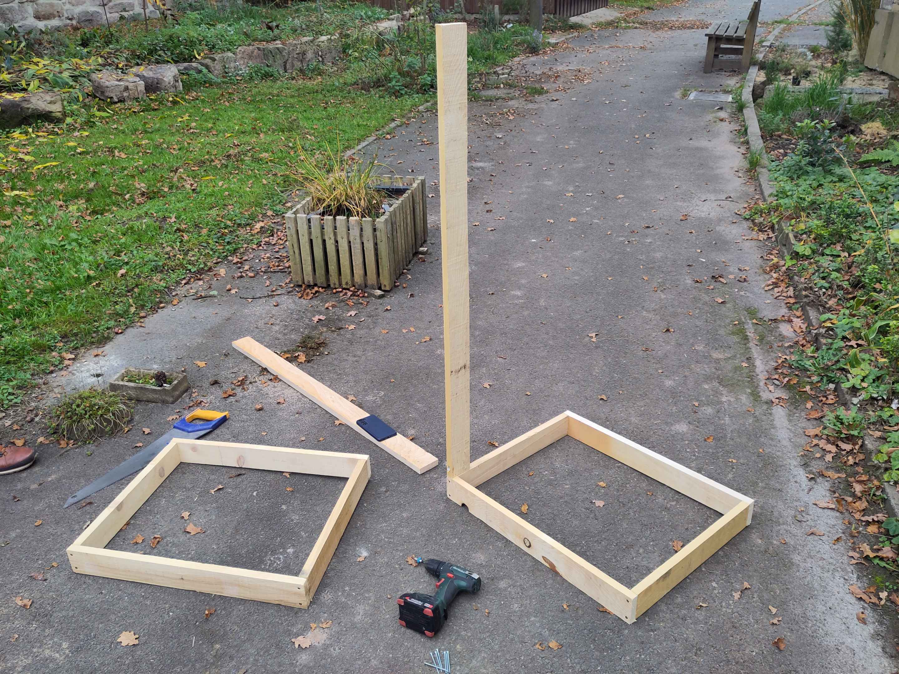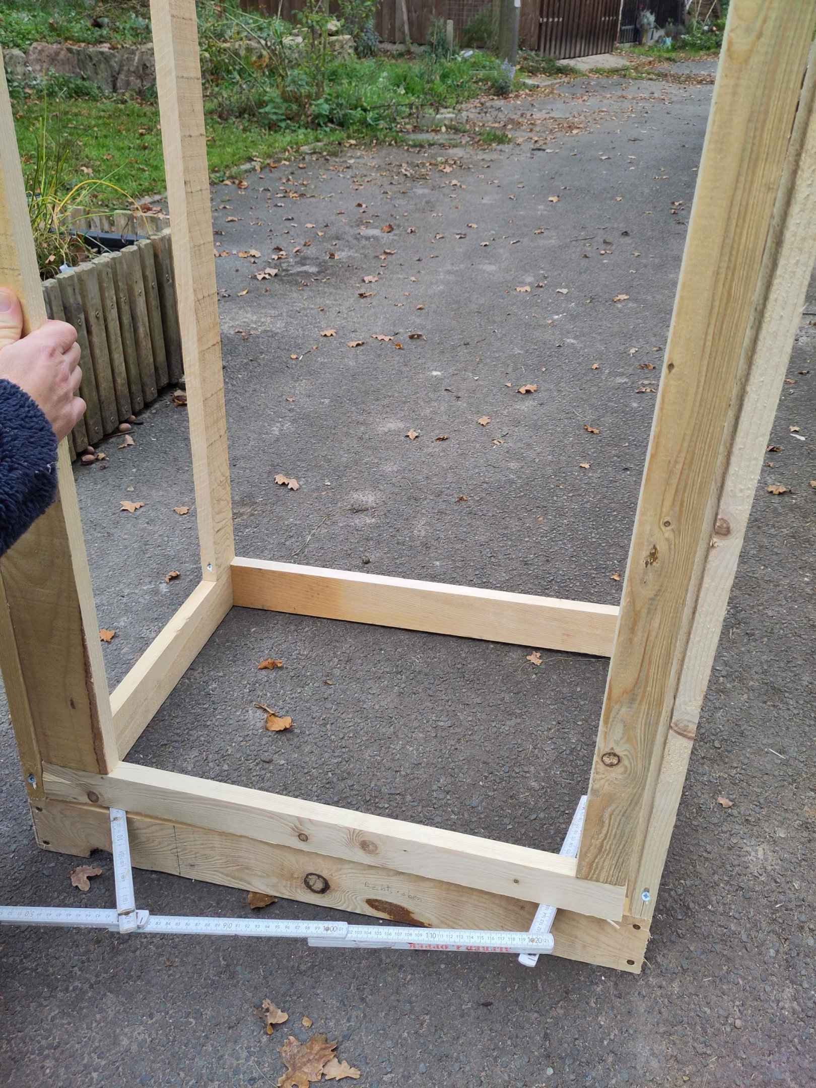 Wir haben uns für ein Maß von 60 cm x 60 cm entschieden sowie eine Höhe von 160 cm. Zunächst wird der Rahmen zusammengebaut. Dafür werden vier Latten für den Boden und viel Latten für den Deckel zu einem Rechteck verschraubt. Vier senkrechte Latten in den vier Ecken bilden den Rahmen.