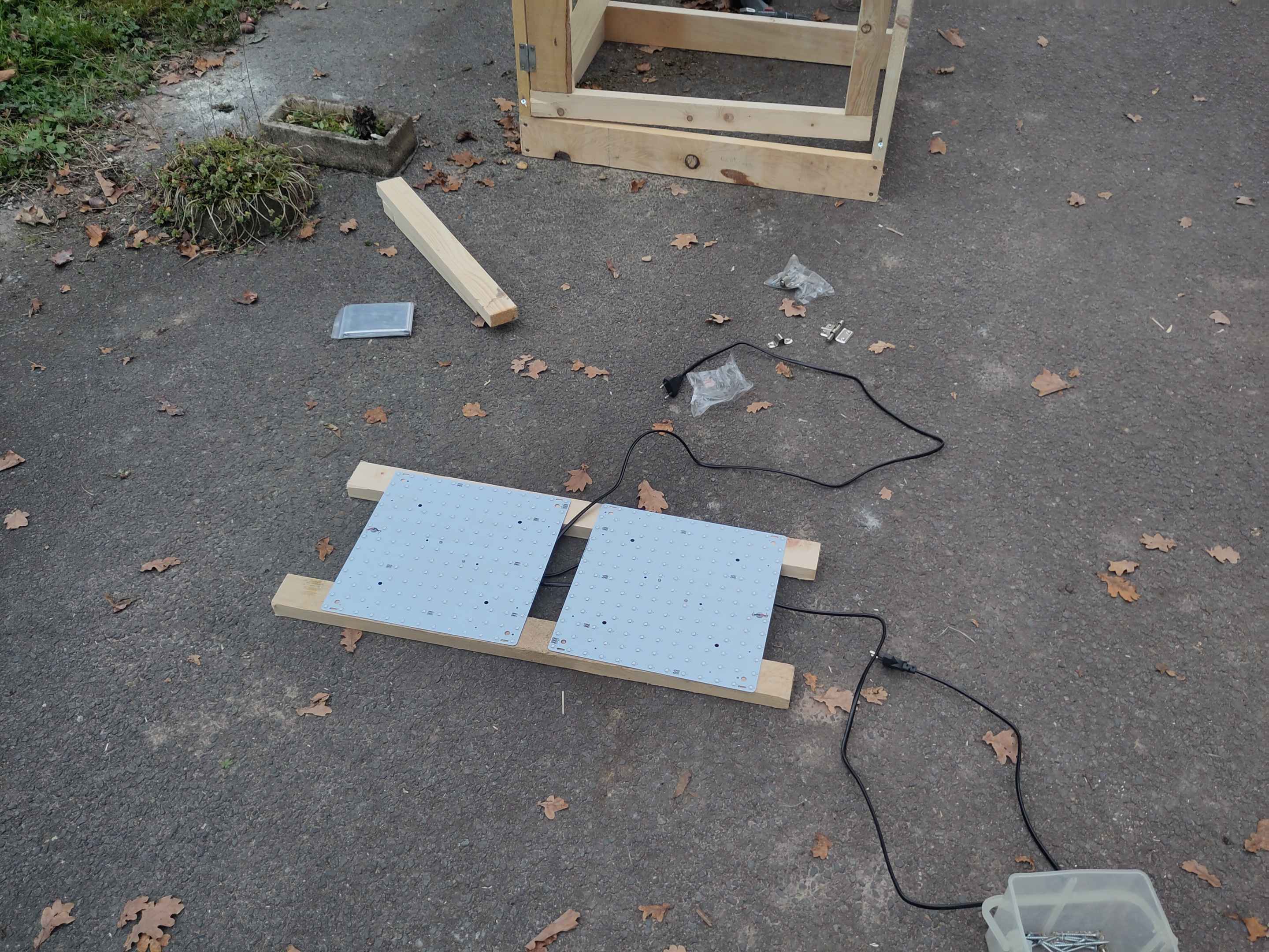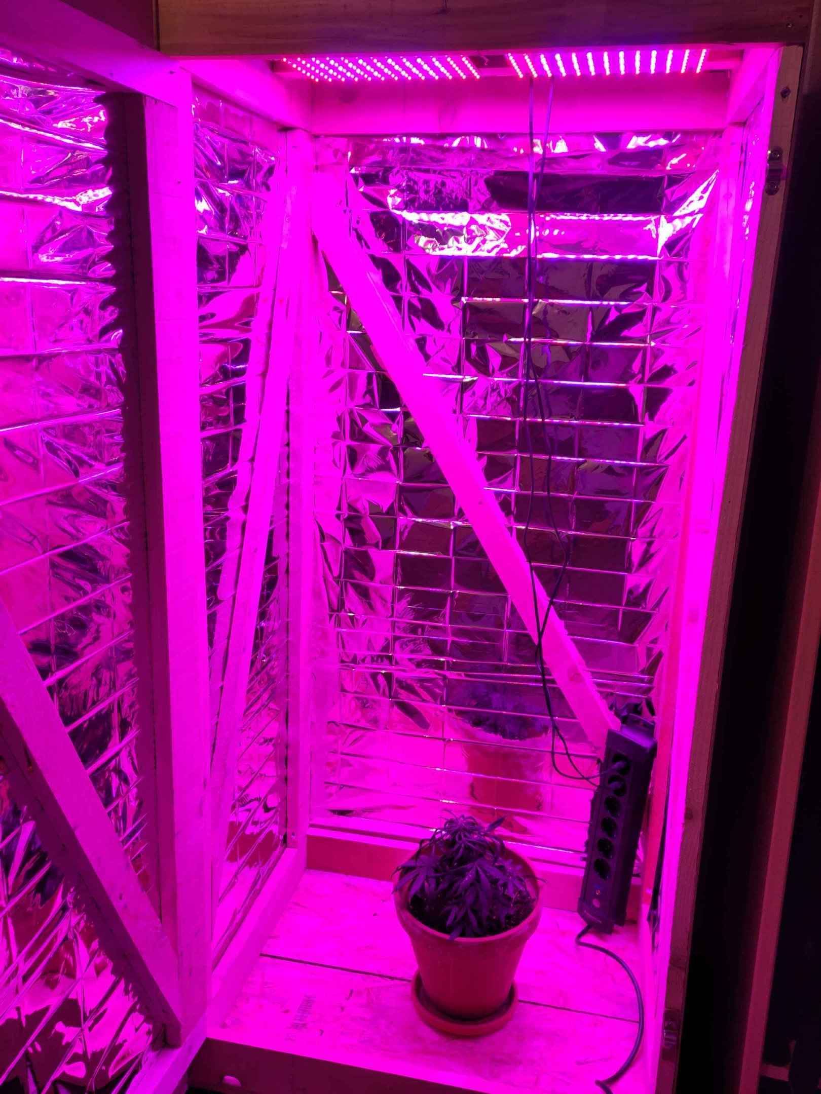 Für die Beleuchtung haben wir zwei flache LED Panele auf zwei Latten montiert und oben in der Box verschraubt. Sollte ein Panel kaputt gehen, kann man einfach die Schrauben lösen und es austauschen. Jedes Panel besitzt knapp 20 Watt Leistung. Dies reicht für die meisten Pflanzen bei dieser Growboxgröße aus.