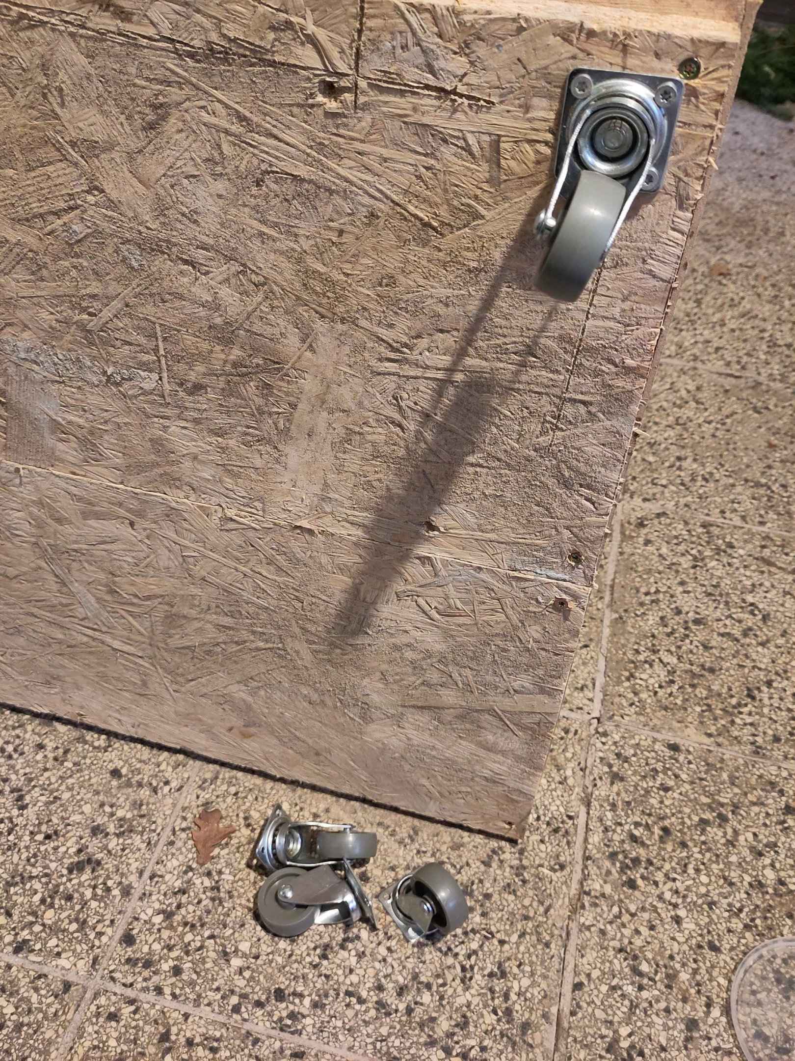 Die Bodenplatte beteht aus einer alten Spanplatte, unter welche wir vier Rollen geschraubt haben. Somit lässt sich die Growbox leichter rangieren.