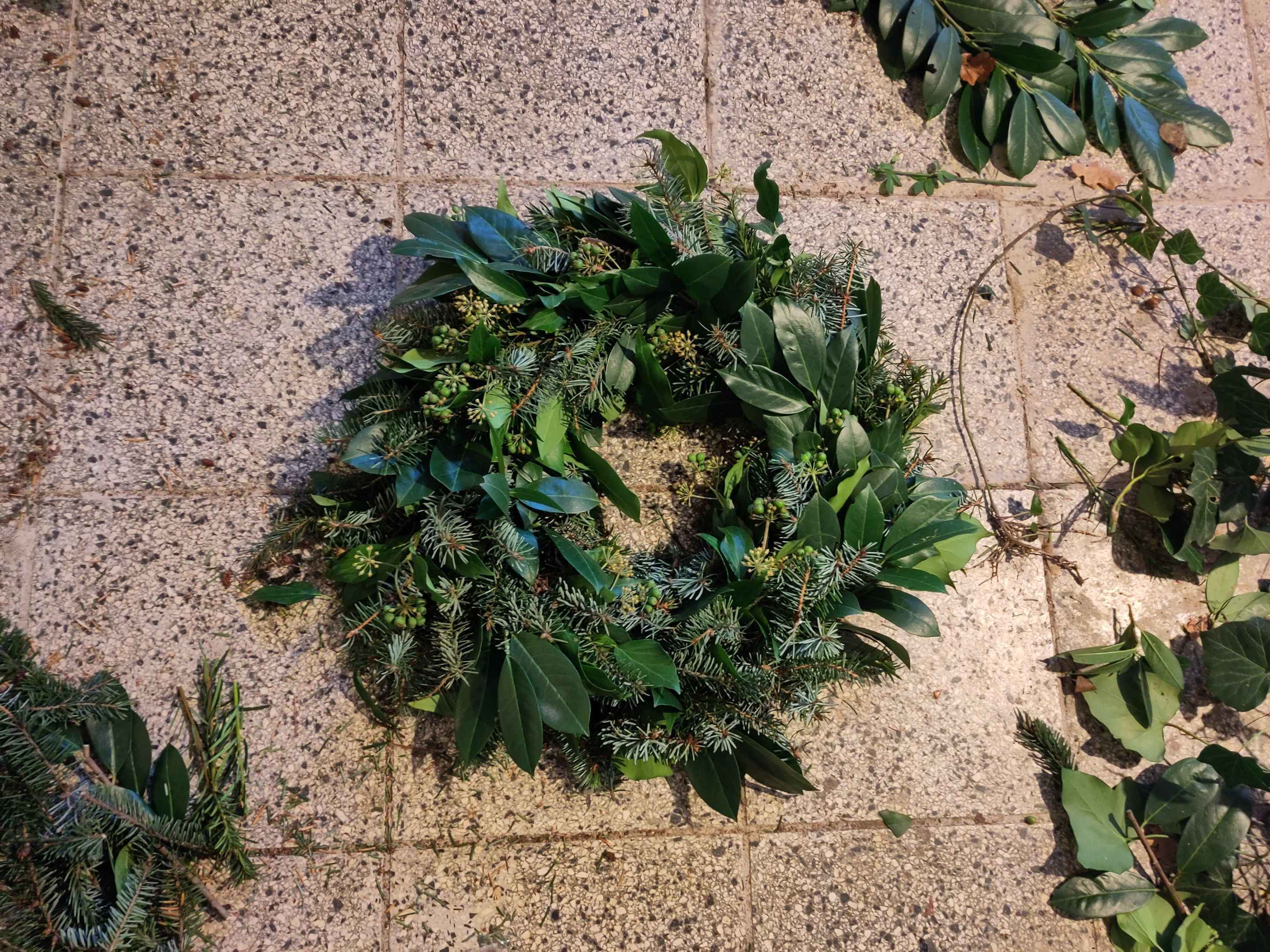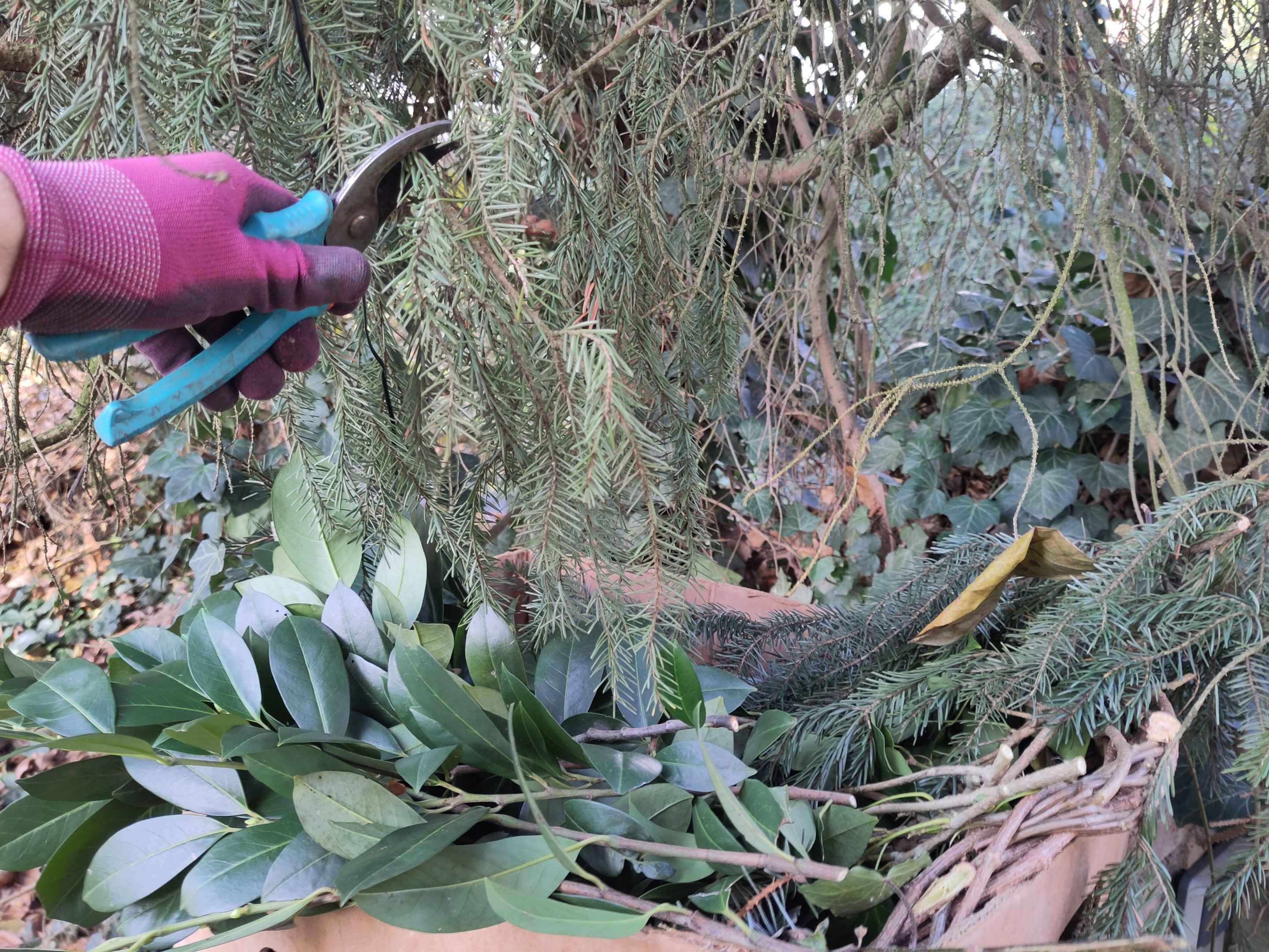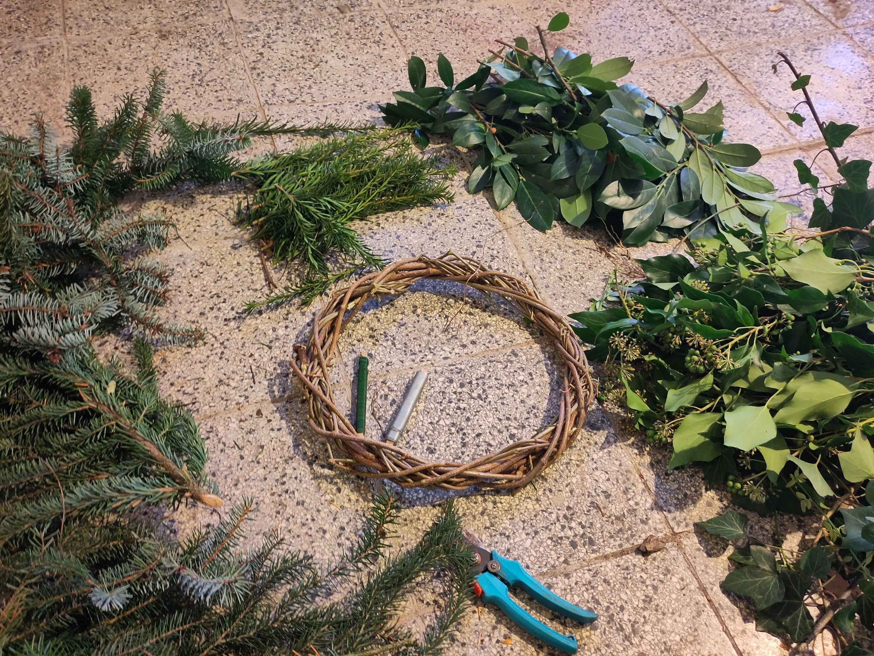 Zunächst benötigt man immergrüne Zweige. Hierzu eignet sich fast alles, zum Beispiel Tannen, Fichten, Buchs, Efeu, Magnolie, Liguster, Heidepflanzen etc. Je nach Geshmack kommen noch einzelne andersfarbige Zweige oder Früchte als Farbtupfer hinzu. Hierzu eignen sich je nach Jahreszeit z. B. Hagebutten, Lavendel, Raute, Eucalyptus, getrocknete Blüten oder kleine Schilfgräser. Die Zweige werden je nach Kranzgröße auf 10 bis 15 cm Länge abgeschnitten. FÜr einen mittelgroßen Kranz benötigt man etwa einen 10 Liter Eimer voll an losen Zweigen.