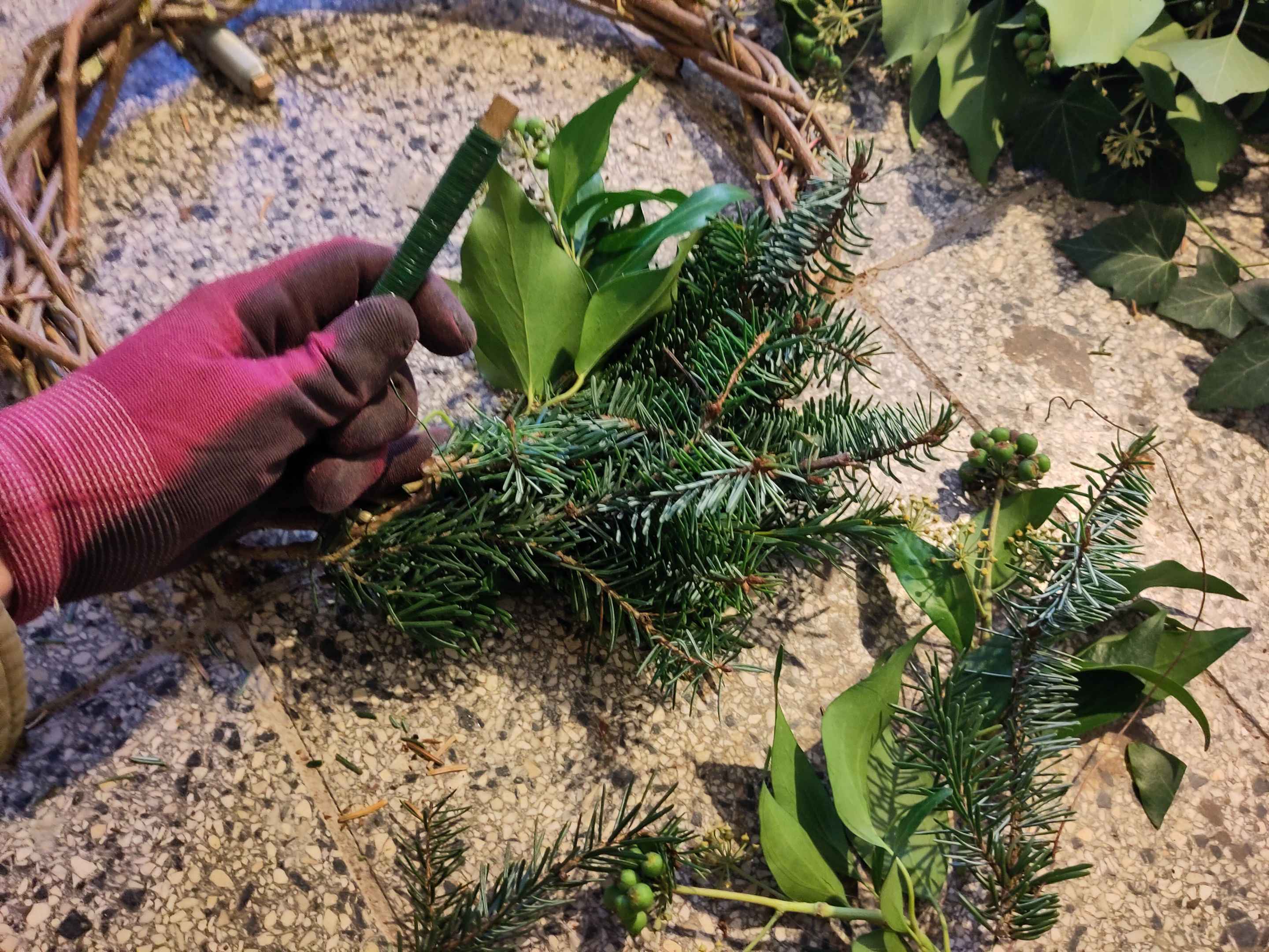 Wenn die Zweige zu brüchig sind, kann man diese über Nacht in Wasser einlegen. Die Zweige werden nacheinander eingeflochten und die Enden in den Ring gesteckt, bis ein stabiler Ring entsteht. Nun geht es ans Kranzbinden.