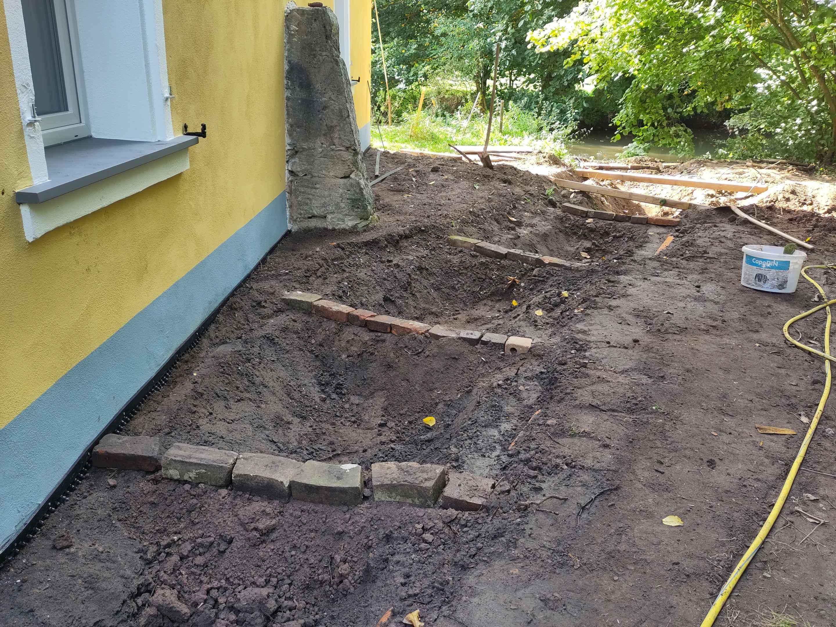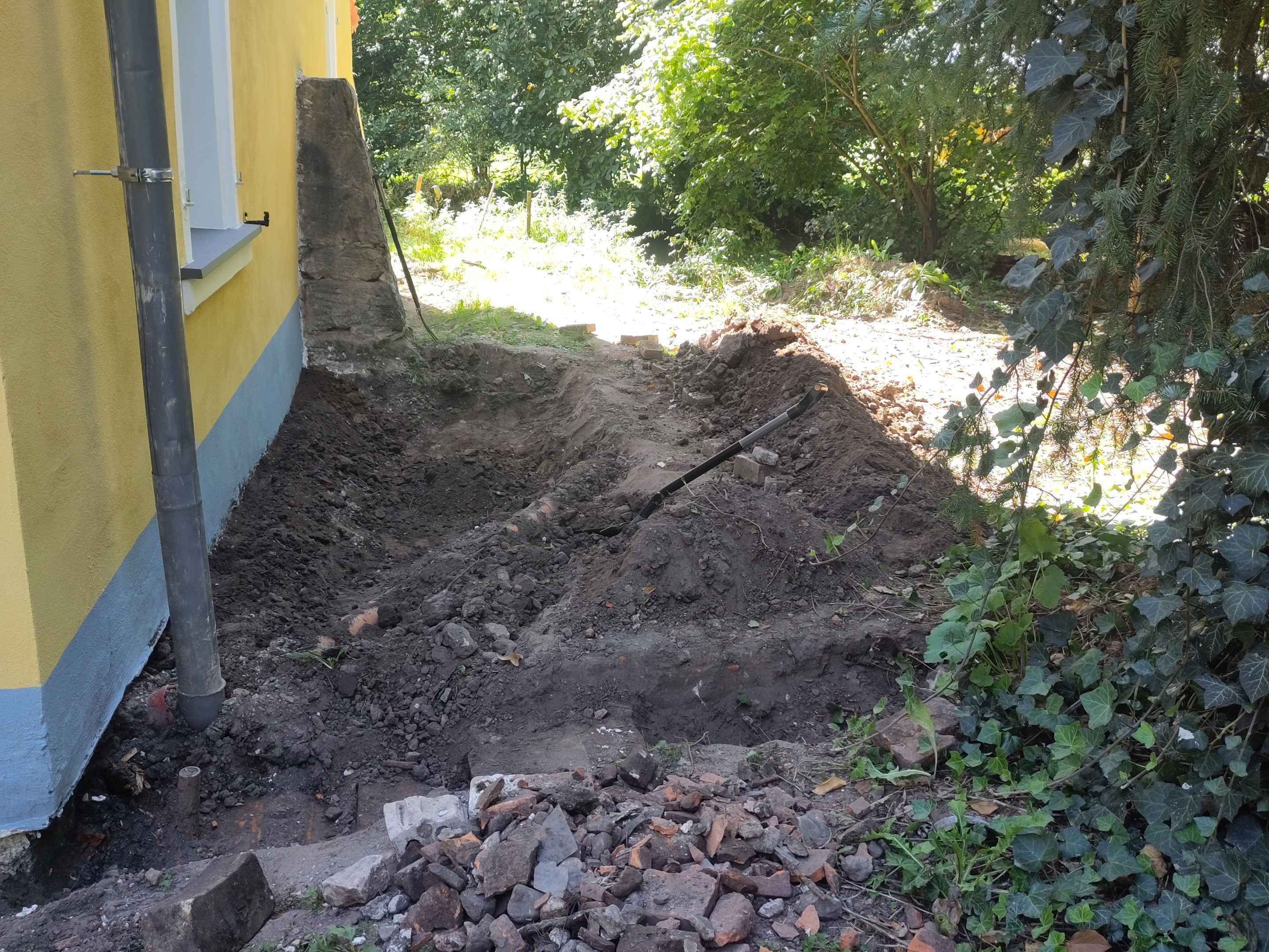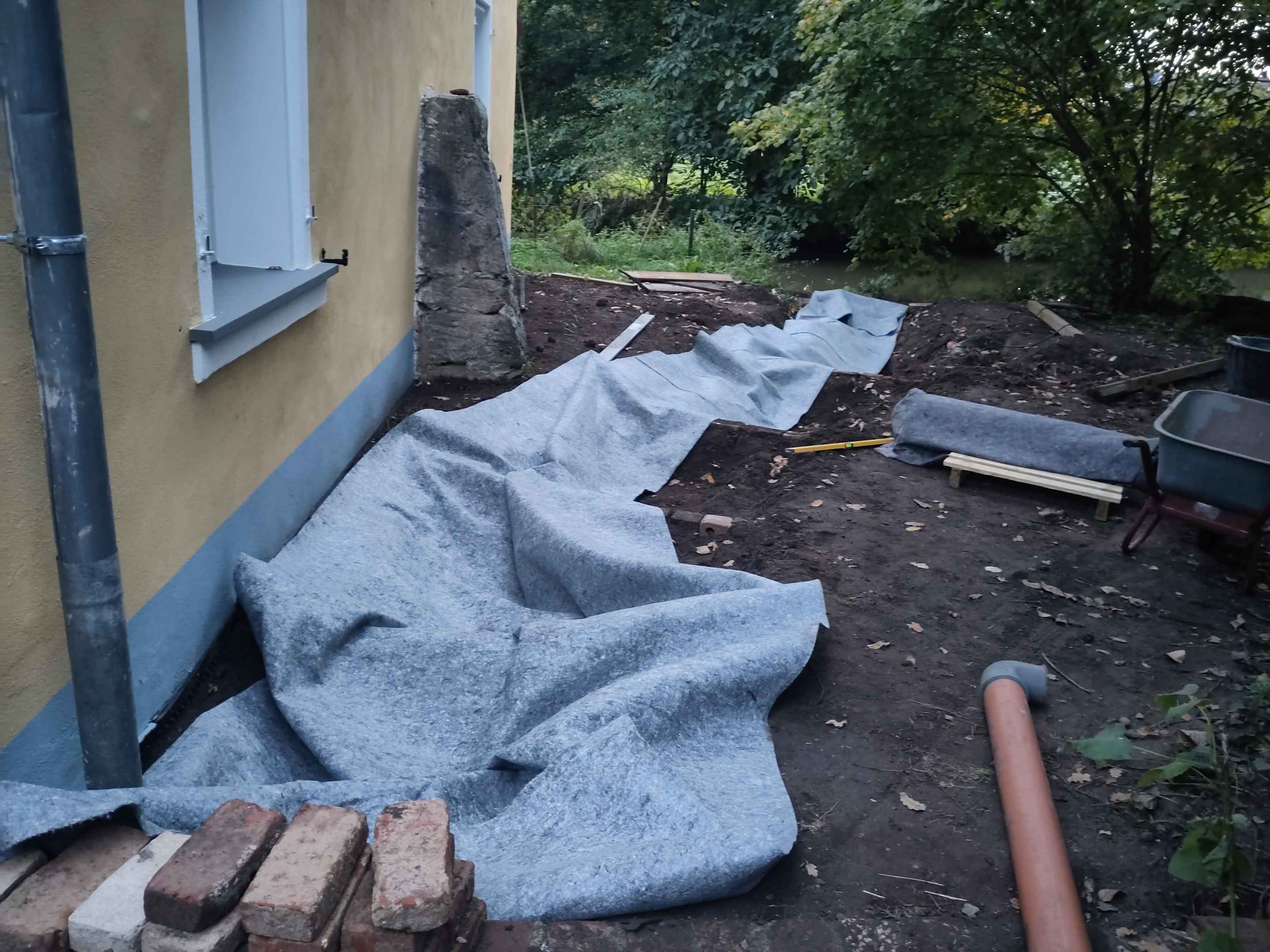 Hierfür habe ich zunächst einen Graben ausgehoben. Wichtig ist, dass der Graben etwas entfernt vom Haus endet und dass ein leichtes Gefälle besteht, damit das versickernde Wasser von der Hauswand fern bleibt.