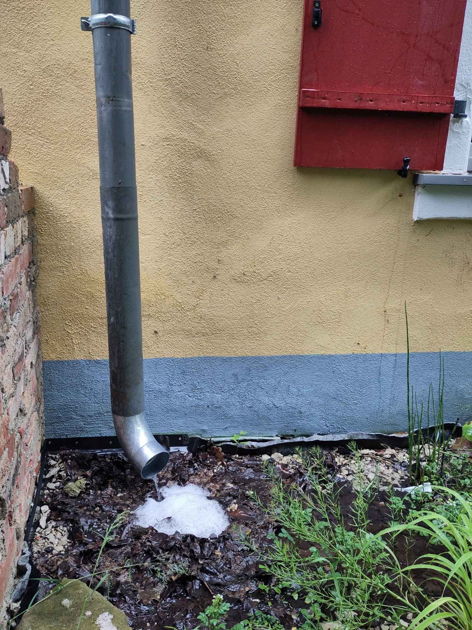 Von unserer Regenrinne führt ein Rohr durch den Garten direkt in den Fluss. Die Einleitung von Wasser ist in Bayern unter Bedingungen erlaubt, wie hier nachzulesen ist, jedoch ist es aus ökologischer Sicht besser, das Wasser auf dem Grundstück zu halten und vor Ort versickern zu lassen. Ähnlich sieht es aus, wenn die Regenrinne direkt an den Kanal angeschlossen ist. Nicht nur muss man Niederschlagsgebühren zahlen, sondern das belastet auch noch zusätzlich die Kanalisation und Kläranlage, da die meisten Städte nur Mischwasserkanäle besitzen. Bei Starkregen kann so der Kanal überlaufen und ungeklärtes Abwasser in dei Umwelt gelangen.