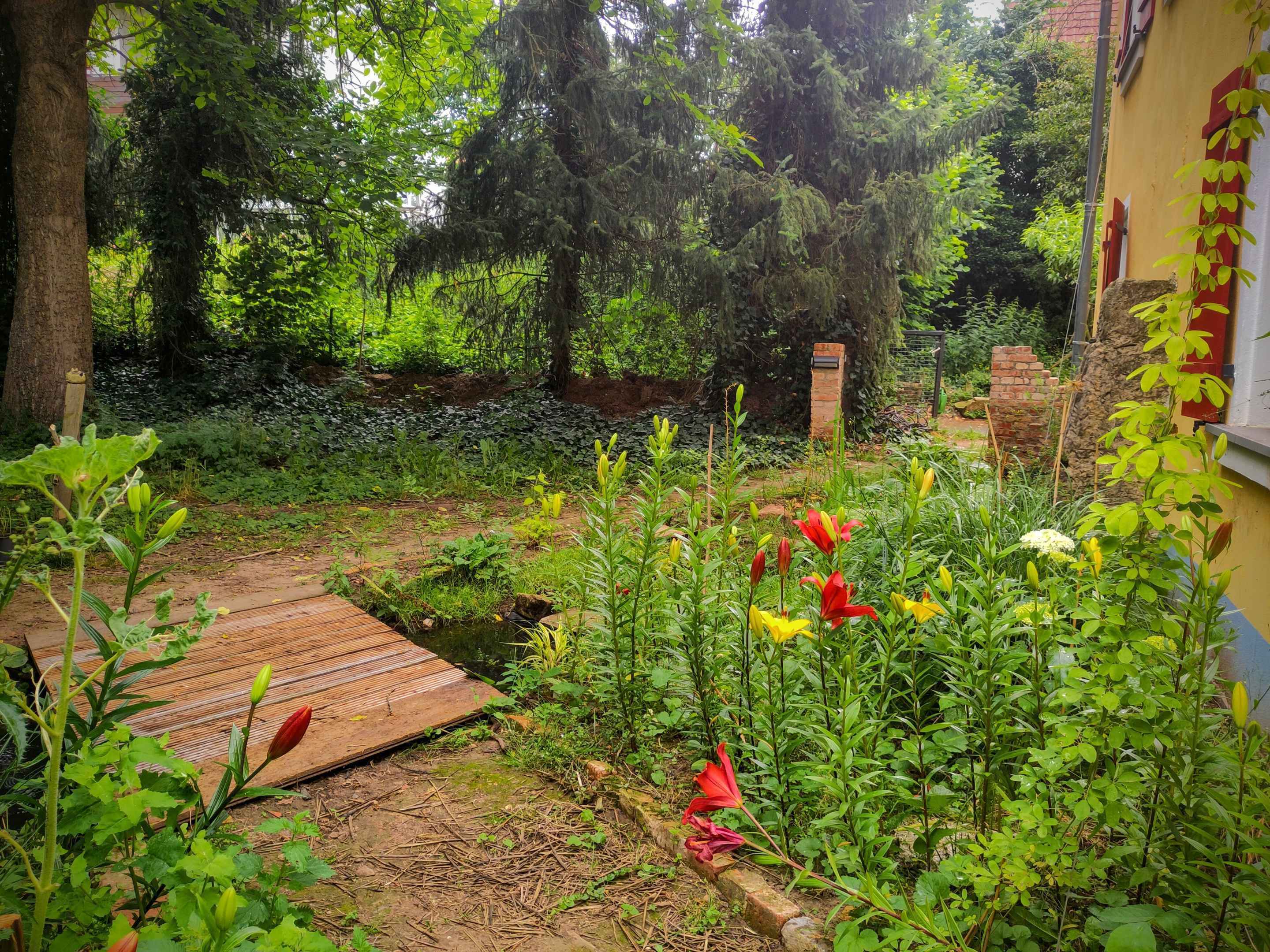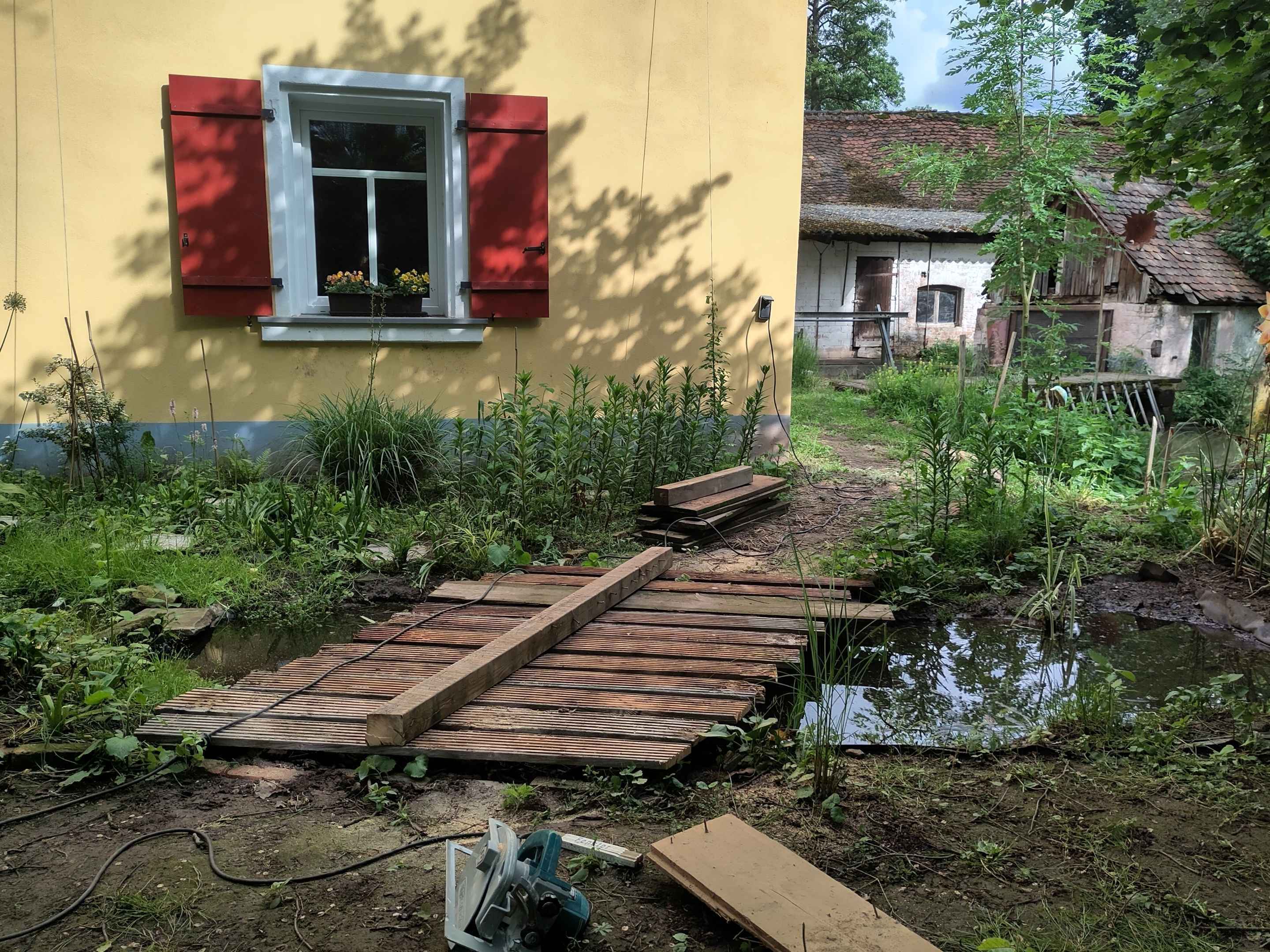 Das alte Regenabflussrohr habe ich im Boden belassen, in ihm verlaufen nun ein Schlauch und das Kabel für eine kleine Teichpumpe, um im Sommer das Wasser umzuwälzen. Doch dank der abgetrennten Becken bleibt auch ohne Teichpumpe im Sommer immer genug Wasser in den oberen Bereichen. Die Teichpumpe ist vollkommen optional. Auch gibt es einen weit verbeiteten Irrglauben, dass man durch das stehende Gewässer mehr Mücken hätte. Tatsächlich bevorzugen Steckmücken kleinere wechselfeuchte Wasserstellen wie Gießkannen, stehengelassene Eimer, Regentonnen oder größere Pfützen. Im Sickerteich hingegen werden sich recht schnell Raubtiere ansiedeln, welche Fliegenlarfen fressen und daher ist dieser uninteressant für Stechmücken und stellt keine Gefahr dar. Aus alten Terassendielen habe ich einen Steg gebaut. Die Breite des Stegs ist mit 1,50m als Fußweg für die Feuerwehr ausgelegt, da er den Zugang auf die Südseite des Hauses ermöglicht.