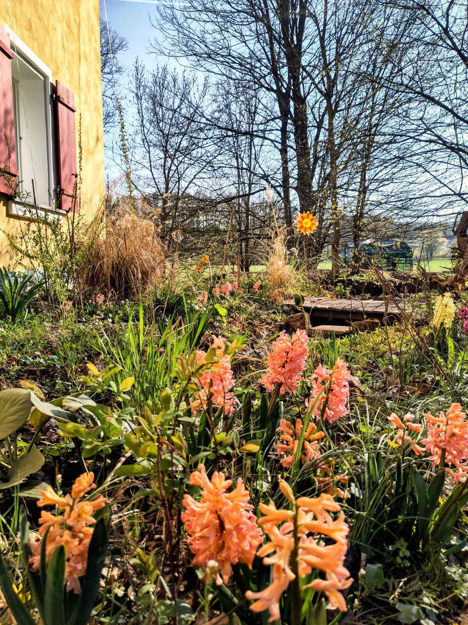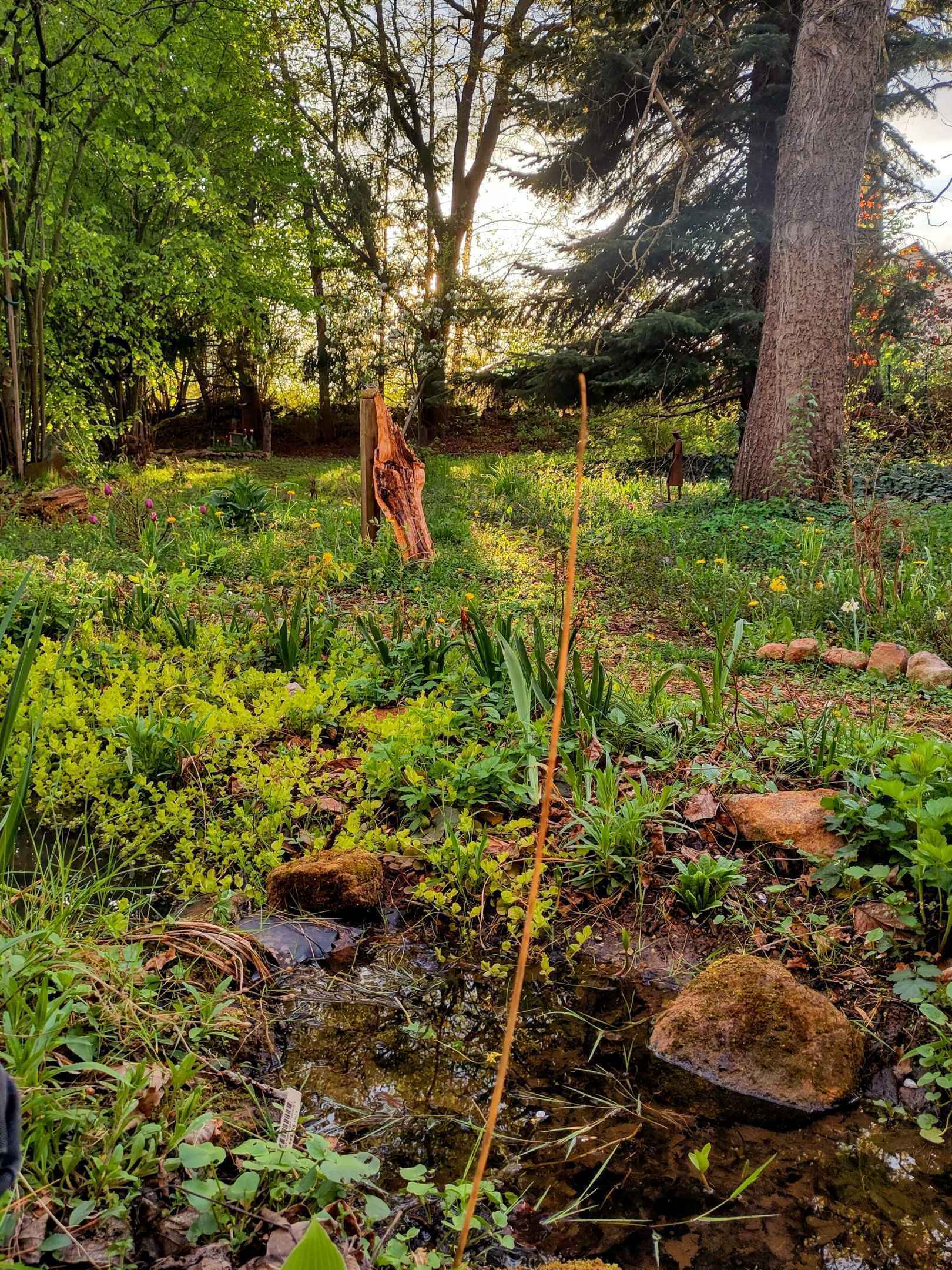 Am Rand, dort wo die Teichfolie ins normale Erdreich übergeht habe ich viele Blumenzwiebeln gesetzt. Diese vertragen keine dauerhafte Staunässe, vertragen aber den feuchten Boden. Im Frühling blüht das ganze Beet in bunten Farben.