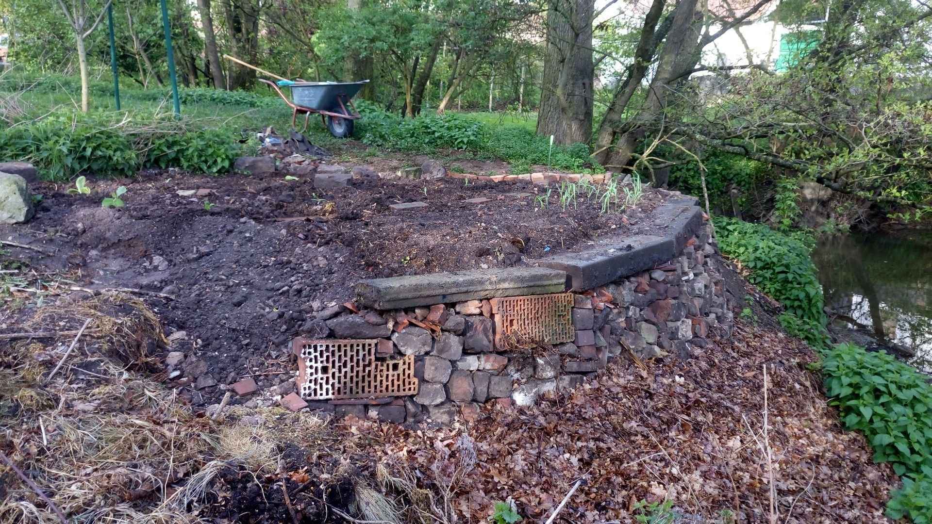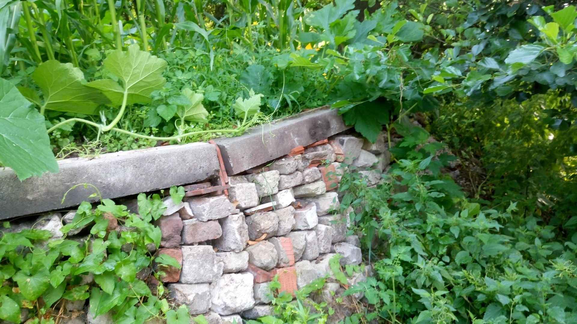 Als erstes habe ich aus den alten Steinen eine Trockenmauer gebaut, oben abgerundet mit ein paar alten Bordsteinen.
