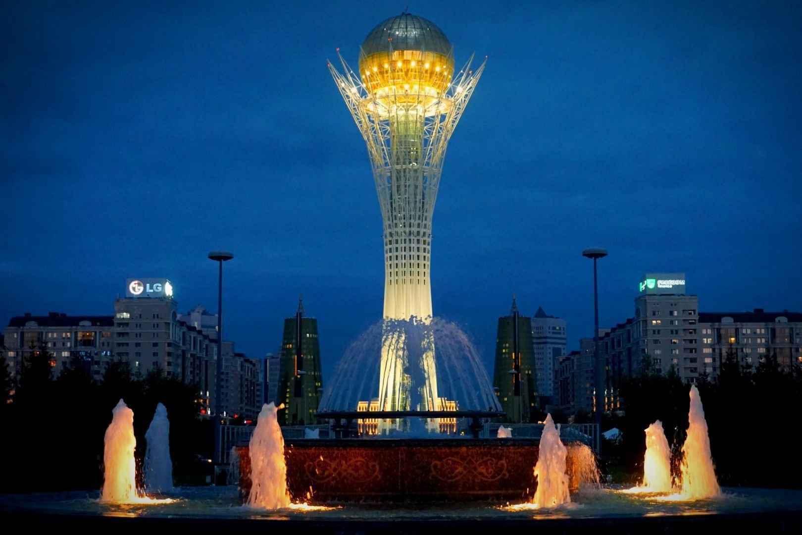 Eine Moschee bei Nacht, futuristische Türme – Astana, die Hauptstadt aus der Steppe.