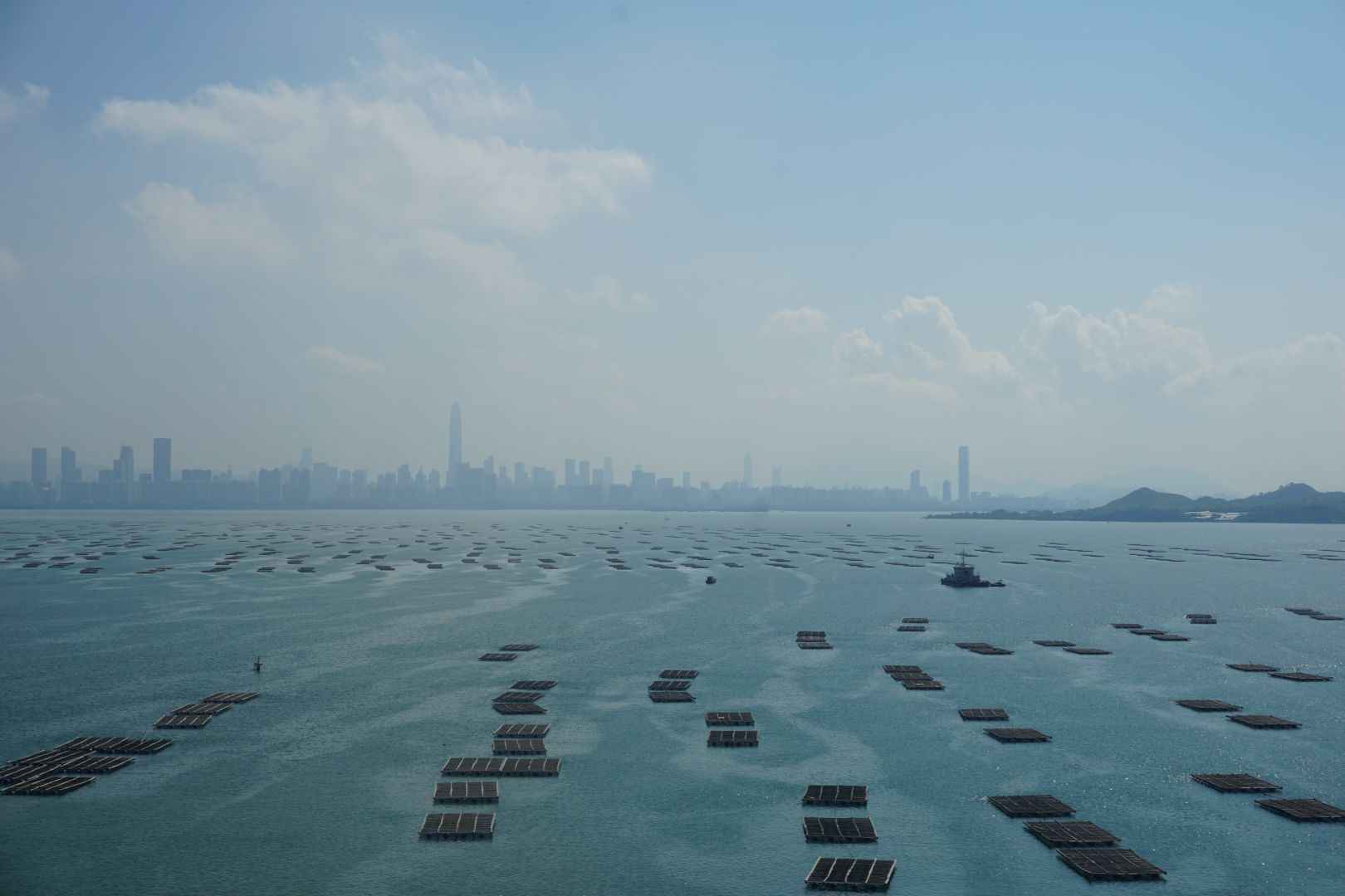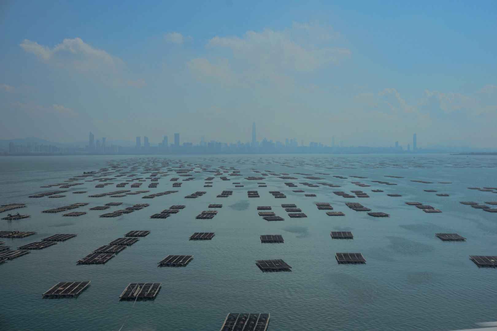 Am nächsten Tag ging es über die Grenze. Zum Glück konnte ich mein Fahrrad im Gepäckraum mitnehmen. In der Bucht, welche China von Hongkong trennt befinden sich schwimmende Farmen für Wassertiere. Diese erstrecken sich über die gesamte Bucht. Im Hintergrund im Smog kann man die skyline von SHenzhen erkennen, der Hochburg der SMartphone-Industrie in China.