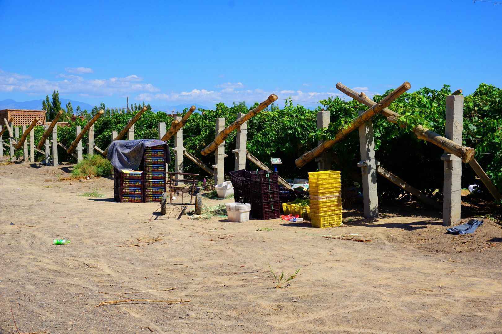 Die Strecke beträgt knapp 80 km. Es war Anfang September und entsprechend heiß. Der Weg war gesäumt von endlosen Weinfeldern, welche durch unterirdische jahrtausende alte Kanäle von den Gletschern im Norden des Tals bewässert werden. Gerade war Erntezeit und ich lies mir die Gelegenheit nicht nehmen, ein paar Trauben direkt vom Bauern zu kaufen.