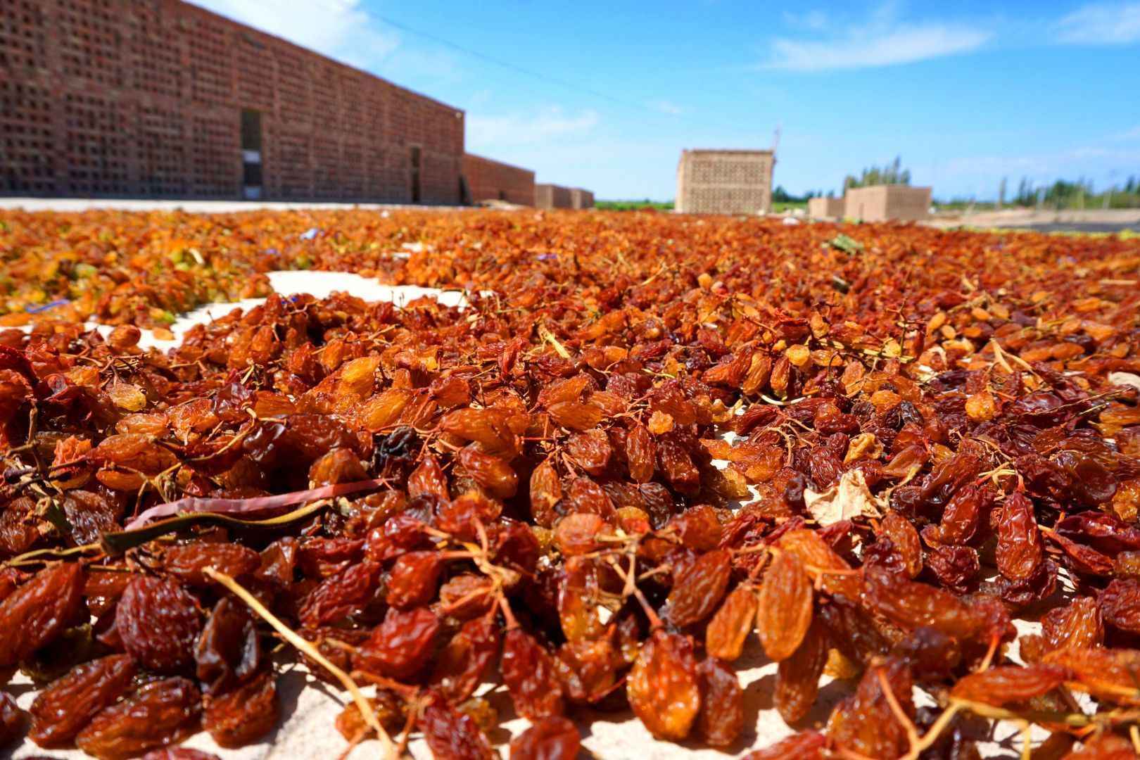 Am Straßenrand lagen die Trauben zum Trocknen in der Sonne. Die Region ist bekannt für eine Rosinen, welche weltweit exportiert werden.