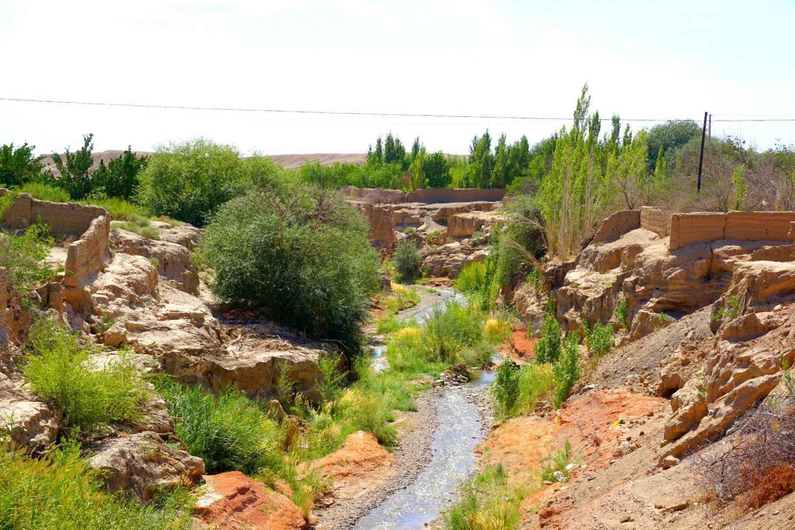 Die Straße war frisch geteert und in einem guten Zustand. Es gab außerhalb der Stadt keinen Radweg, aber es war kaum Verkehr. Bei der Ortschaft Tugeman (吐格曼) kreuzte ein Fluss die Straße und es tat sich eine kleine grüne Oase in der sonst so trockenen Landschaft auf.