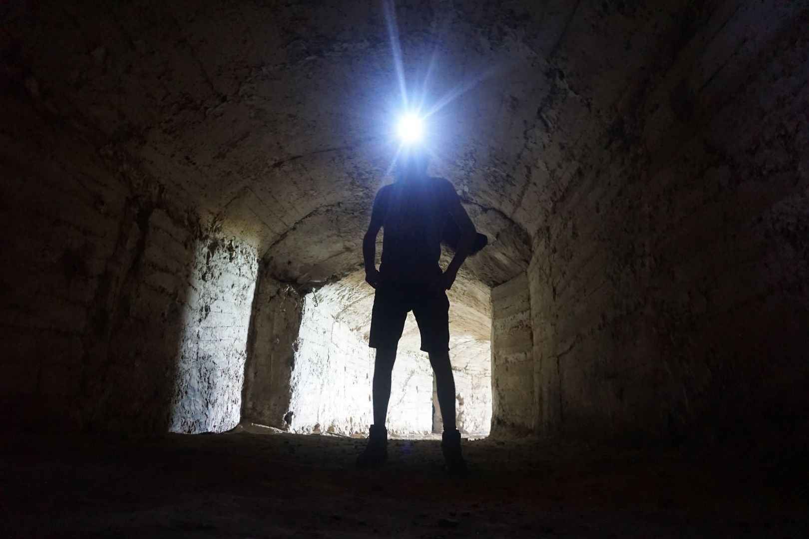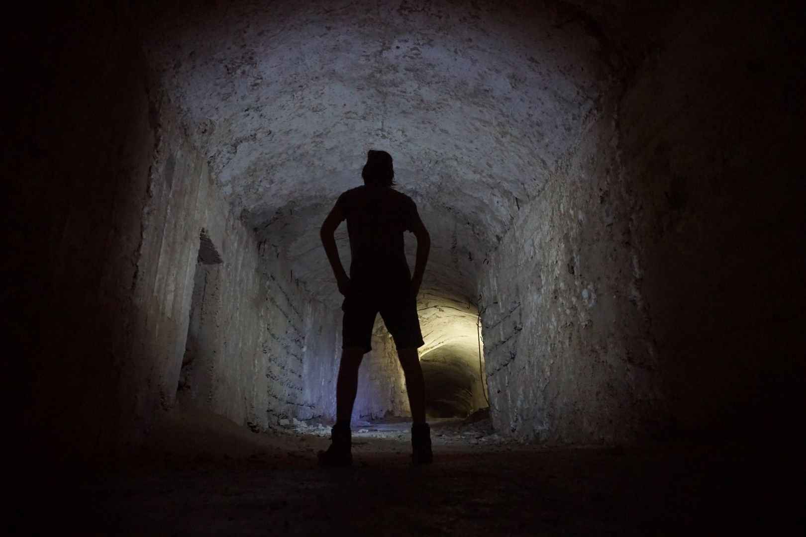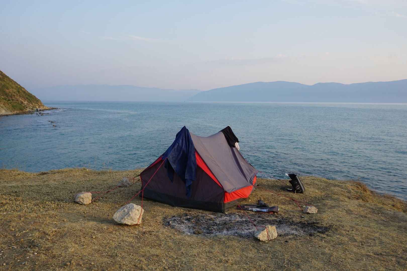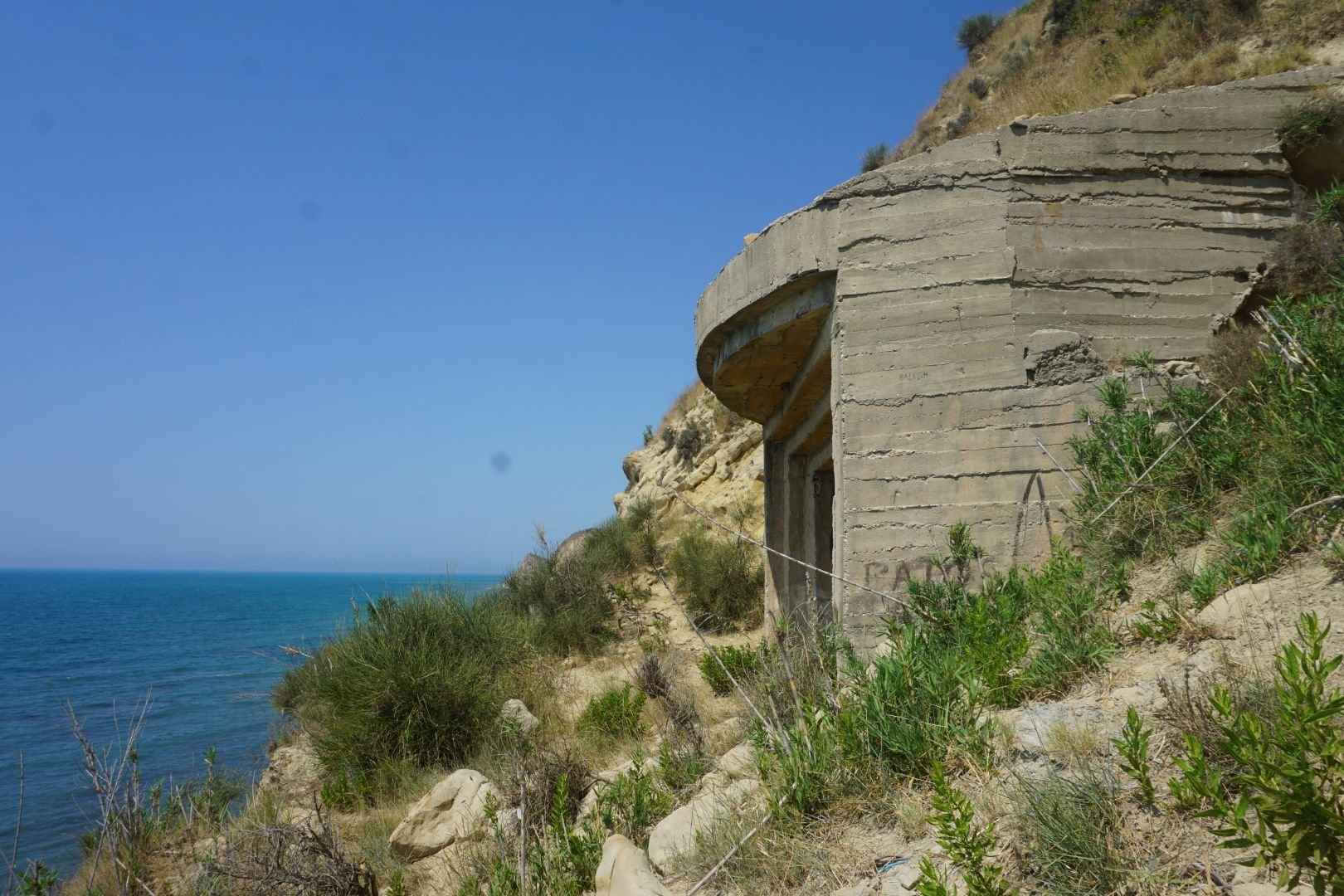 Lichtspiele in einem Bunker am Strand – Zelten an Albaniens Küste bei Vlora.