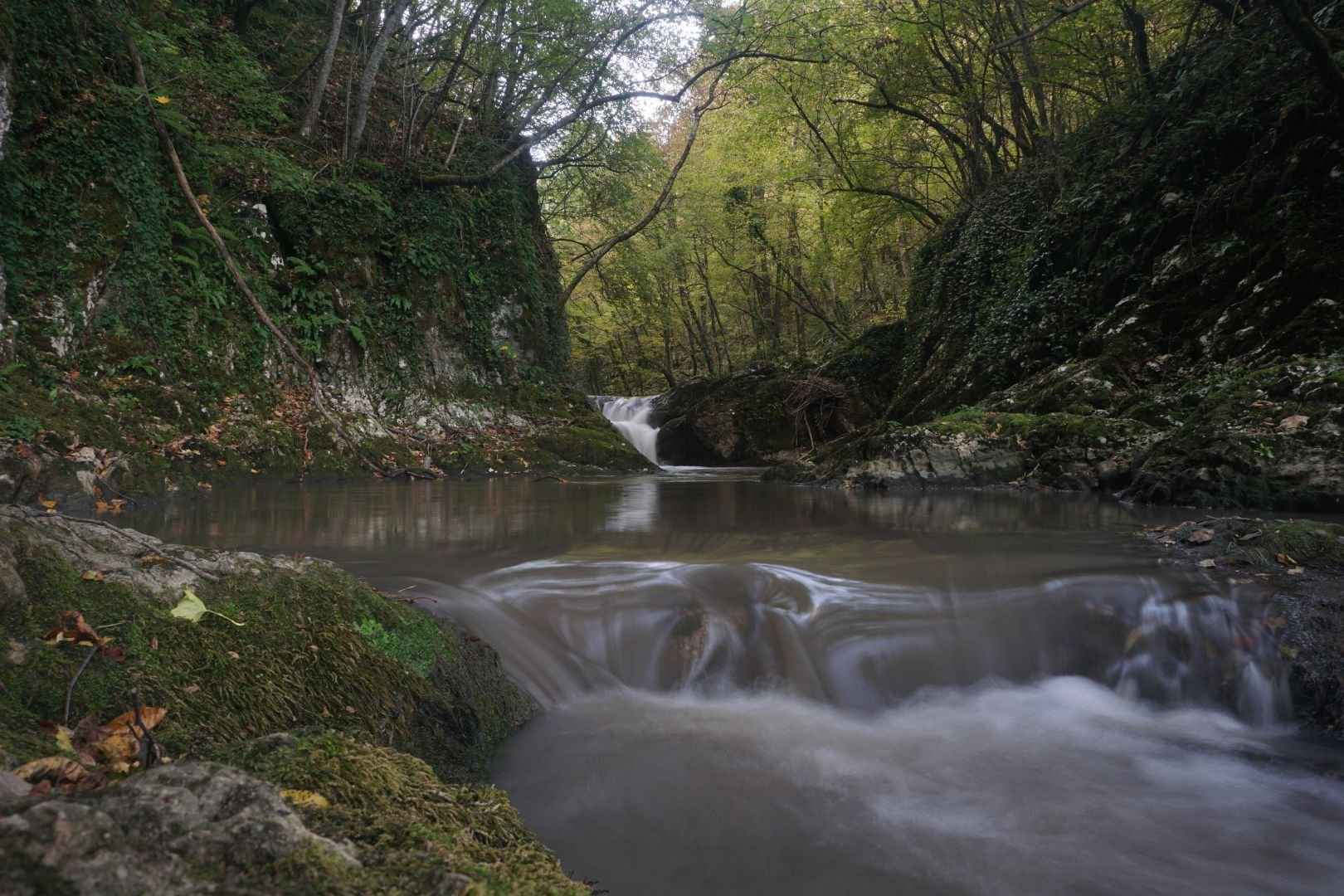 Wasser fällt in smaragdgrüne Becken – Wanderung zum Bliha-Wasserfall im Canyon bei Sanski Most.