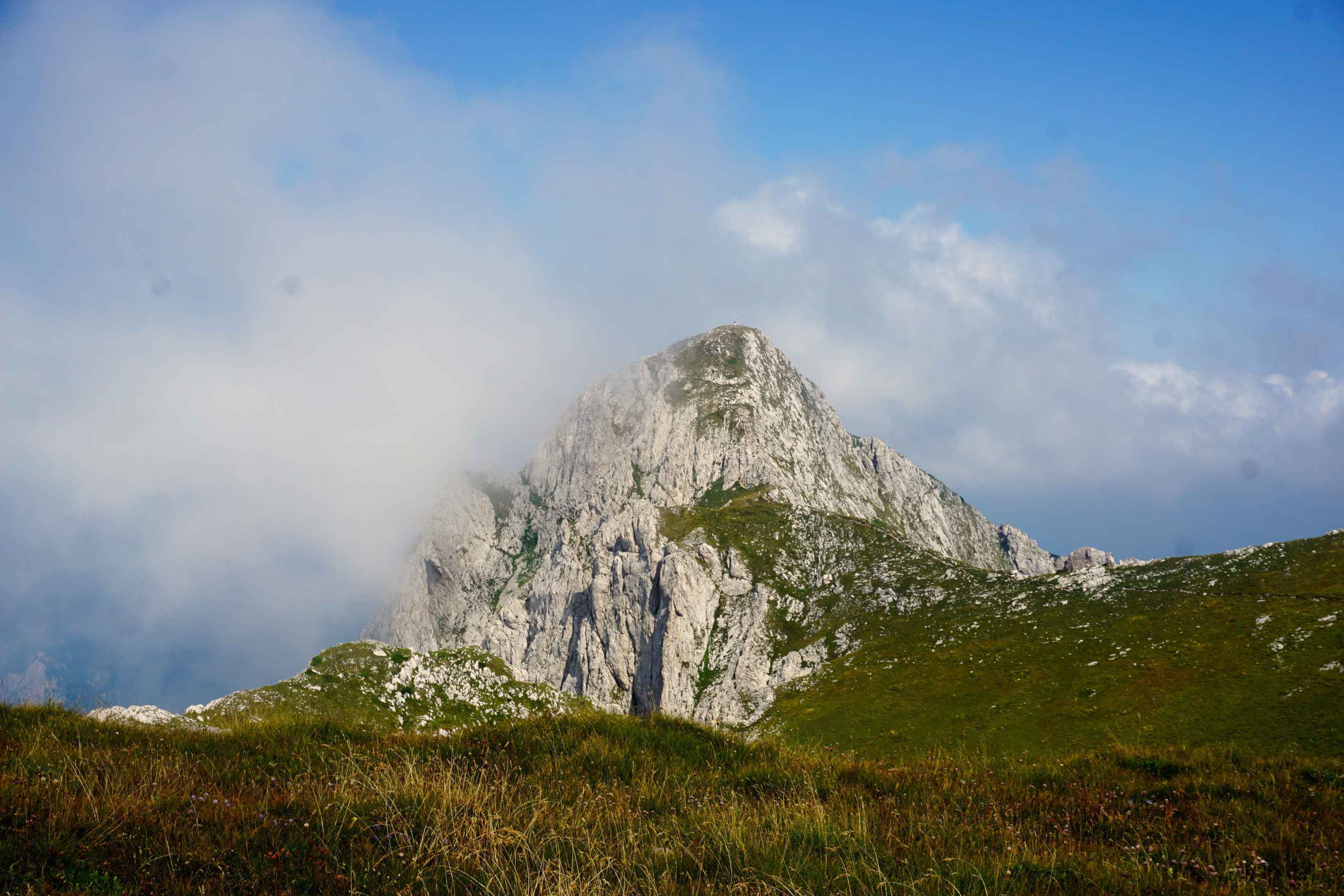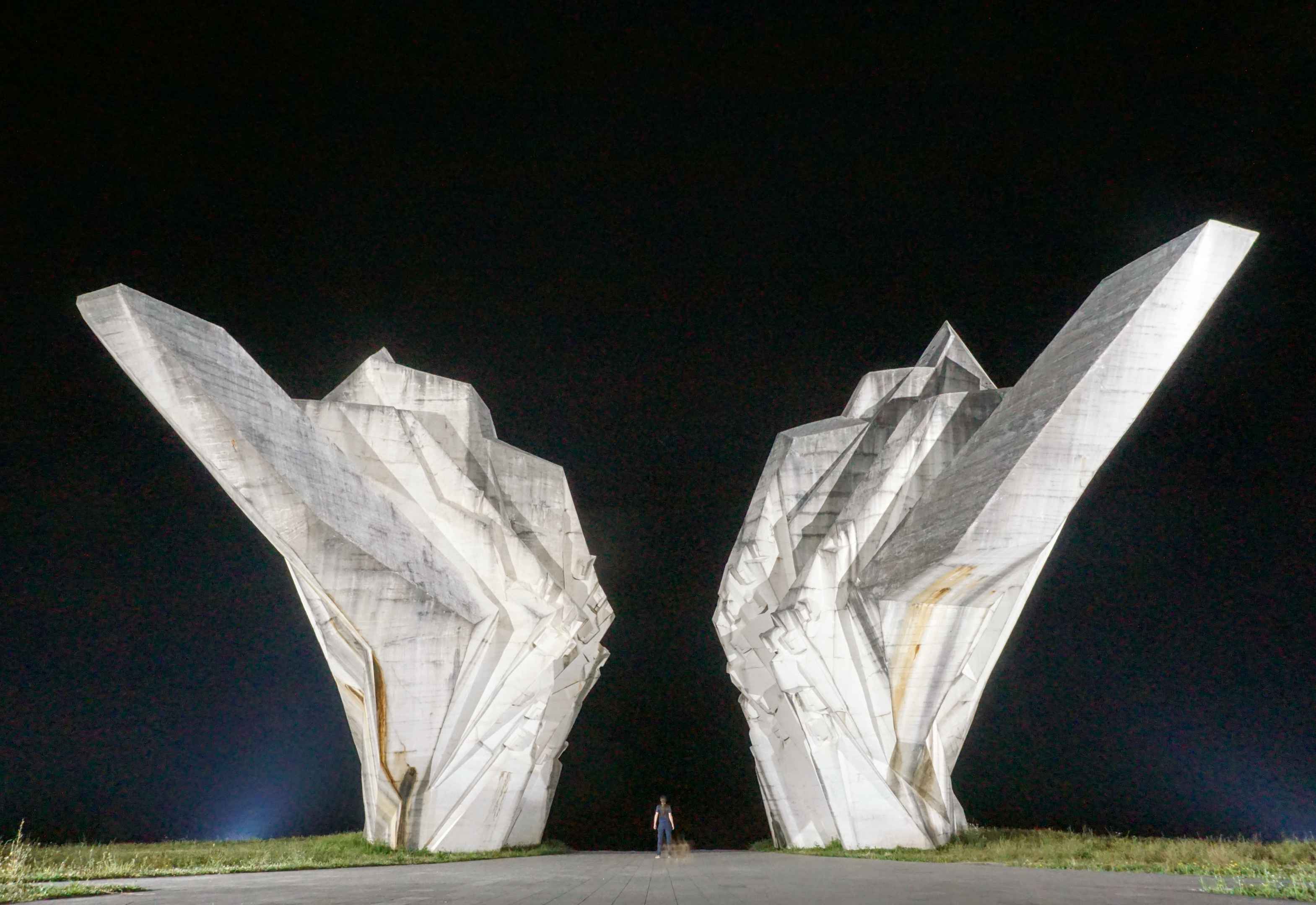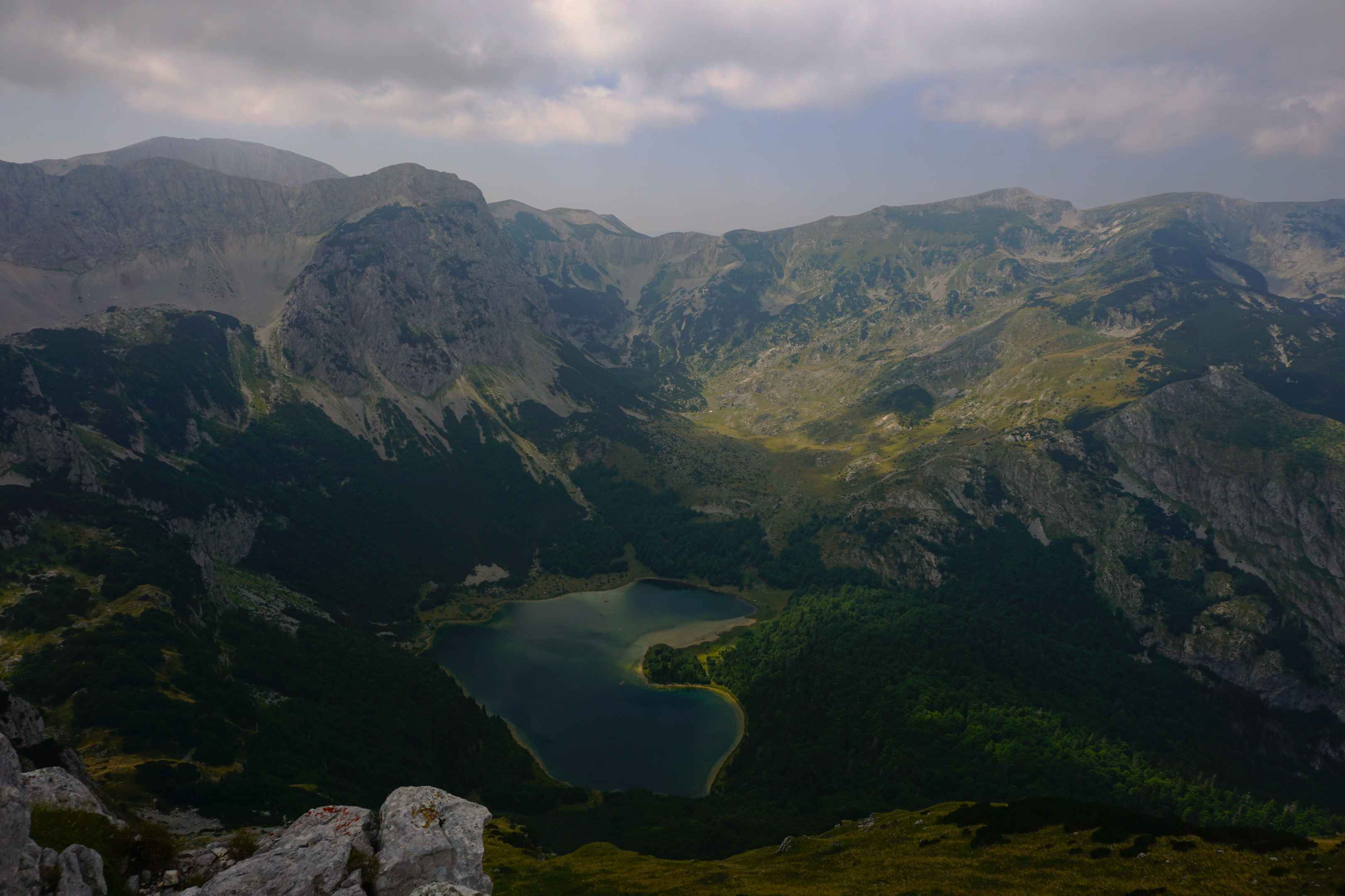 Die Ortschaft Tjentište ganz im Osten Bosnien und Herzegowinas ist berühmt für den Memorialkomplex Tjentište Spomenik, der an die heldenhafte Schlacht an der Sutjeska während des Zweiten Weltkriegs erinnert. Der Komplex, bestehend aus monumentalen Denkmälern, Gedenkhäusern und Friedhofsanlagen, rinnert an die Schlacht an der Sutjeska, die vom 15. Mai bis zum 15. Juni 1943 währte. Dieser eindrucksvolle Memorialkomplex, feierlich enthüllt im Jahr 1974, ist ein Tribut an den mutigen Widerstand und die opferbereite Hingabe der Jugoslawischen Kämpfer. Nachts ist das Denkmal hell beleuchtet und erstrahlt über das Tal auf dessen gegenüberliegender Seite sich der Sutjeska Nationalpark erstreckt. Der Nationalpark Sutjeska erstreckt sich über die Gemeinden Foča, Gacko und Kalinovik und ist der älteste Nationalpark in Bosnien und Herzegowina. Er liegt entlang der Hauptstraße Sarajevo–Foča–Tjentište–Bileća–Trebinje–Dubrovnik und erstreckt sich über eine Fläche von 17.500 Hektar. Der Park umfasst das Gebiet des Flusses Sutjeska und seiner Nebenflüsse Hrčavka und Jabučnica sowie das strenge Naturreservat Perućica. Weiterhin erstreckt er sich über Teile der Berge Maglić, Volujak, Vučevo und Zelengora. Der Maglić ist der höchste Berg des Landes und gleichzeitig die Grenze zu Montenegro. Von Tjentiste aus führt eine Straße zum Wanderparkplatz (Prijevor). An einer Schranke muss man pro Person 10 Mark Eintritt zahlen, dafür fährt man auf einer perfekt instand gehaltenen Straße auf den Berg. Spaß beiseite, dafür quält man sich mit einem VW Golf ca. eineinhalb Stunden eine von großen Schlaglöchern und Steinen übersähte zwanzig Kilometer lange Schotterpiste hinauf in der Hoffnung, dass man sich nicht den Unterboden aufreist. Dafür sind die Wanderwege im Nationalpark gut markiert. Vom Wanderparkplatz aus führt ein beschilderter Wanderweg an der Westflanke des Berges empor. Der Weg ist auf Openstreetmap verzeichnet. Es war ein sehr nebeliger Tag, weshalb wir nur eingeschränkte Sicht hatten. Der Weg ist mittelschwer, man sollte zumindest schon mal Erfahrung im alpinen Gelände gemacht haben. Zum Schluss hin wird es recht steil, doch die steilen Abschnitte sind mit Drahtseilen gesichert. Am Gipfel des 2368 Meter hohen Maglić hat das Wetter etwas aufgeklart. Auch wenn der Aufstieg über die Westwand (im Foto links) anstrengend ist, lohnt es sich für die Aussicht am Gipfel. Über einen breiten Grad läuft man zum Nachbargipfel in Montenegro, den wenige Meter höheren Crnogorski Maglić. Den Weg an der Ostflanke würde ich nur zum Aufstieg und nicht zum Abstieg empfehlen. Von dort aus konnten wir erstmalig den Trnovačko Jezero, einen Herzförmigen Gebirgssee im Tal erahnen. Der Gletschersee wird nach dem Bergmassiv des Volujak, welches ihn überschattet auch Volujačko jezero genannt. Er liegt auf einer Höhe von 1517 Metern. Mit seiner charakteristischen Herzform und sanften Ufern erstreckt er sich über etwa 800 Meter Länge und 700 Meter Breite. Mit einer maximalen Tiefe von 9 Metern. Das Gletscherwasser ist so klar, dass man bis zu 4 Meter tief den Grund sehen kann. Trotz seiner Abgeschiedenheit ist der Trnovačko jezero ein beliebtes Ziel für Wanderer und Ende August war das Wasser angenehm warm zum Baden. Besonders schön ist es in der Nacht, wenn man im See schwimmt und sich über einem die Milchstraße am Nachthimmel erstreckt. In Montenegro am See darf man nochmals zwei Euro pro Person zahlen, nur um sich am See aufhalten zu dürfen. Für weitere drei Euro darf man am gesamten West- und Südufer des Sees zelten. An einer kleinen Quelle kann man sein Trinkwasser auffüllen und es gibt mehrere Feuerstellen sowie ein Plumpsklo. Am kommenden Morgen haben wir uns auf den Weg zurück zum Wanderparkplatz gemacht und waren am späten Vormittag wieder unten im Tal. Wer nicht über die steile Westflanke aufsteigen möchte, kann auch an einem Tag zum See wandern und von dort aus am nächsten Tag zum Gipfel und zurück zum See laufen. Diese Strecke ist leichter, benötigt jedoch mehr Zeit.Karte des Sutjeska Nationalparks:
