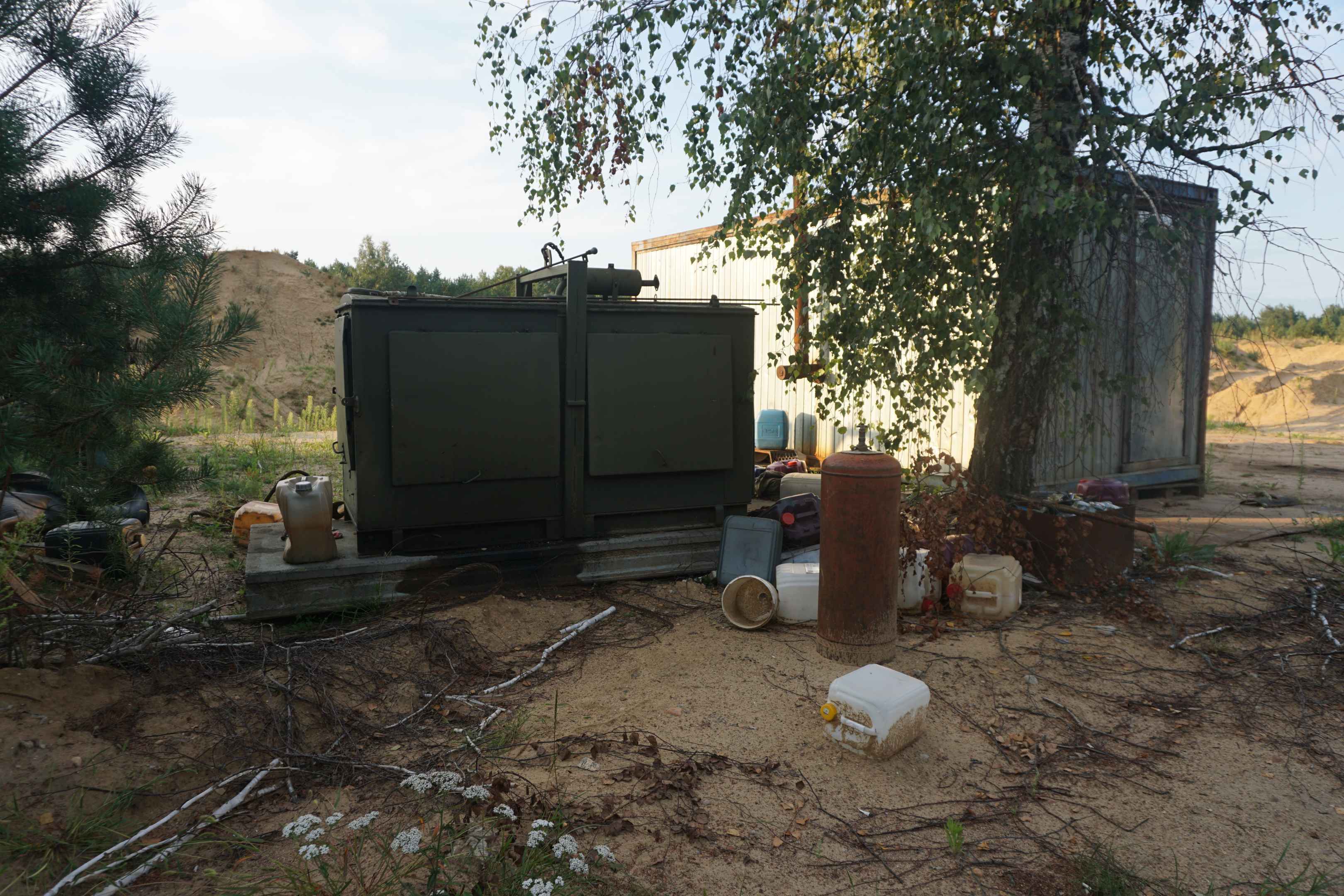 Nachdem das Lager stillgelegt wurde, begannen lokale Schrottsammler die Anlage zu zerlegen und alles wertvolle mitzunehmen. Am Rande des Geländes steht ein Baukontainer, ein Stromaggregat, leere Benzinkanister und Gasflaschen für Schweißgeräte.