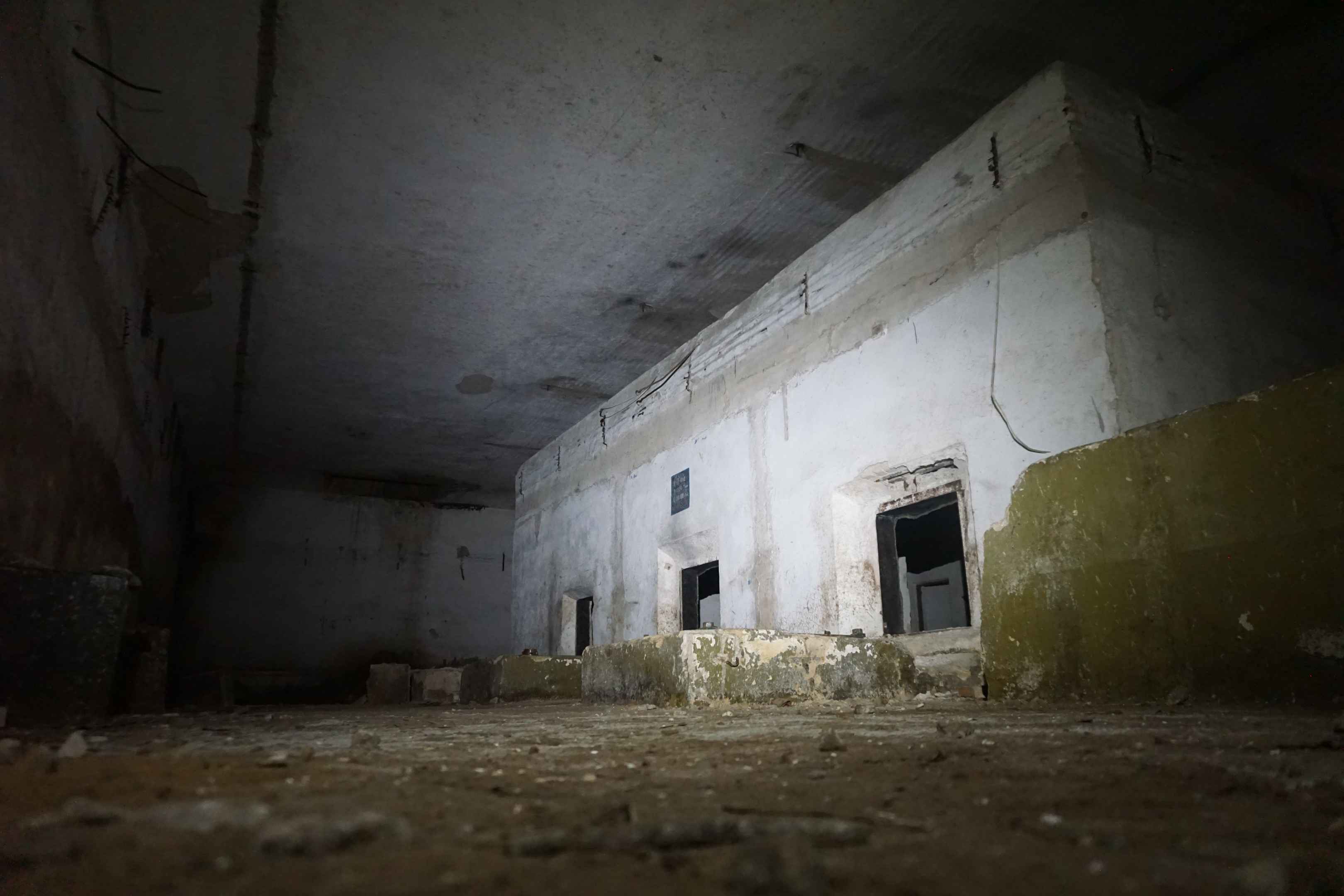 Das Herzstück des Bunkers bildet der Pumpenraum. Hier liefen die Pipelines, die den Treibstoff führten, zusammen. Auf jedem der Betonsockeln stand einst eine Pumpe. Es riecht sehr stark nach Diesel. Der Boden ist Öldurchtränkt.