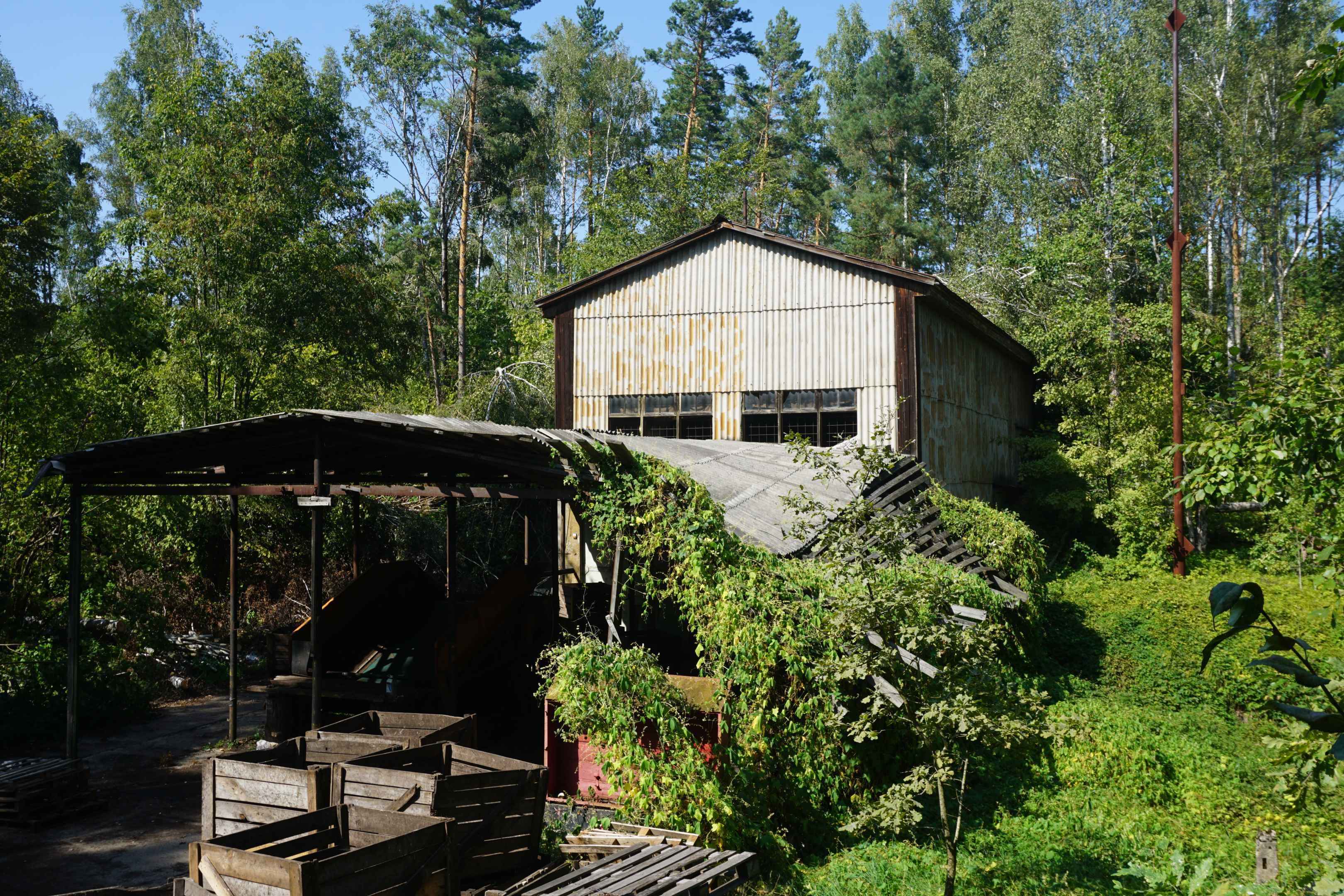 Der Außenbereich besteht aus einer überdachten Entladerampe. Für den Transport schweren Geräts gab es Schienen auf dem Gelände. Das Dach ist halb eingestürzt und mit Kletterpflanzen überwuchert. Der Außenbereich wird für die Lagerung von leeren Gemüsekisten für die Landwirtschaft verwendet.