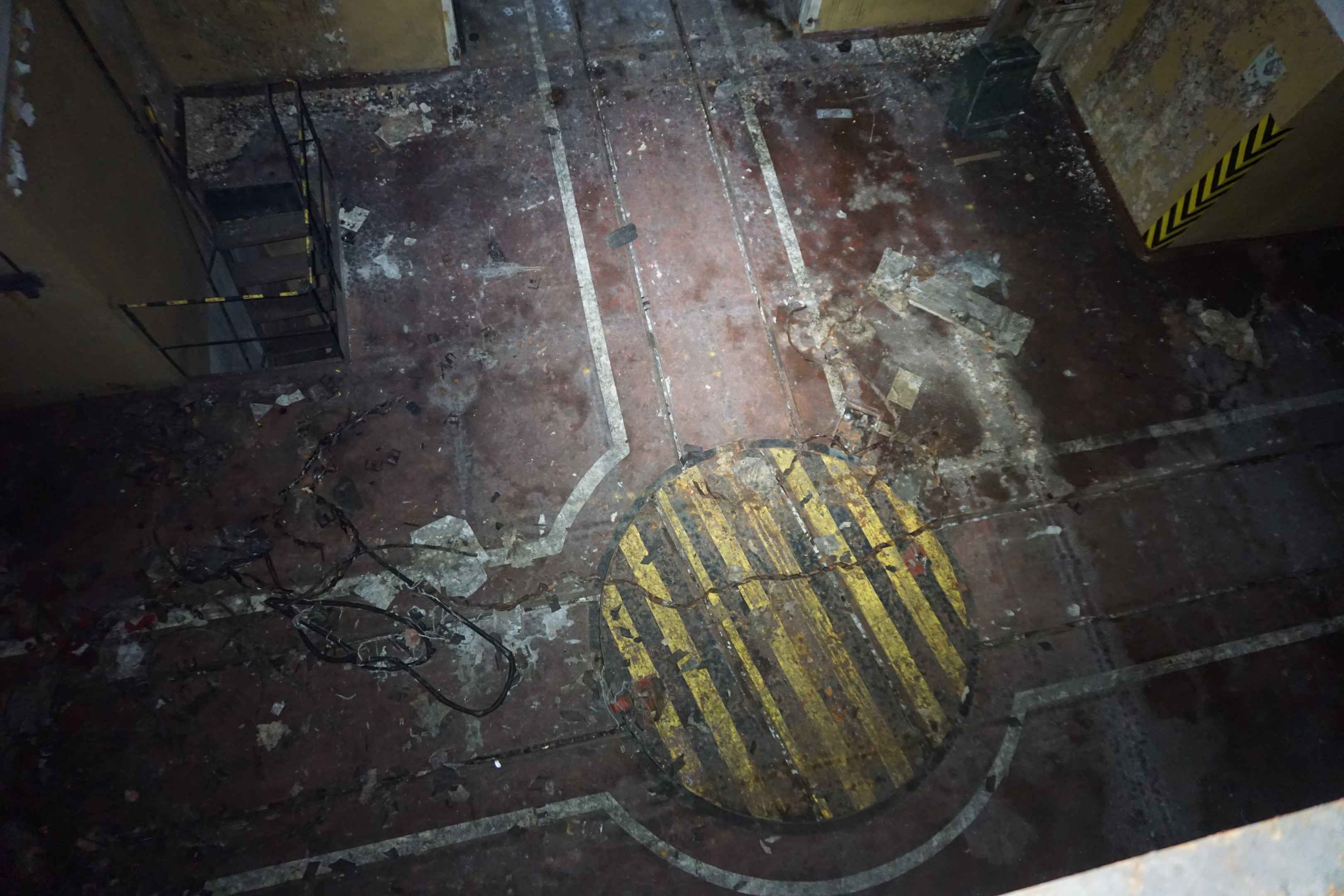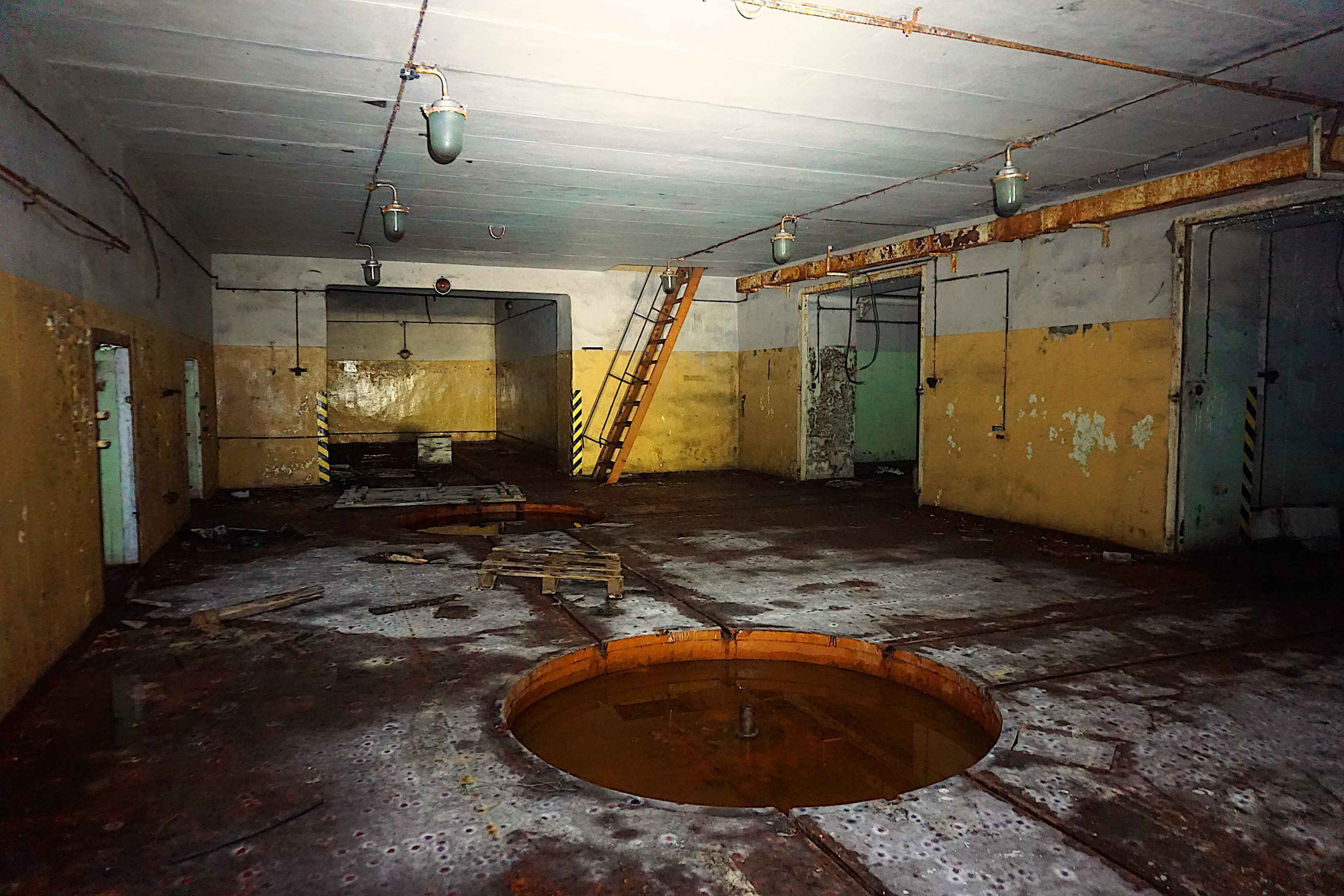 Zwei der Drehtische fehlen, Wasser tropft von der Decke und bildet Pfützen am Boden. Im Bunker ist es angenehm kühl. Die Wände im Bunker waren bis zu einer Höhe von 2 m Grün oder Gelb gestrichen. Von der Haupthalle zweigen wieder drei Lagerhallen ab. Eine rostige Metallleiter führt ins Obergeschoss, links zweigen zwei kleine Türen zu den Büroräumen und zum technischem Equipment ab.