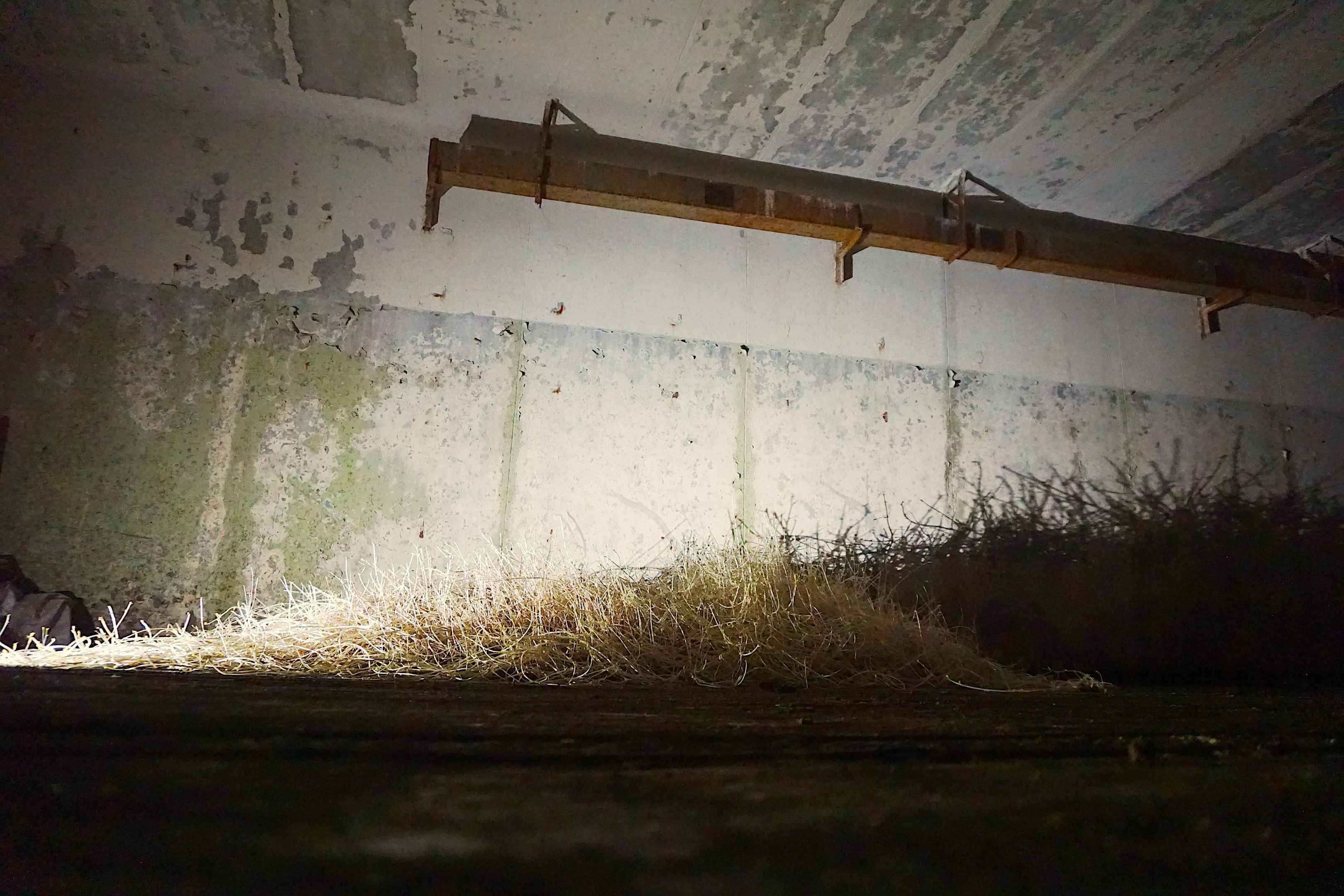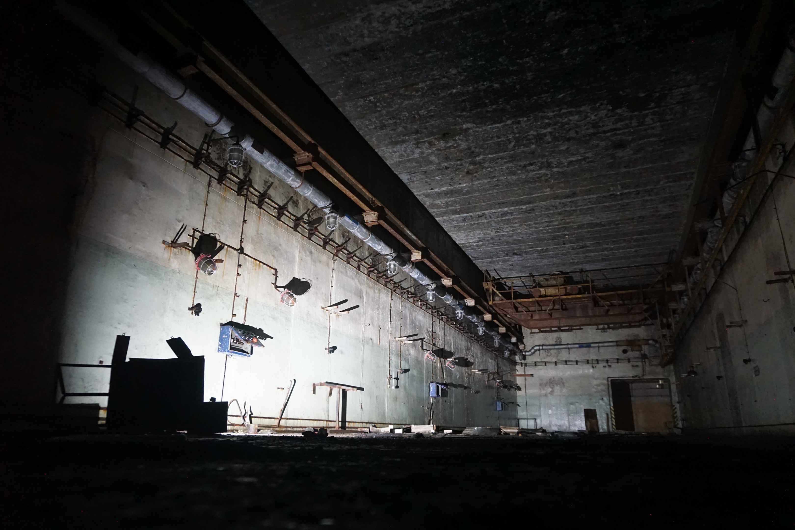 Wir betreten nun die längliche Haupthalle des Bunkers Nr. 3. Hier wurden die Atombomben zusammengebaut und Wartungsarbeiten durchgeführt. Ein großer Schwerlastkran überspannt die Decke des Raums. Vereinzelt fliegen ein paar Fledermäuse durch den Raum. Je links und rechts befand sich eine Reihe an Natriumdampflampen. Die Schienen führen durch die Halle hindurch in den hinteren Bereich des Bunkers, in dem die Sprengsätze gelagert wurden.