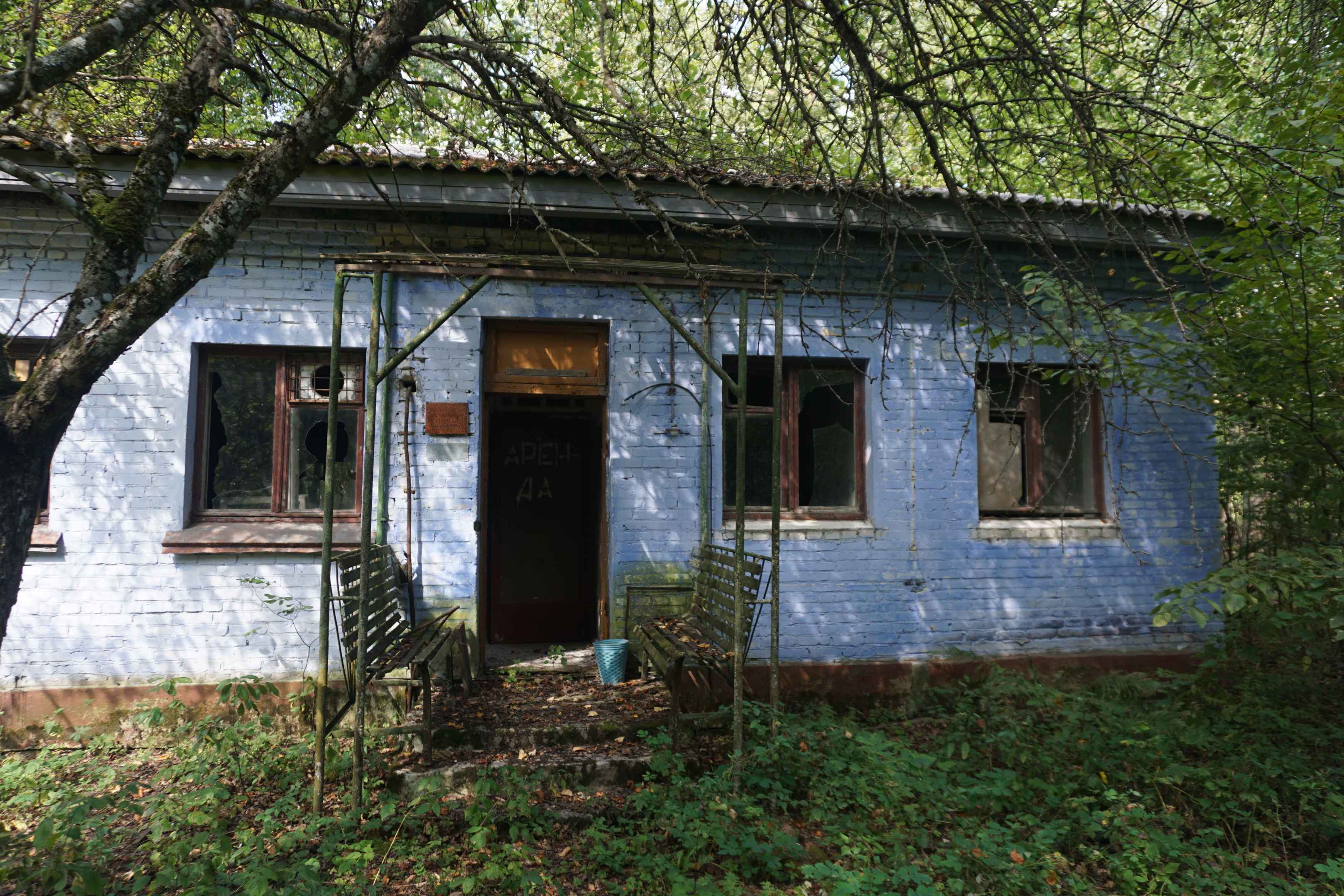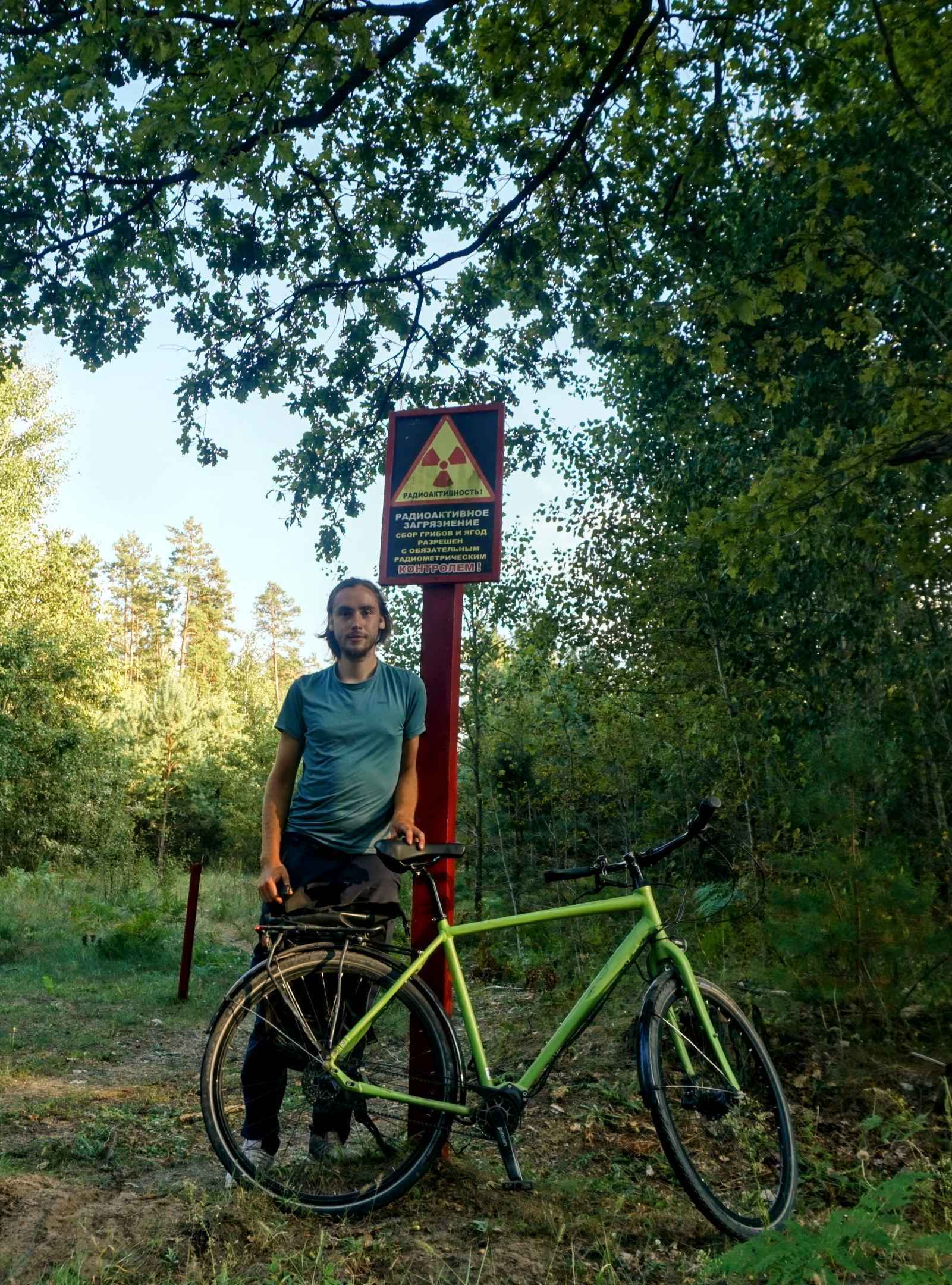 Im Gelände um die Bunker stehen Warnschilder: "Radioaktive Kontaminierung - Pilze- und Beerensammeln strengstens verboten - Kamerakontrolle!" Wir befinden uns etwa 90 km nördlich vom Kraftwerk Chernobyl, in dem es 1986 zum GAU kam. Hier regnete ein Teil des Fallouts nieder, die Strahlung ist jedoch heutzutage so gering, dass man sich hier gefahrlos aufhalten kann. Im einem der Bunker jedoch, in dem die Atombomben zusammengebaut wurden, war die Strahlung leicht erhöht.
