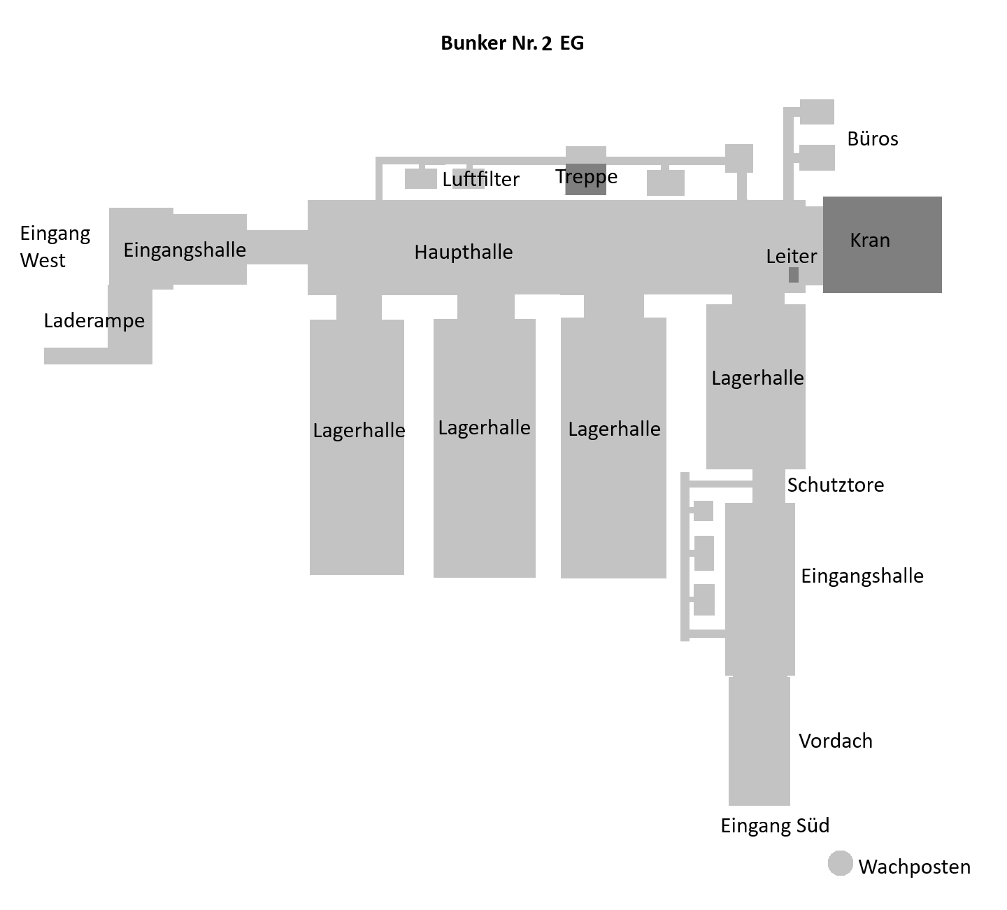Der Bunker unterteilt sich grob in drei Bereiche: Die zwei Eingangsbereiche, zwei große Haupthallen, in denen die Arbeiten an den Atomsprengköpfen (BBCHs) durchgeführt wurden und sieben Lagerhallen für die sichere Aufbewahrung der Sprengköpfe. Ich habe aus dem Gedächtnisprotokoll einen groben Grundriss gezeichnet: