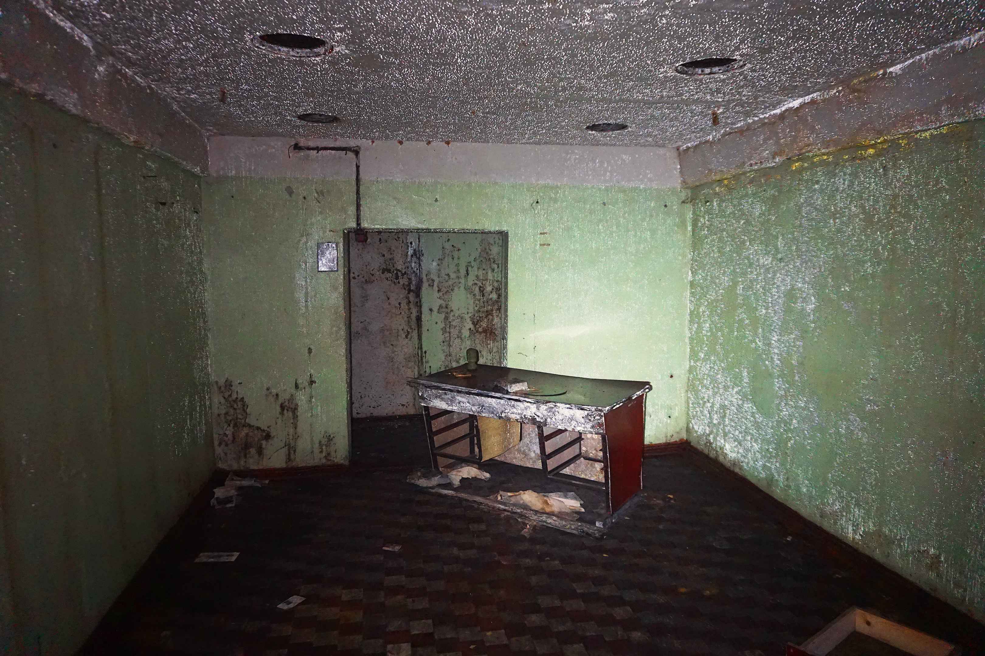 Ich betrete eines der Büros. Die Decke und Wände glitzern von den Wassertropfen, die das Kondenswasser bildet. Es riecht leicht modrig. Ab und zu hört man es plätschern wie in einer Tropfsteinhöhle. Der Boden ist mit kleinkarierten Fließen belegt. Mitten im Raum steht ein alter Schreibtisch aus den 60er Jahren. Die Schubladen fehlen und vereinzelt liegen Dokumente herum.