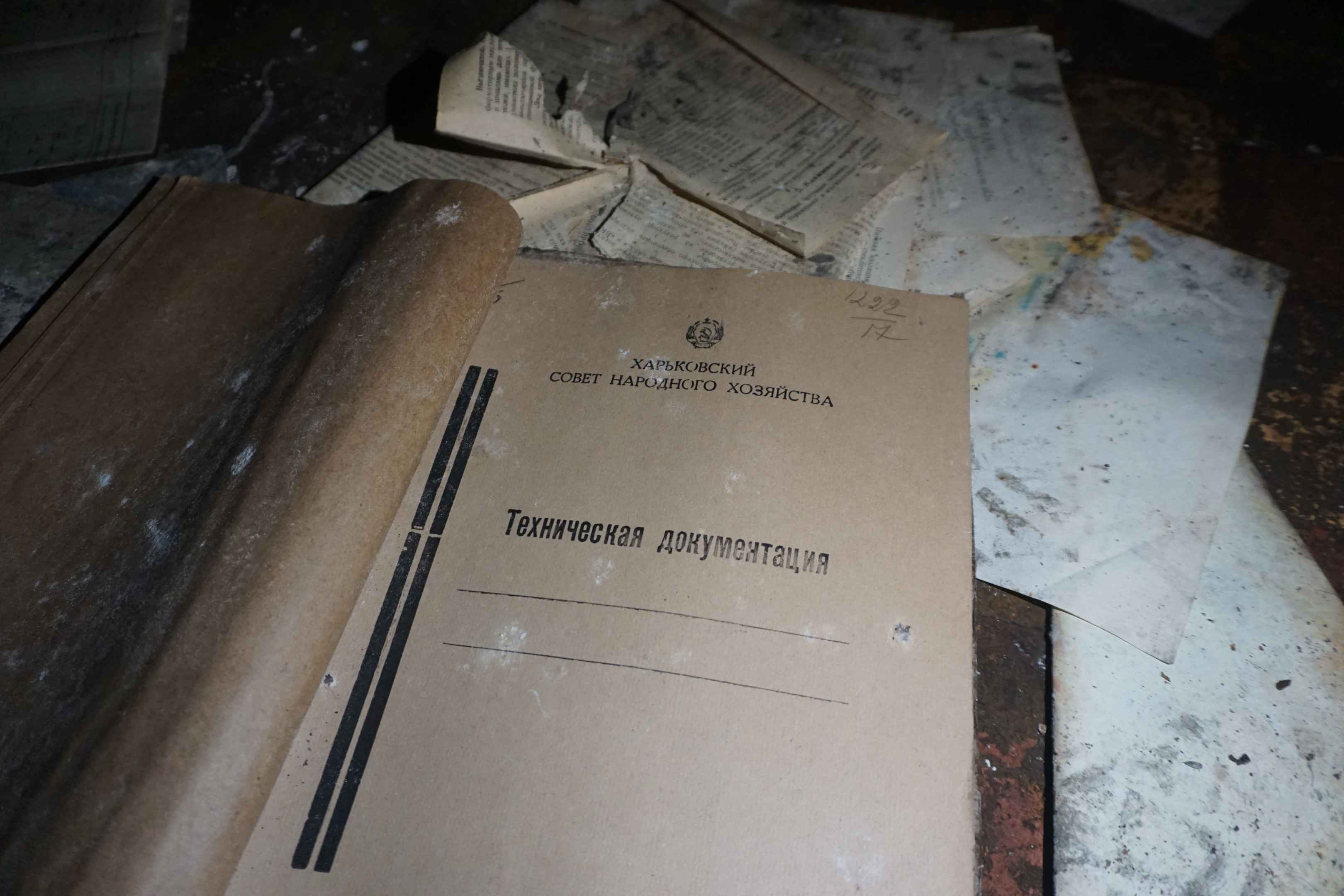 Ich schaue mir die auf dem Boden verstreuten Dokumente genauer an. Auf einer Mappe steht "Charkiw - Rat für nationale Wirtschaft - Technische Dokumentation", darüber das Wappen der Sowjetunion. Die brisanten Dokumente, welche sich mit dem Aufbau der Atombomben beschäftigen wurden entweder entsorgt oder bereits geplündert. Zurückgelassen wurden Dokumente über die Lüftungsanlagen, Maschinenequipment und konventionelle Artillerie aus dem kalten Krieg.