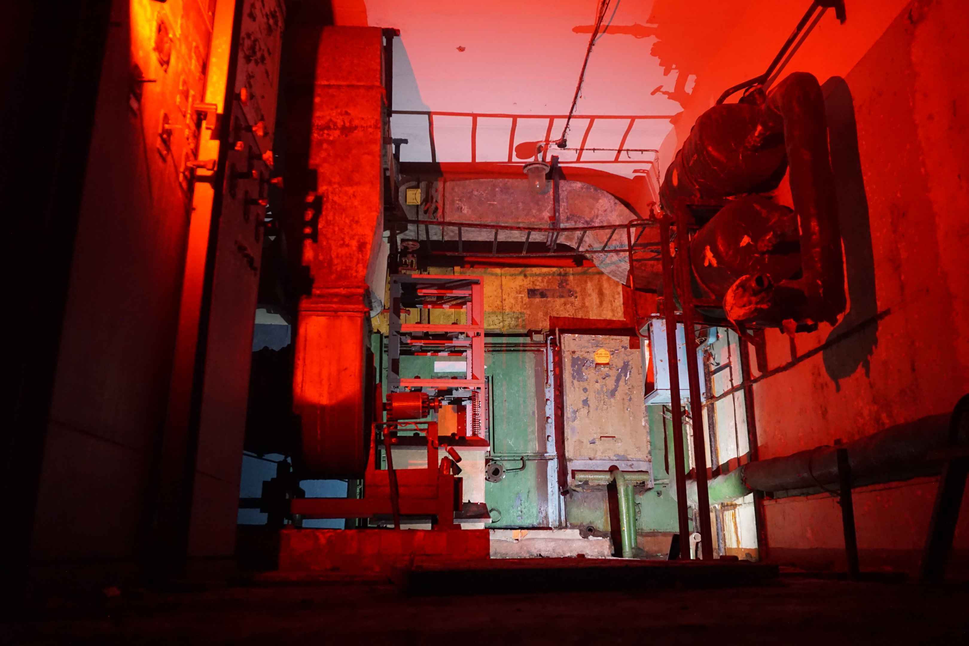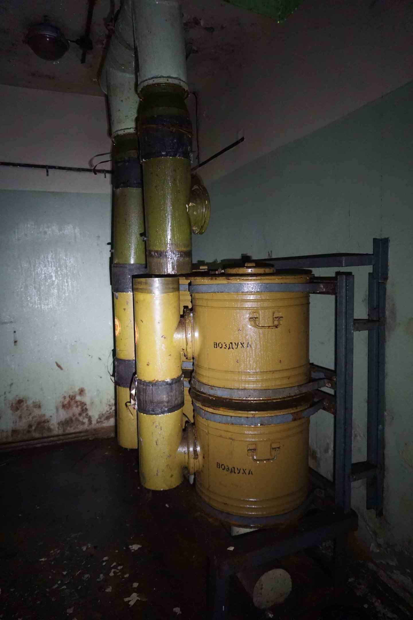 Die etwa 20 cm dicken Leitungen führen hoch ins Erdgeschoss. Dort befinden sich in einem Nebenraum große Kanister mit der Aufschrift "Luft" (Воздух).