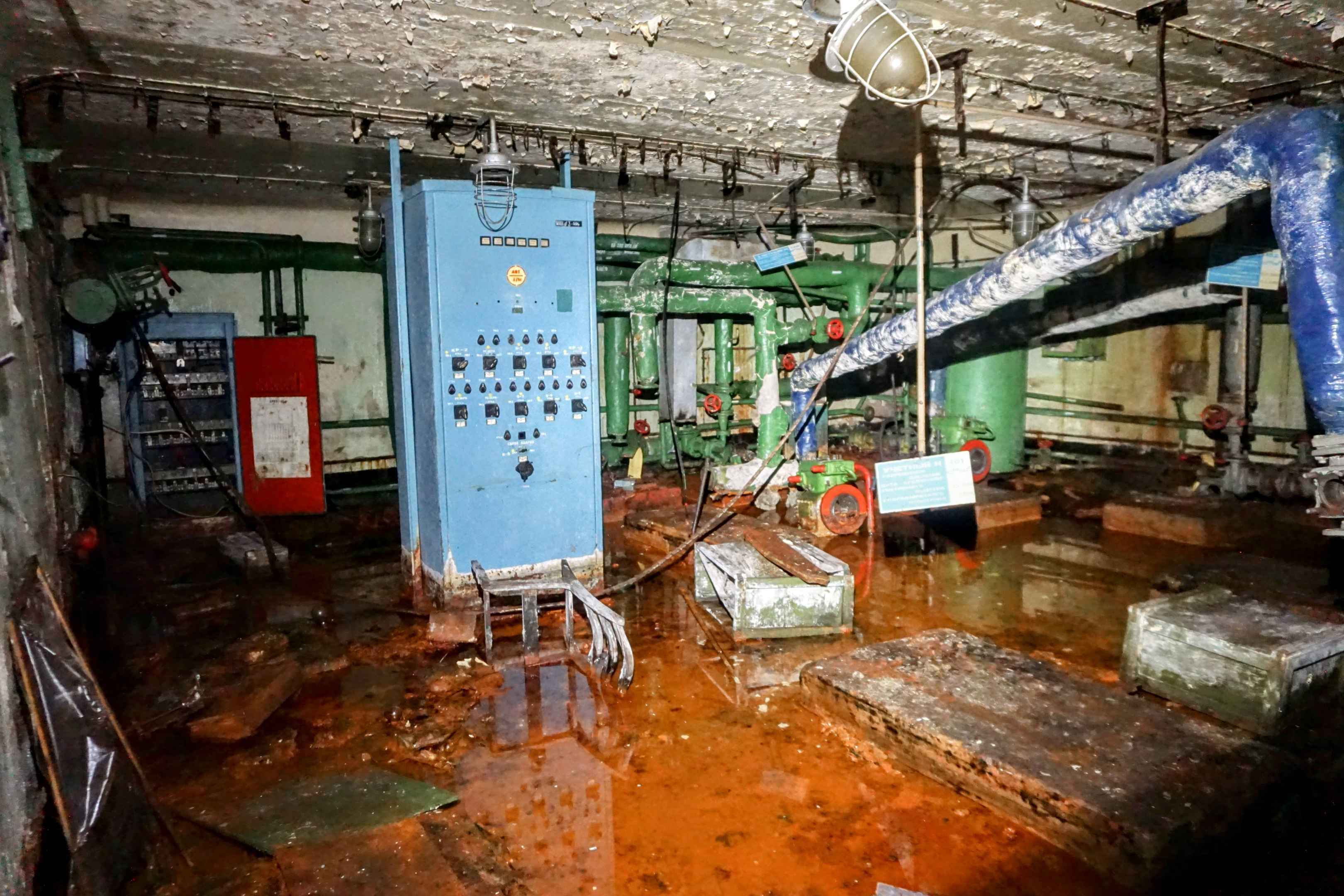 Im Keller steht etwa knöcheltief das Wasser. Überall im Raum verlaufen isolierte Rohre für die Heizung und Klimaanlage. Auf Betonpodesten stehen Pumpen und Schaltschränke. Dazwischen liegen quer im Raum verteilt mehrere morsche Holzkisten. Der Putz bröckelt von der Decke.
