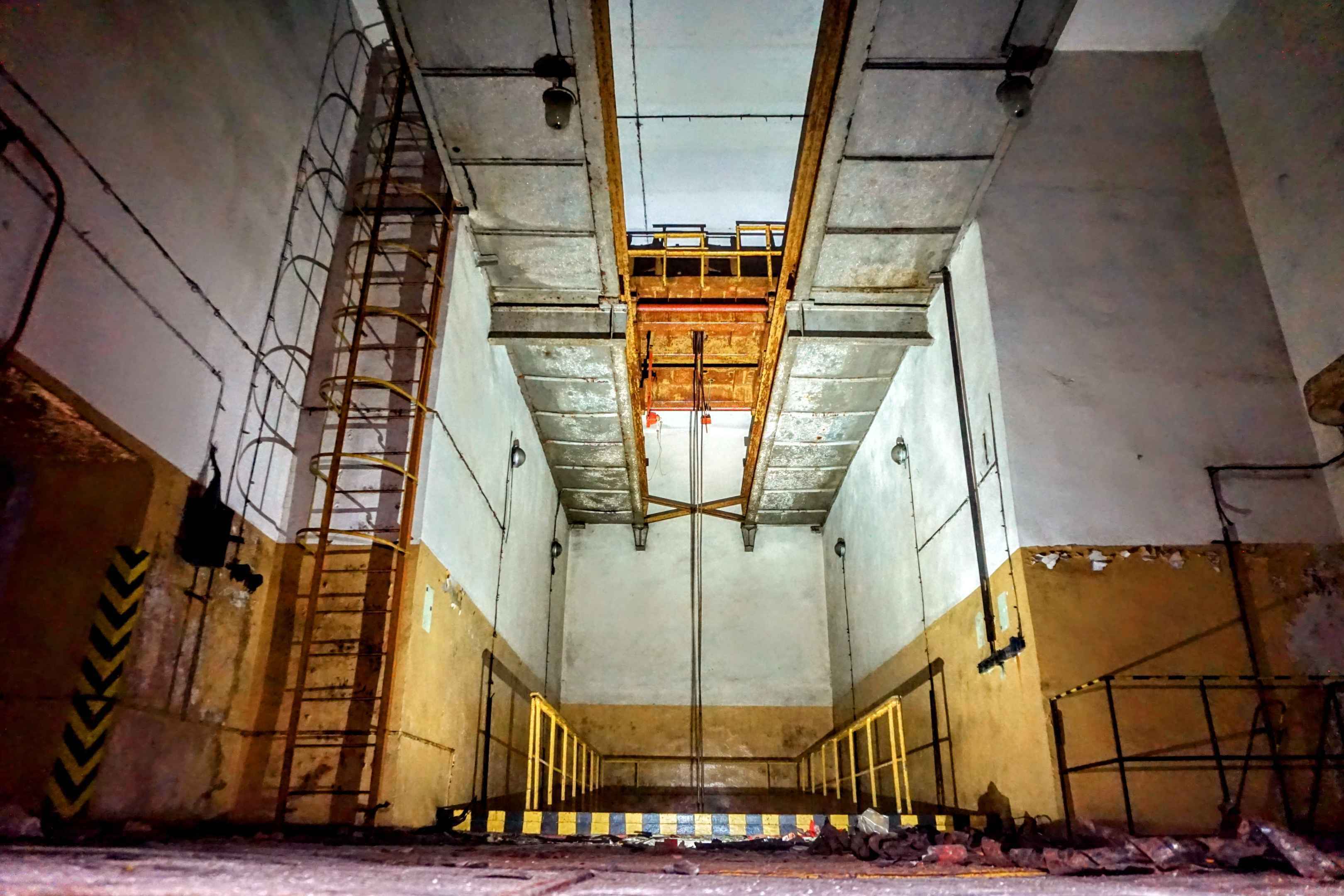 Wir befinden uns nun am Bunker Nr. 2. Dieser erstreckt sich über drei Stockwerke: Die Eingänge befinden sich im Erdgeschoss. Ein Kran führt ins Obergeschoss, in dem es weitere Lagerräume gibt. Zusätzlich gibt es im hinteren Bereich Räume für Büros, Luftfilter und technisches Equipment. Der Keller steht teils unter Wasser, weshalb ich ihn nicht erkunden konnte.