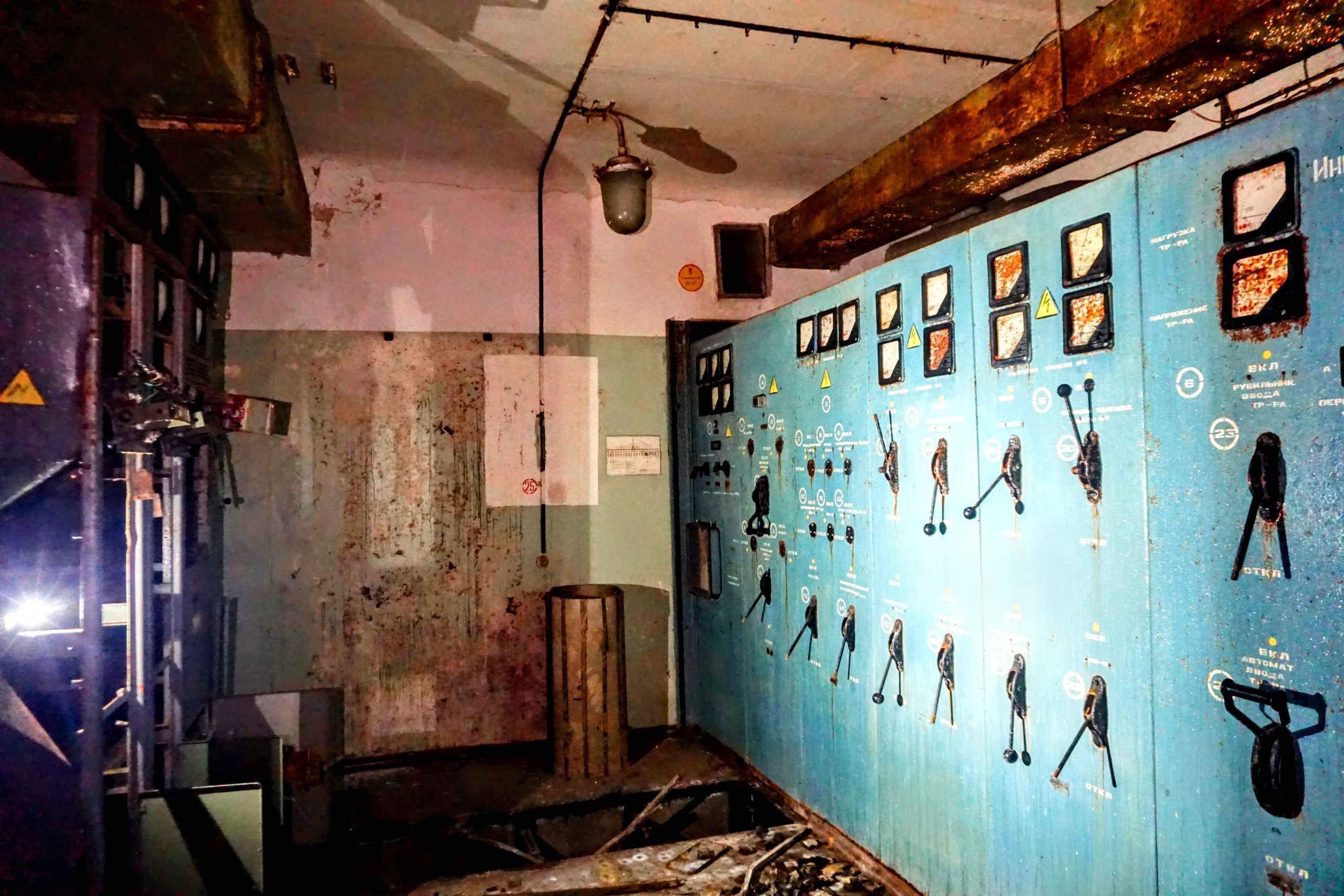 An der Wand rosten eine Reihe an 2 Meter hohen Schaltschränken vor sich hin. Hier befand sich das "Gehirn" Der Anlage. Über große schwarze Hebel und Drehschalter konnten die zahlreichen Pumpen, Ventilatoren und anderes technisches Äquipment zentral gesteuert werden.