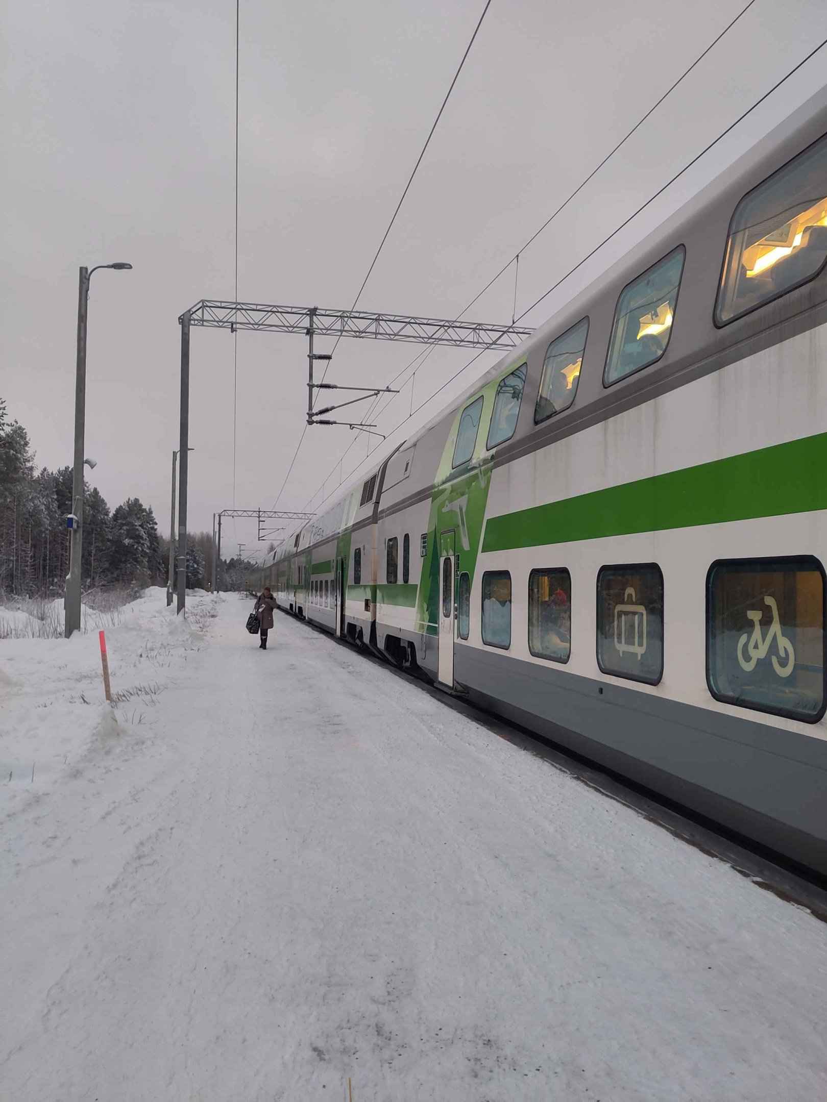 Nachdem ich bereits eine Nacht in einer Hütte in Schweden verbracht hatte, möchte ich über die Weihnachtsfeiertage eine dreitägige Hüttentour durch Lappland in Finnland machen. Aktuell gibt es keine durchgängige Zugverbindung zwischen Schweden und Finnland. Die Bahn wird in beiden Ländern etwas stiefmütterlich behandelt. Aktuell verkehren jeweils nur eine handvoll Züge täglich bis zur Grenze, drei Schwedische bis Haparande und zwei Finnische bis nach Tornio Itäinen und zwischen den beiden Grenzbahnhöfen liegen 4,6 km Fußweg. 2026 soll eine grenzüberschreitende Verbindung eröffnet werden. Ich habe deshalb den Bus über die Grenze genommen, nach gut einer Stunde Fahrt komme ich in Kemi an, von dort nehme ich den aus Helsinki kommenden Nachtzug bis nach Muurola. Der Zug ist ausgebucht, die meisten Leute sind Touristen auf dem Weg zum Weihnachtsmanndorf in Rovaniemi. In Muurola steigen nur drei Leute aus.