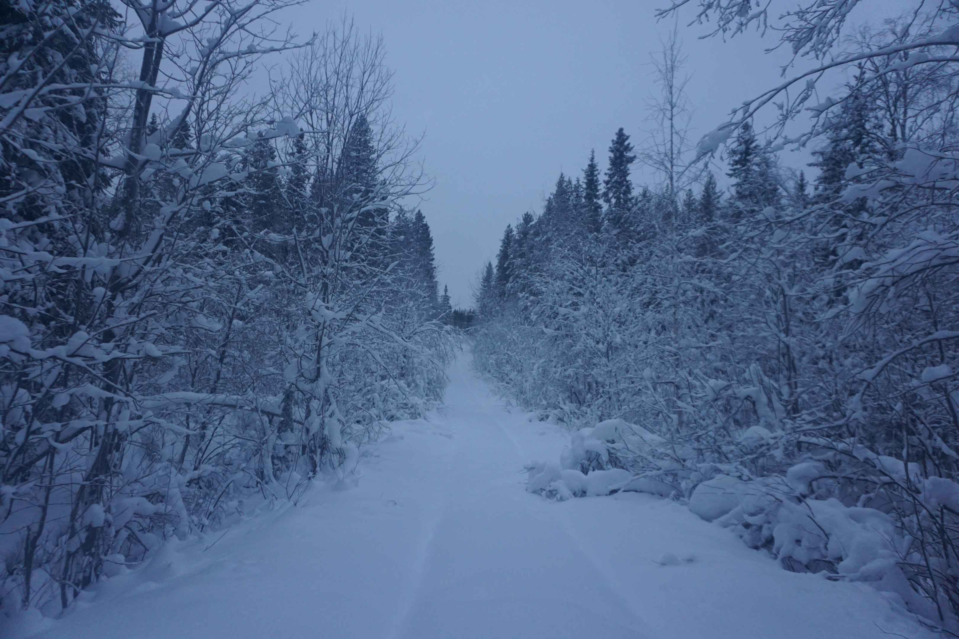 Meine heutige Tagesetappe führt mich zur Louevaara Open Wilderness Hut, gut 15 km Fußweg vom Bahnhof Muurola entfernt. Als erstes folgt man der 930 in Richtung Westen. Die 930 ist eine sehr gering befahrene Straße, es lässt sich dort sehr gut laufen. Nach etwa 8 km zweigt ein Feldweg Richtung Norden ab. Ich habe meine Schneeschuhe angeschnallt und kämpfe mich durch den Pulverschnee und folge dabei den frischen Spuren eines Elchs.