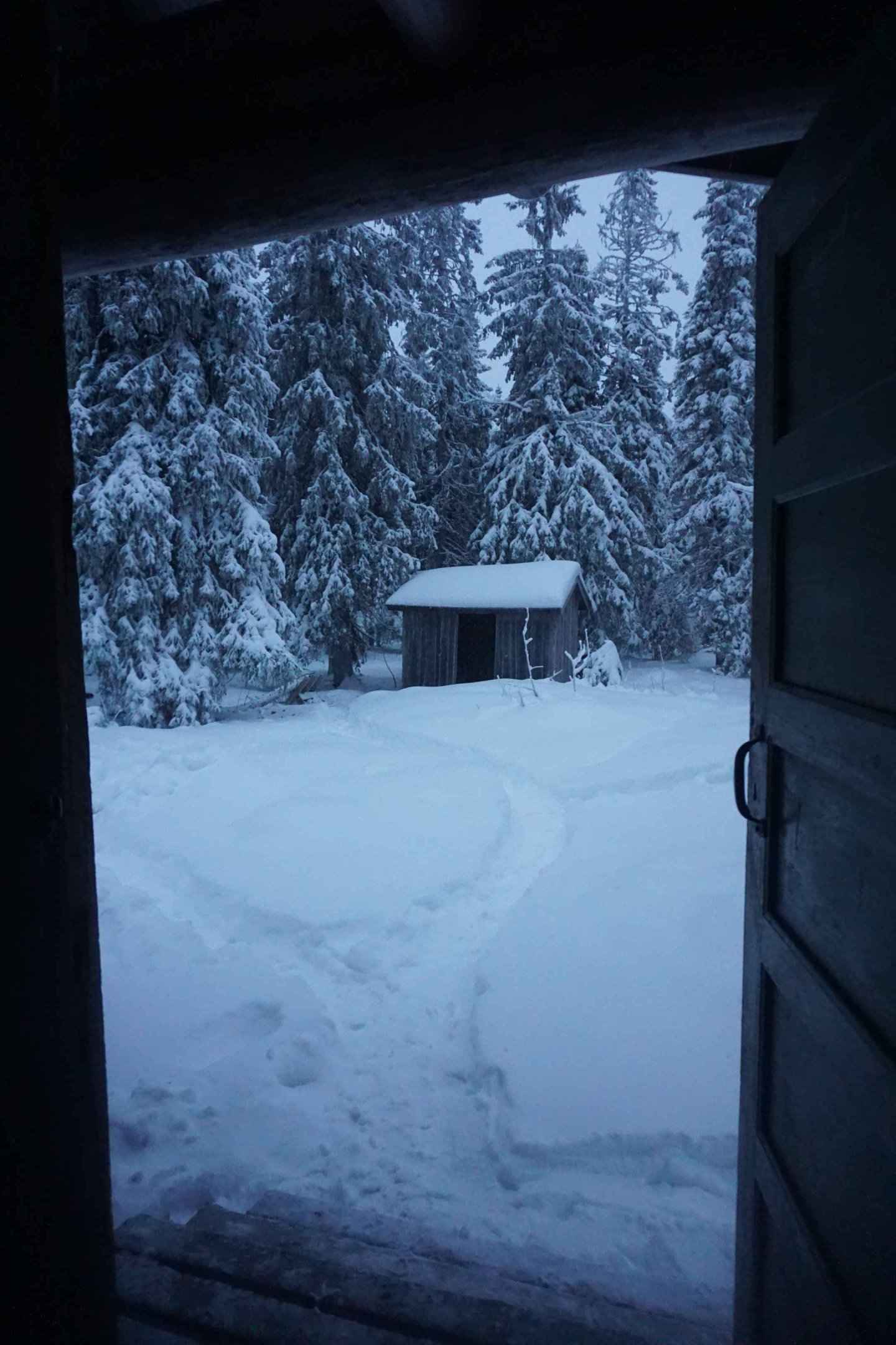 Oben gibt es eine Luke, welche in ein kleines Holzhaus führt. Es gibt Fenster in alle Richtungen, welche von Eiskristallen übersäht sind. Eine Fensterscheibe fehlt und ein kalter Wind pfeift durch das Loch. Ich blicke nach draußen. Unten sehe ich die Hütte einsam im Wald stehen und ringsherum schneebedeckte Tannen soweit das Auge reicht. In meinem Fall gut 100 Meter, bevor alles in einen grauen Schleiher aus Schnee und Eisnebel übergeht.