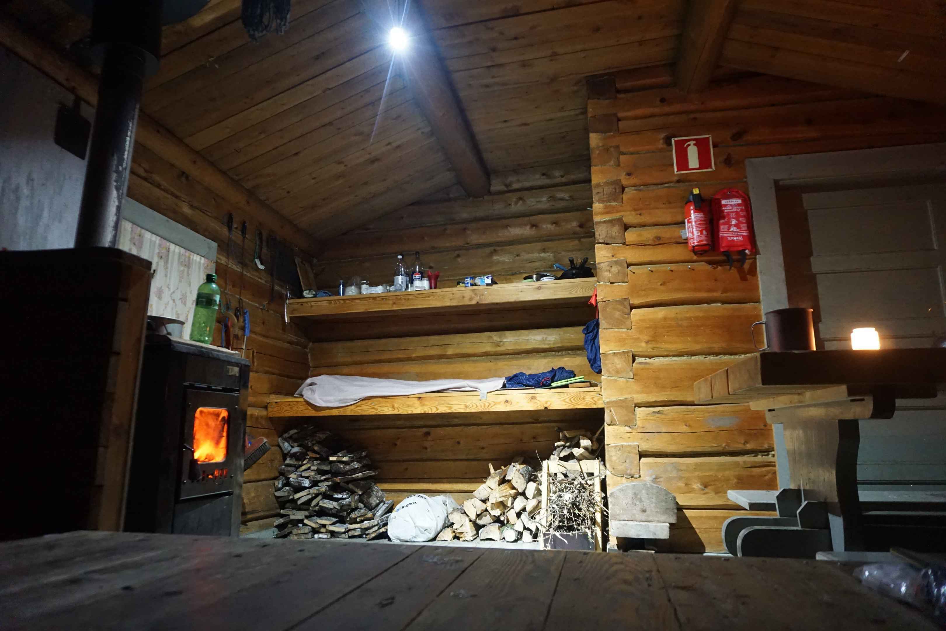 Als ich ankomme, wird es bereits wieder dunkel. Gegenüber der Hütte steht ein kleiner Holzschuppen und daneben ein Plumpsklo. Ich lade meinen Rucksack in der Hütte ab und esse eine kleine Brotzeit. Danach mache ich mich daran, Brennholz für die Nacht vorzubereiten.