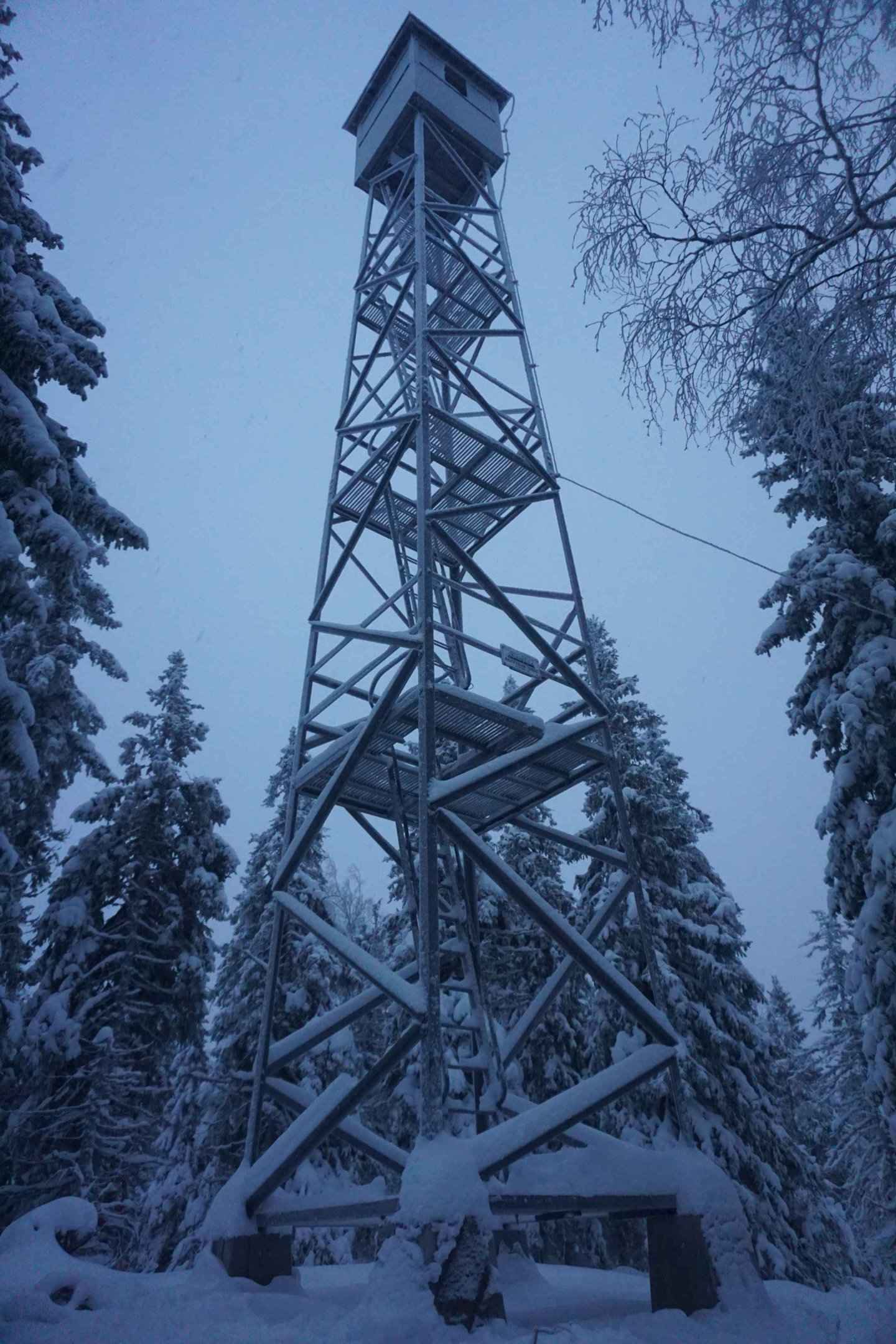 Neben der Louevaara Hütte steht ein Feuerwachtum, diesen habe ich am Vorabend aufgrund der Dunkelheit gar nicht mehr gesehen. Der Turm ist in einem wesentlich besseren Zustand als der, den ich im Sommer in Chernobyl hochgeklettert bin, dafür ist er ziemlich vereist.