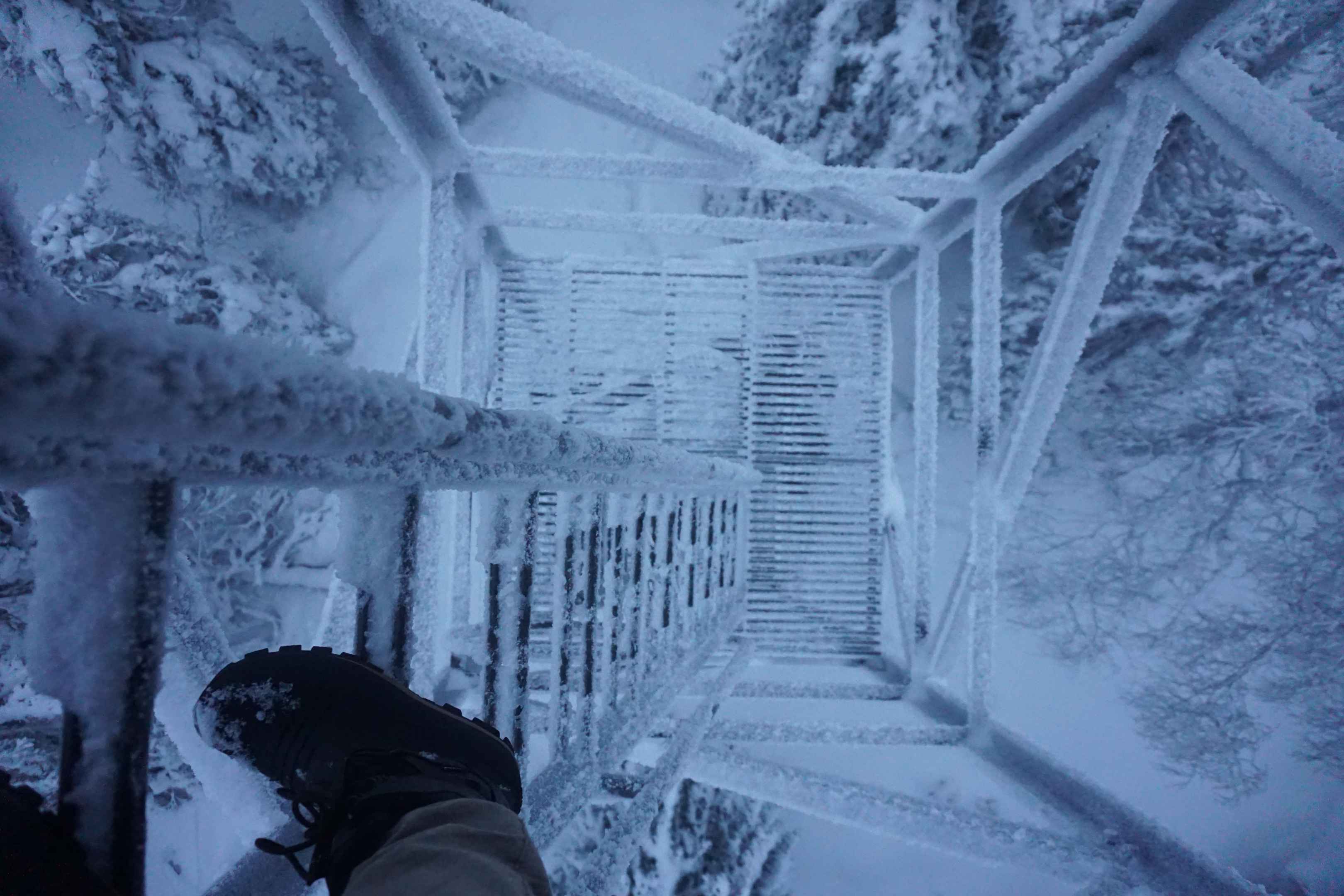 Mit der Schneeschaufel grabe ich mir einen Weg von der Hütte zum Turm frei und klettere vorsichtig die Leite nach oben. Der Turm schwankt im Wind, Eiszapfen hängen von den Sprossen der Leiter und je weiter ich nach oben klettere, desto stärker wird der Wind.