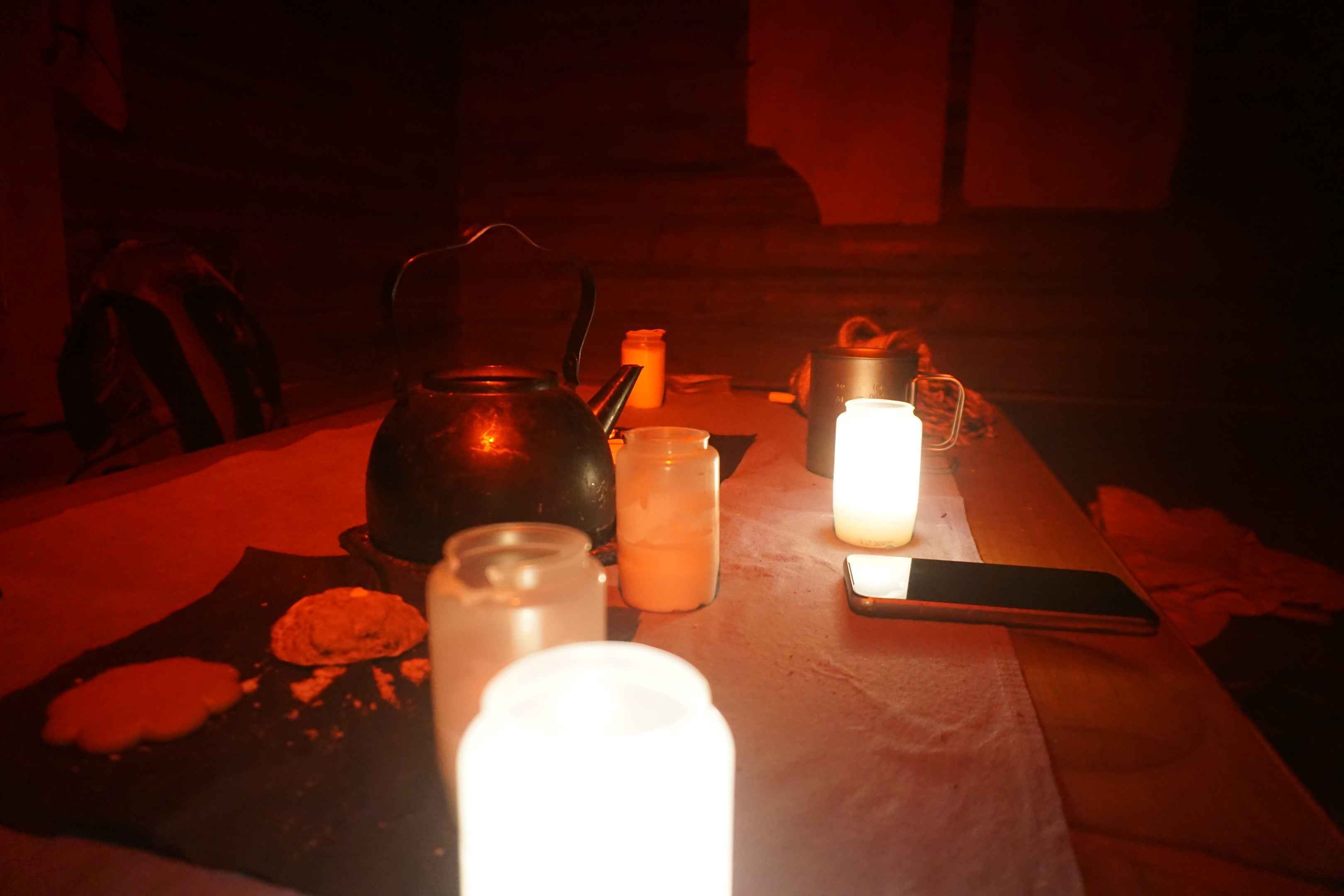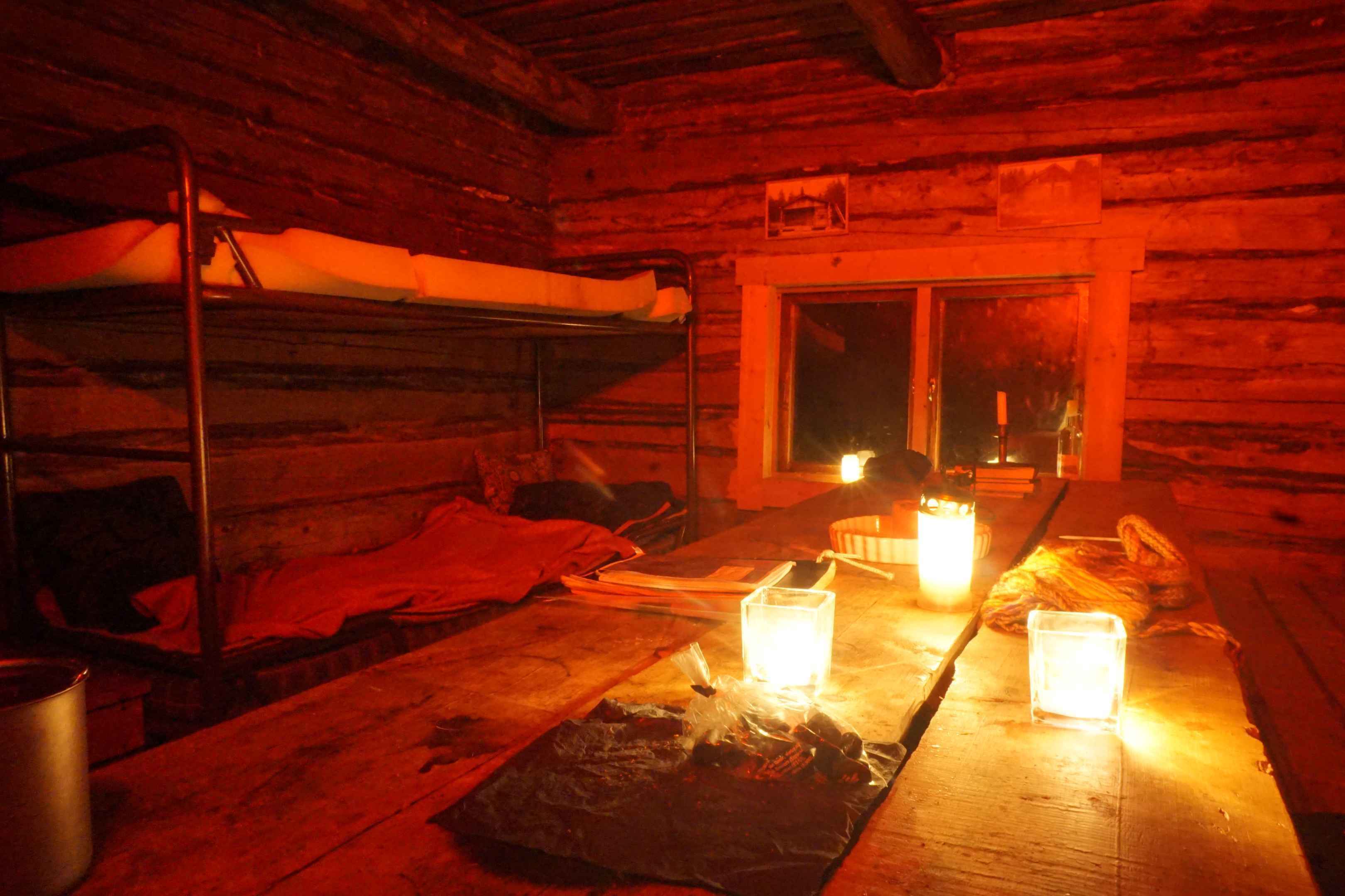 Das Holzlager der Purola Hütte wurde vor kurzem aufgefüllt und so musste ich heute kein Brennholz hacken. Ich habe ein Feuer geschürt und es mir mit meinen Kerzen in der Hütte gemütlich gemacht. In der Hütte gibt es einen großen Raum mit einem rustikalen Holztisch, eine lange Sitzbank, gegenüber ein Stockbett mit Matratzen und auf der anderen Seite im Eck einen Ofen.