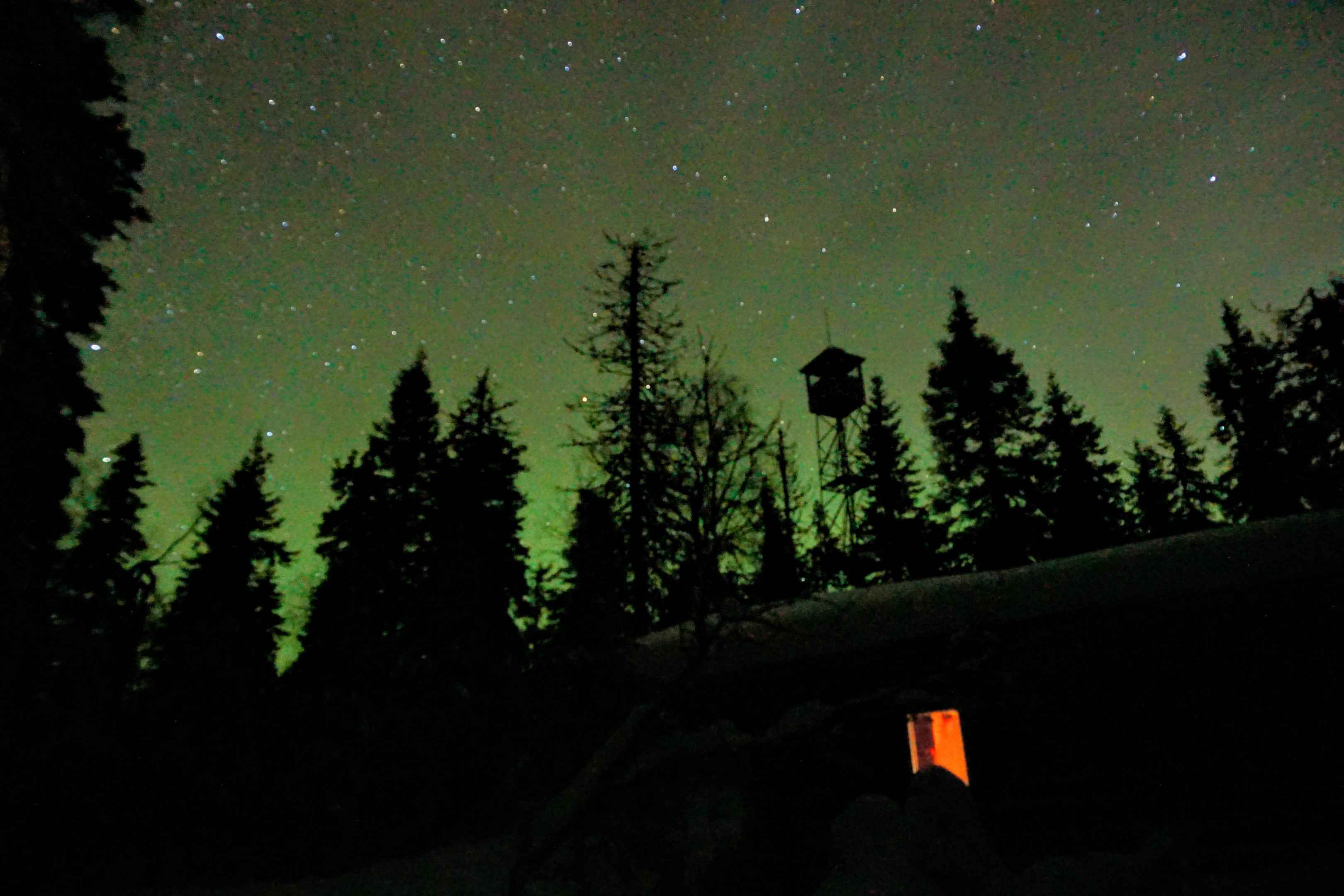 Ich habe in der Hütte kein bzw. nur ab und zu Internet, doch gegen Abend schaffe ich es, die aktuelle Polarlichtvorhersage zu bekommen. Ich nutze dazu die App Meine Polarlicht-Vorhersage. Gegen neun Uhr Abends hat der Himmel aufgeklart und gehe ich nach draußen, um mir Polarlichter anzuschauen.