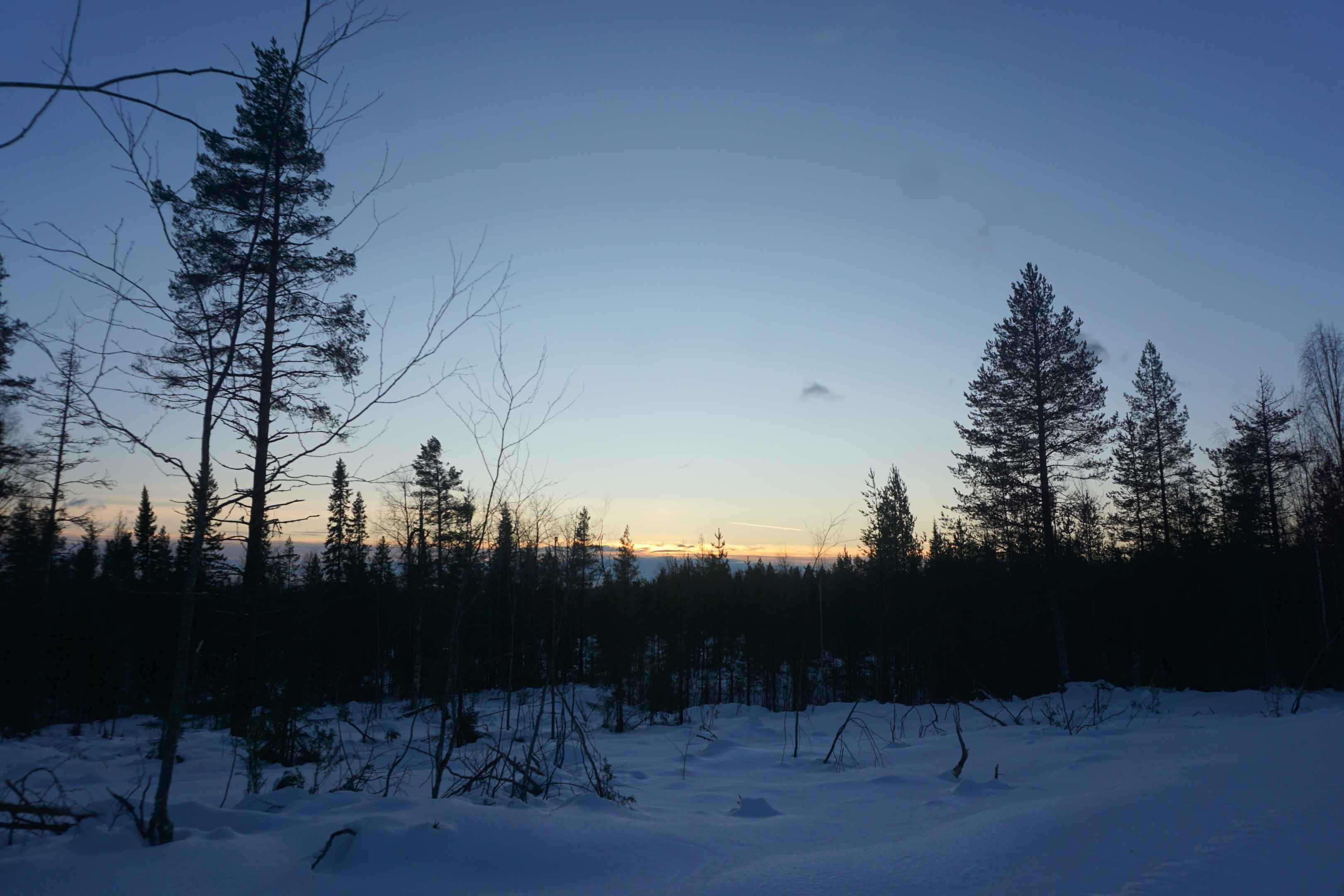 Am zweiten Weihnachtsfeiertag mache ich mich auf zur Purola Open Wilderness Hut. Aber zuerst lösche ich das Feuer und kehre den Kamin und die Hütte aus. Die Purola Open Wilderness Hut liegt etwa 14 km Fußweg entfernt. Wir befinden uns nur wenige Kilometer südlich des Polarkreises. Gegen Mittag erreicht die Sonne gerade so den Horizont, die Morgendämmerung geht fließend in die Abenddämmerung über.