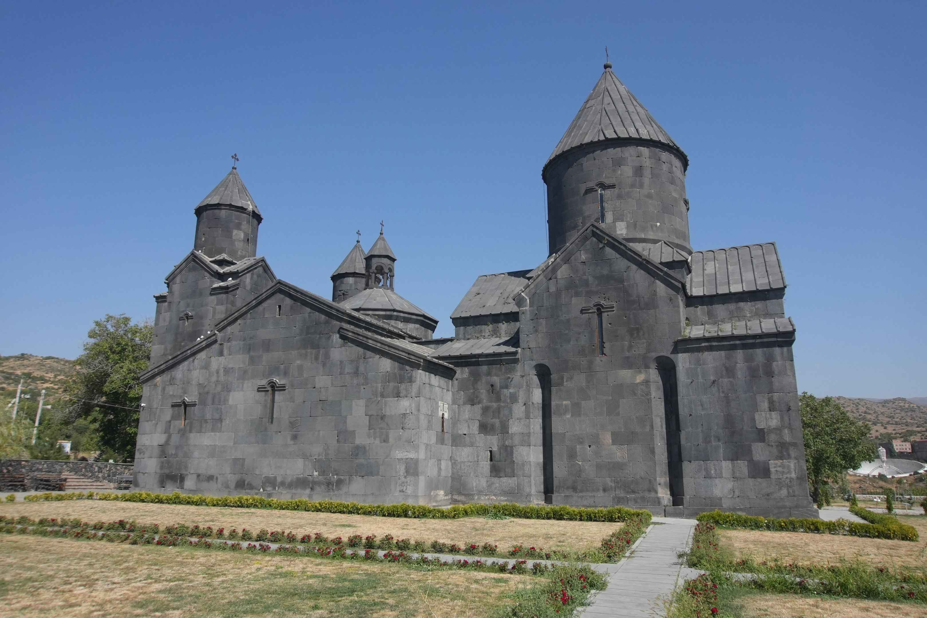 Auf dem Weg dorthin kommt man zunächst am Kloster Tegher vorbei. Es handelt sich um ein typisches armenisches Kloster, doch es fällt sofort durch sein ungewöhnliches Erscheinungsbild auf: Die gesamte Anlage ist aus dunklen Basaltsteinen gebaut. Schwarze Mauern, schwarze Kreuze und ein dunkles Dach geben dem Bauwerk ein fast bizarr wirkendes Aussehen, besonders im Kontrast zur helleren Landschaft ringsum. Von hier aus lässt sich in der Ferne bereits das Radioteleskop erkennen – klein und unscheinbar auf der anderen Seite des Tales.