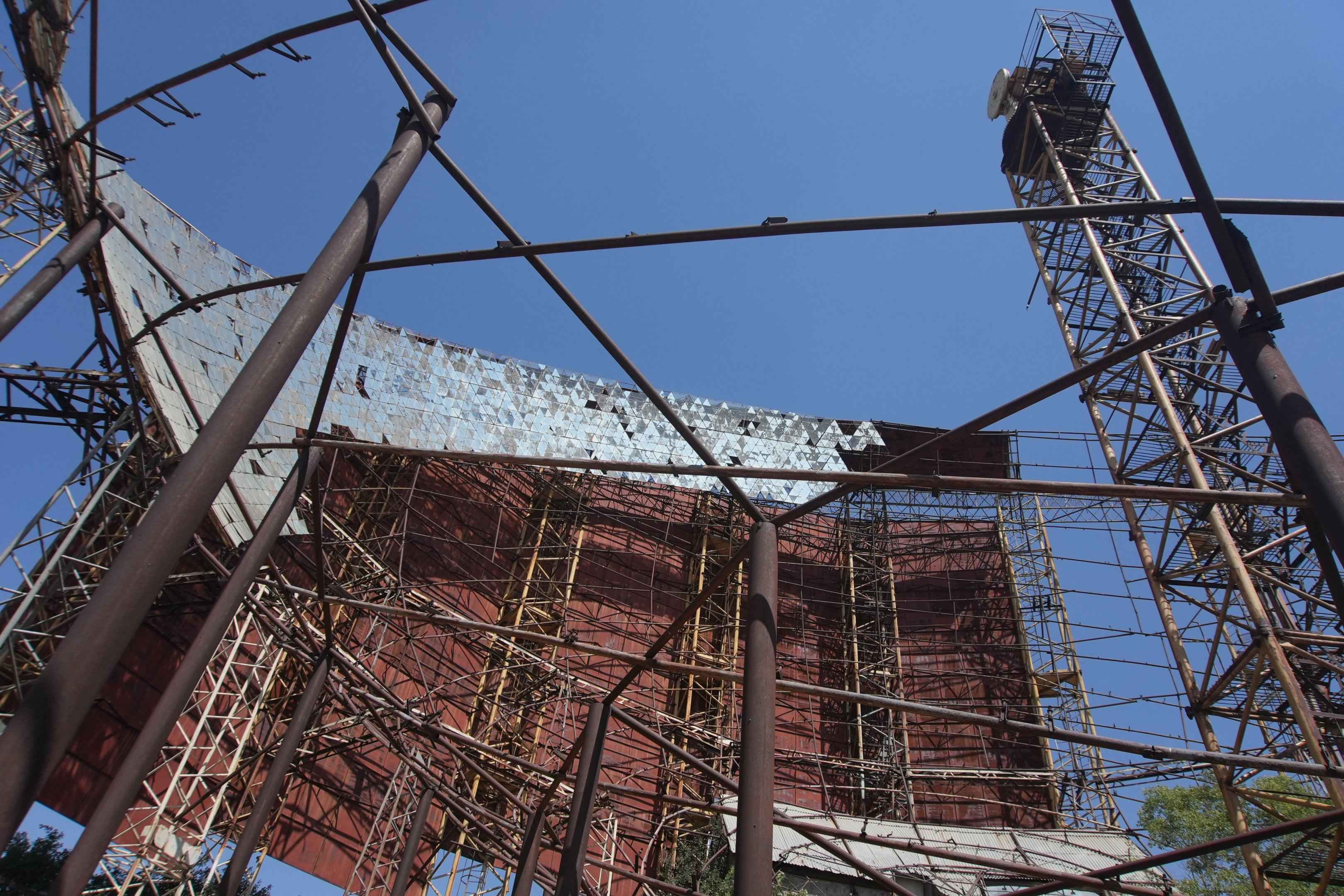 Auf der Rückseite des großen Spiegelteleskops entdeckte ich ein überraschendes Detail: Über die gesamte Höhe der Konstruktion zieht sich ein riesiges Wandgemälde. Es zeigt einen blauen Adler auf blau-weißem Hintergrund, der über Wolken hinwegfliegt. Das monumentale Kunstwerk wirkt fast surreal an dieser verlassenen technischen Anlage.