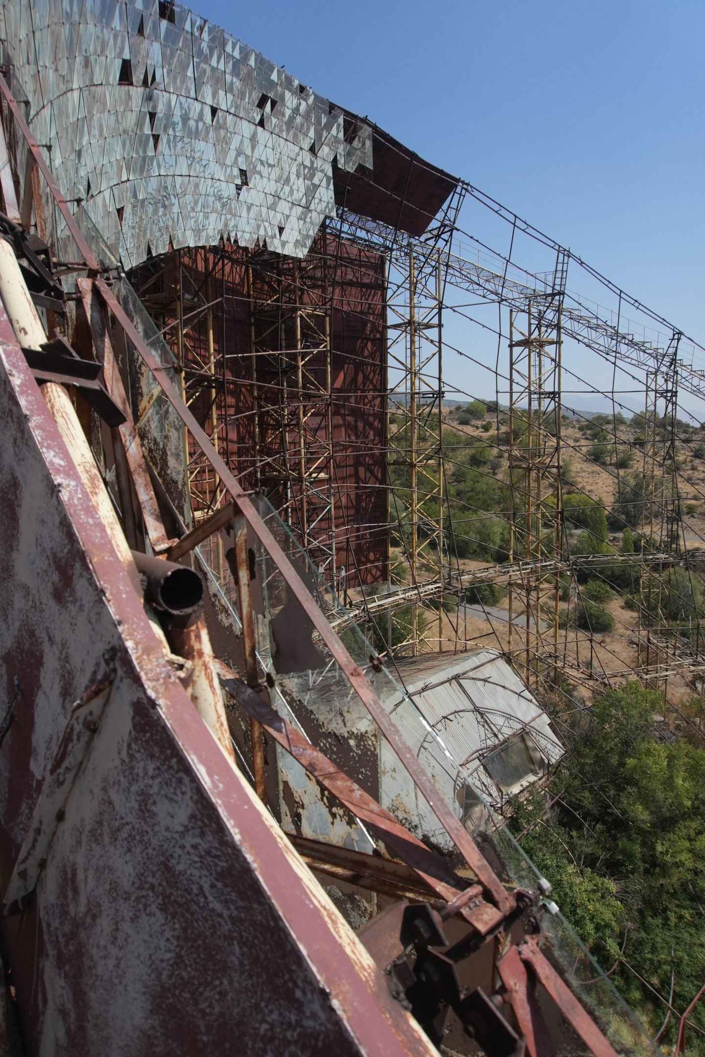 Ich lief anschließend unter der riesigen Metallkonstruktion hindurch. Erst aus dieser Perspektive bekommt man ein Gefühl für die Größe des Teleskops – auf Fotos lässt sich das kaum richtig einfangen. Eine schmale Treppe führte nach oben, und ich begann vorsichtig hinaufzuklettern. Die Metallkonstruktion war stellenweise etwas wacklig und stark rostig, außerdem fehlten einzelne Stufen, sodass man sehr aufmerksam gehen musste. Von oben bot sich schließlich ein beeindruckender Blick über das gesamte Tal und die umliegende Landschaft.