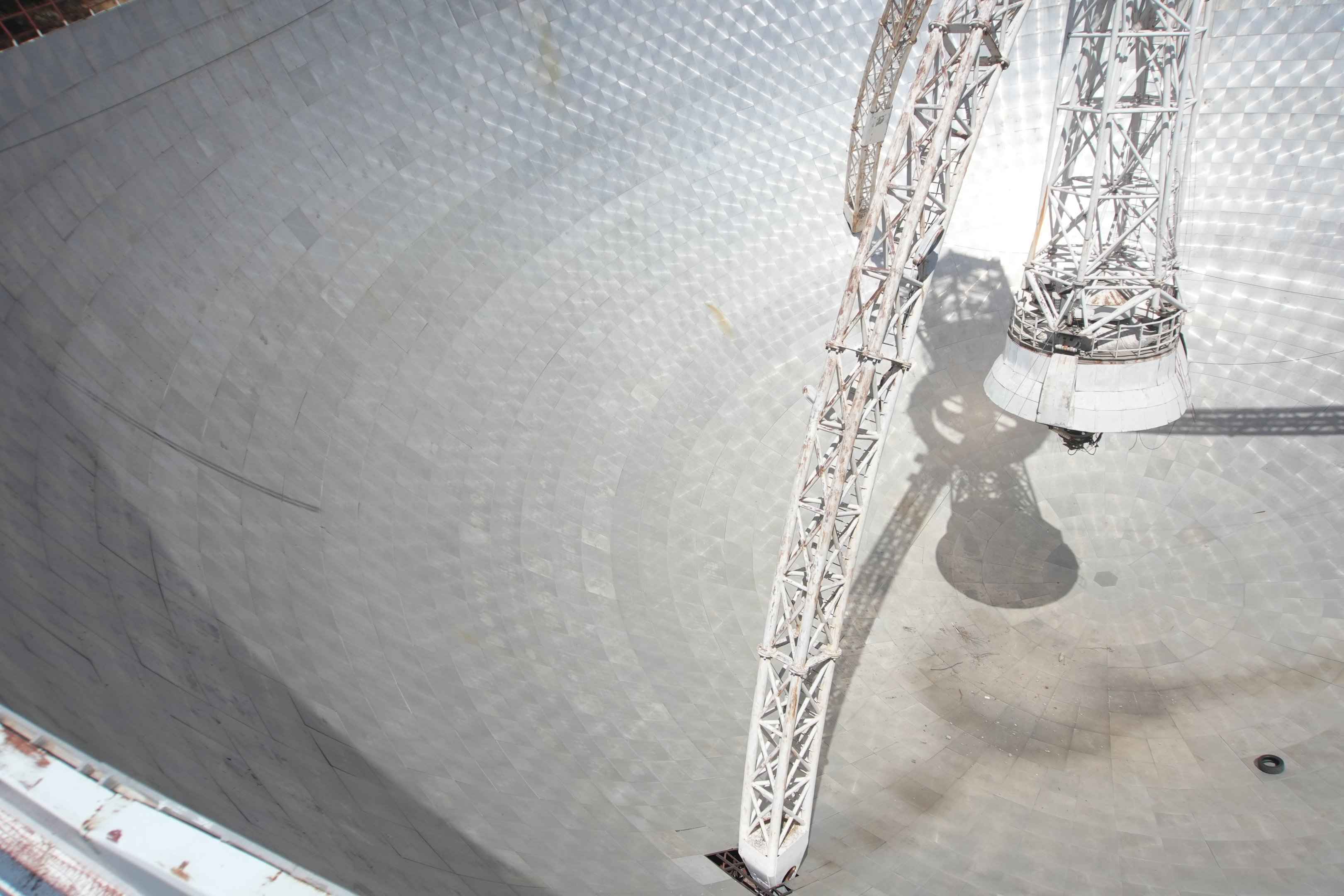 Die riesige Schüssel ist in den Boden eingelassen und lässt sich daher nicht drehen. Stattdessen ist sie fest ausgerichtet. Ihre Dimensionen sind so gewaltig, dass man selbst aus kurzer Entfernung Schwierigkeiten hat, das gesamte Bauwerk auf ein Foto zu bekommen. Besonders eindrucksvoll ist der Blick direkt in die Schüssel: Sie fällt steil nach unten ab, und das Metall glänzt noch immer im Licht.